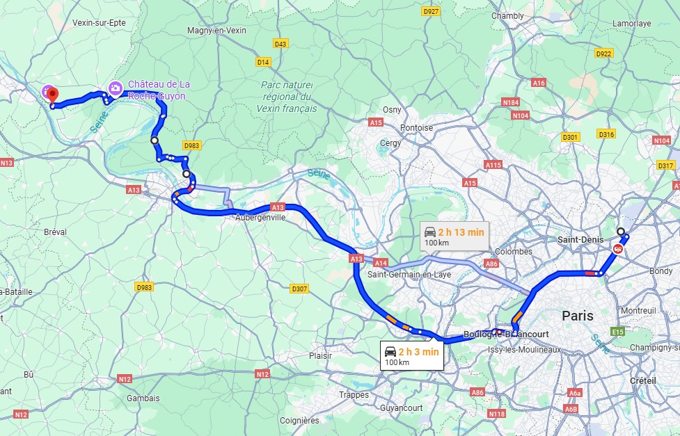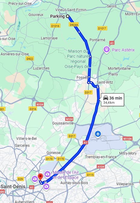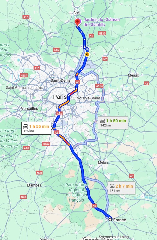 Nous partons de Nemours en direction de Chantilly que nous atteindrons avant midi. Après un rapide déjeuner, nous irons visiter le château de Chantilly et nous terminerons par les écuries. Nous stationnons sur le parking N°2 en face des écuries et du château, un endroit très agréable. (coordonnées : 49.19056, 2.482426)