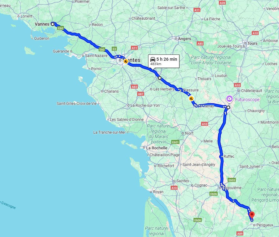 Ce soir nous serons à Vannes, chez nous! Mais auparavant, nous irons faire un tour à Laval où nous avons habité et travaillé de 1970 à 1975. Nous ne reconnaîtrons pas la ville, surtout le quartier de la gare où nous habitions au quatrième étage d'un immeuble, 6 rue Auguste Beuneux, qui a complètement changé de look. Evelyne travaillait au 4 de la rue de la gare dans le même immeuble. Nous avons fait quelques photos en passant. Nous sommes parvenus au bout de ce périple vers 16h00, comme toujours heureux de retrouver nos pénates et de commencer à préparer notre futur voyage.