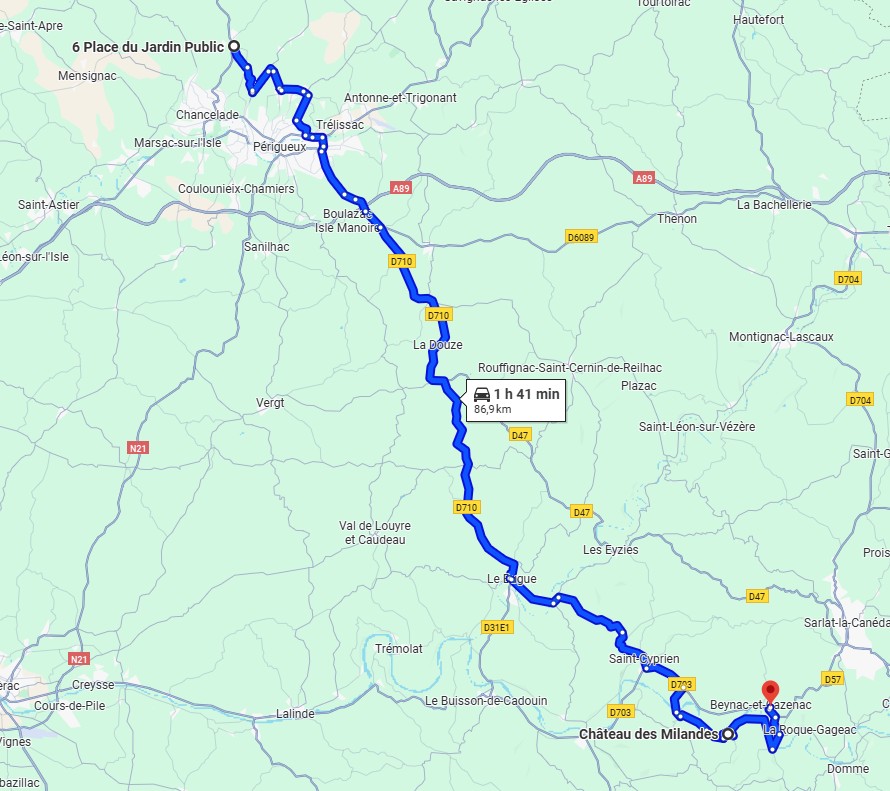Nous décarrons à 8h30 et arriverons au château des Milandes à 11h45. Nous déjeunons dans le camping-car à midi pour être à l'entrée à 13h00.
