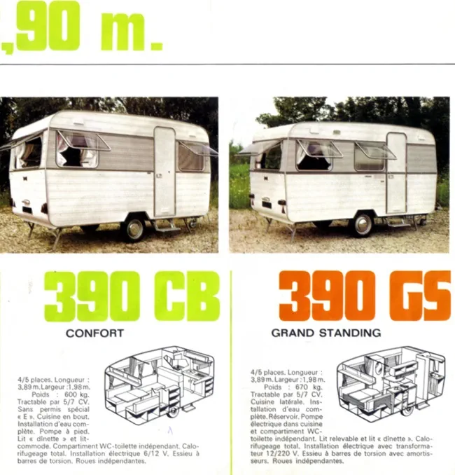 Nous nous sommes mariés en 1971 et en 1973, nous achetions notre première et seule caravane. C'était une digue 390 CB. 390, c'est la longueur 3,90 mètres et CB comme cuisine en bout. Cette caravane avait le lit double qui s'abaissait pour la nuit. Avec elle nous avons sillonné la France, mais aussi l'Italie et l'Espagne. Nous l'avons revendu en 1990 pour acheter notre premier camping-car Chausson.