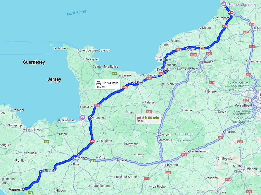 La route depuis Vannes jusqu'à Caen en passant par Rennes, est une 2 X 2 voies et nous pouvons rouler à une bonne moyenne, le but étant de rejoindre nos amis, les "Christiane et pierrot" partis la veille de Nantes. Ils sont déjà arrivés après Caen et continuent tranquillement leur périple vers l'est. Nous apprendrons dans la journée qu'ils sont à le Crotoy, dans la Somme. ce sera donc le but de notre route pour aujourd'hui.