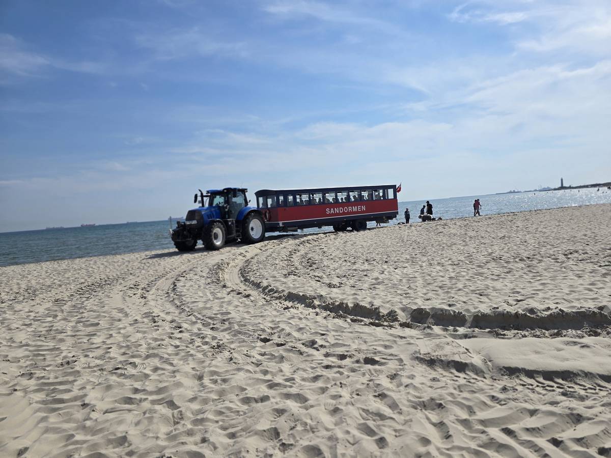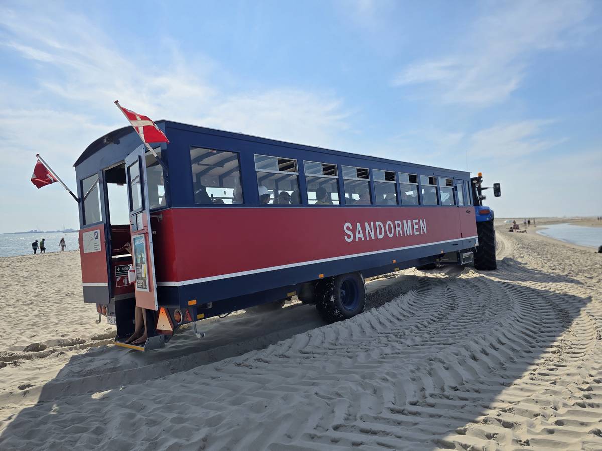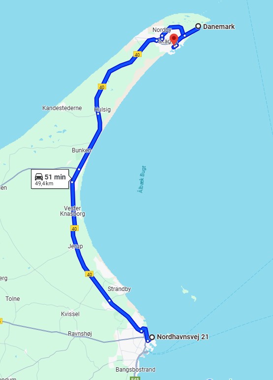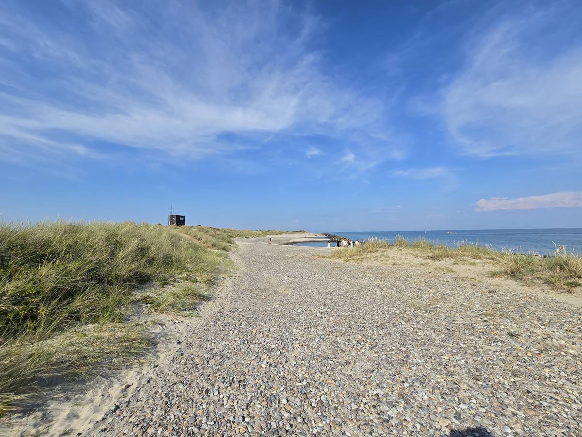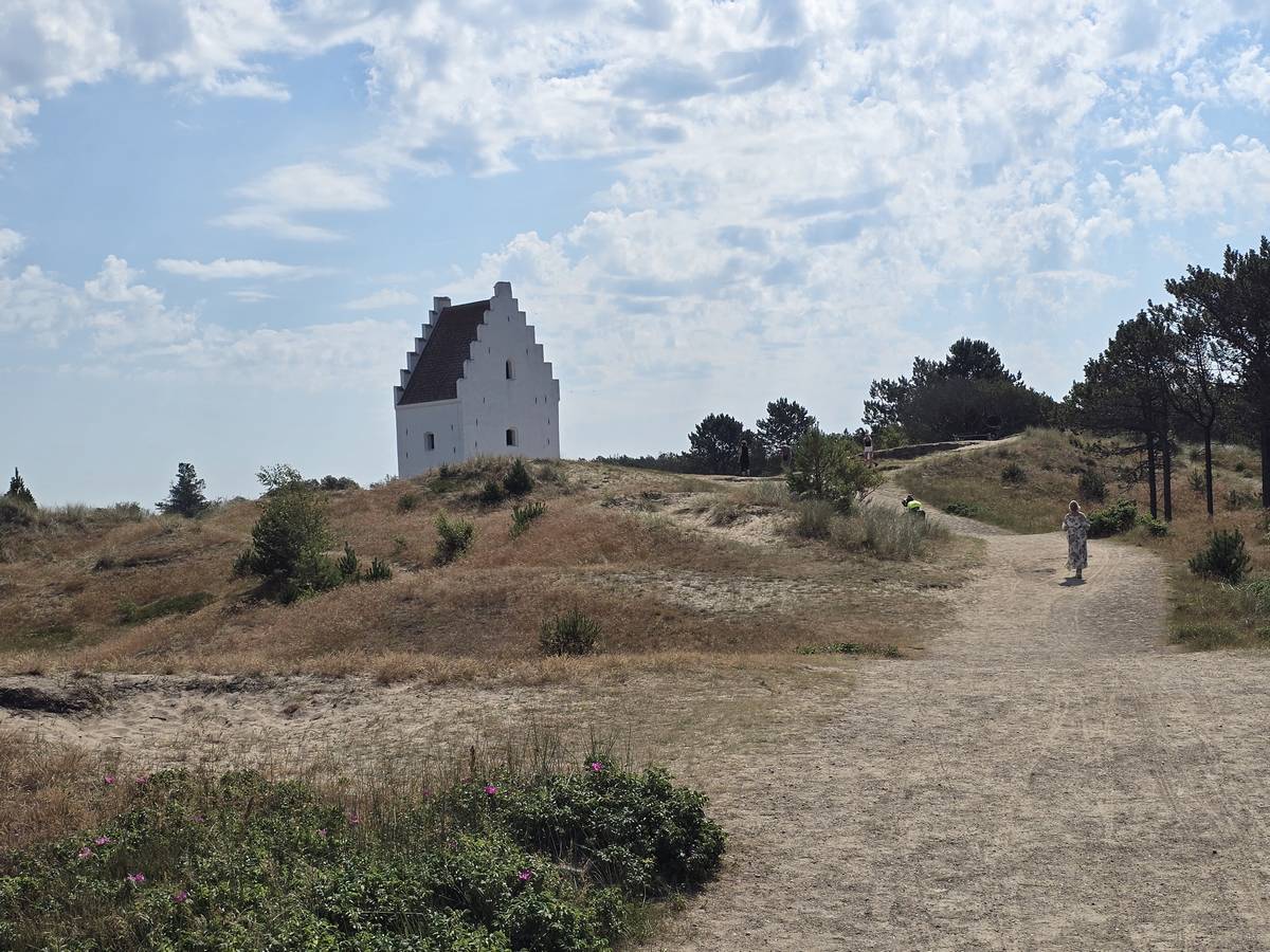Nous avons fini notre nuit sur ce parking de Frederikshavn, il est 9h00 losque nous ouvrons les yeux. Il fait un temps splendide, nous aurons 27° dans la journée... et ce fut une belle journée, vous en jugerez vous-même. En effet, tout d'abord, sur la route de Skagen, nous nous arrêtons à l'église ensablée. Nous irons faire une balade, monter dans le clocher et enfin, nous déjeunerons sur le parking. Puis nous nous dirigeons au delà de Skagen, sur le parking de Grenen. Grenen, c'est la pointe septentrionnale du Danemark, là où la mer du nord rejoint la mer Baltique sans se mélanger... c'est impressionnant. Sur les photos, on distingue le sillon séparant les deux mers. Il est à noter que la mer Baltique est plus chaude que la mer du Nord... étonnant non!!! Pour aller du parking où nous avons garé le camping-car, et cette point nord, nous empruntons un tracteur (dont le pilote est Laetitia Halliday!!! enfin, son sosie...) traînant une remorque-car (voir photos), sympa et, surtout pour nous, les ancêtres, ça nous évite de nous tuer à la marche dans le sable!!! Ensuite, petite marche jusqu'au phare et retour. Enfin, nous nous rendons à Skagen où nous dormirons sur le port après avoir fait une dernière balade dans les rues piétonnes. (coordonnées : 57.719238, 10.589801)