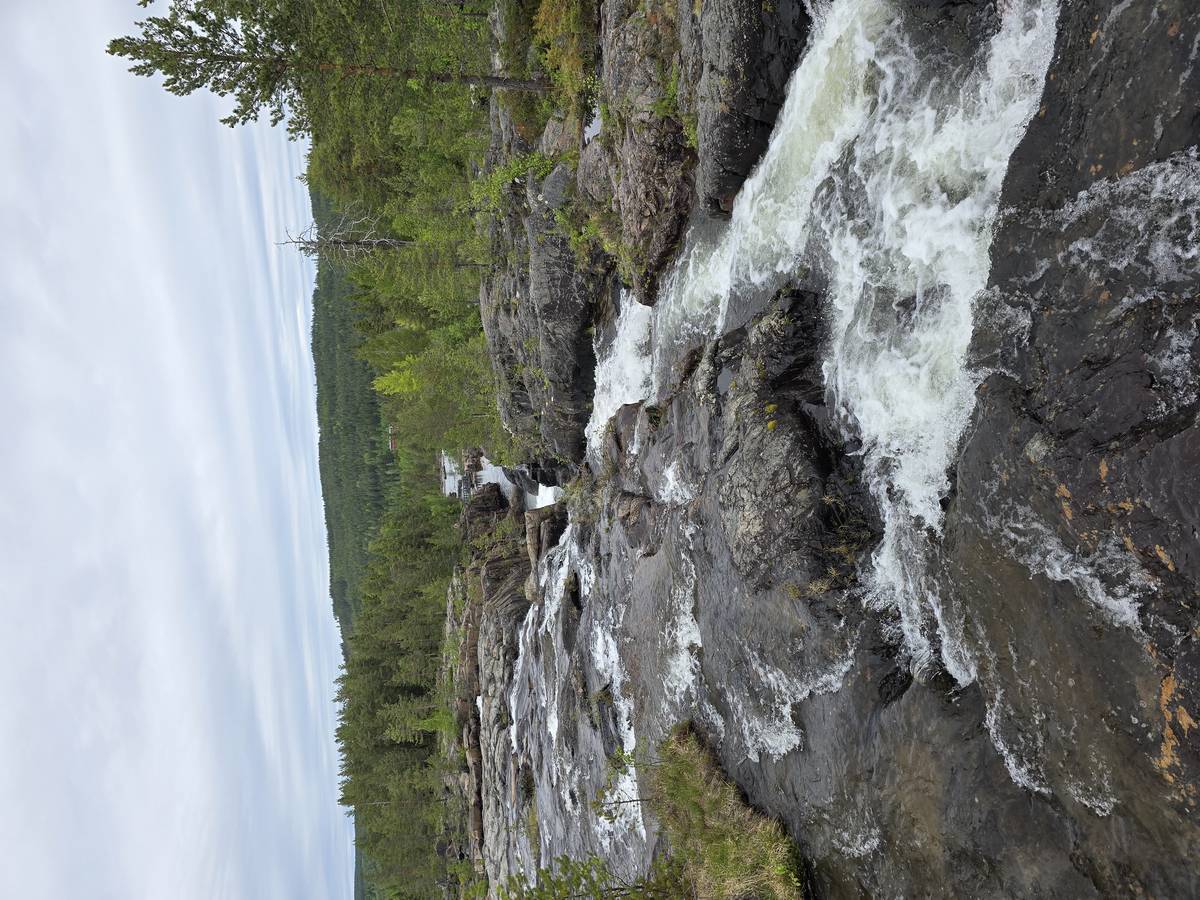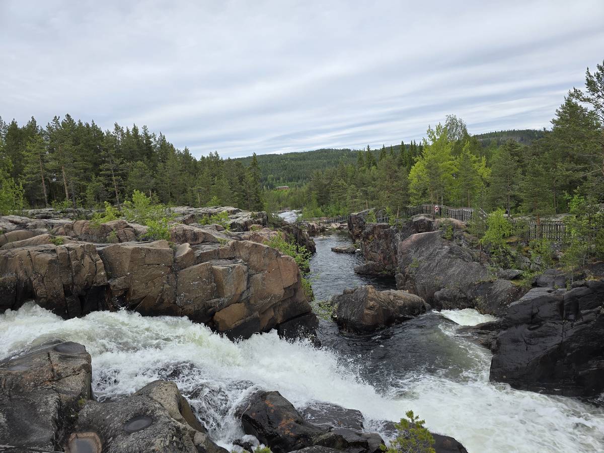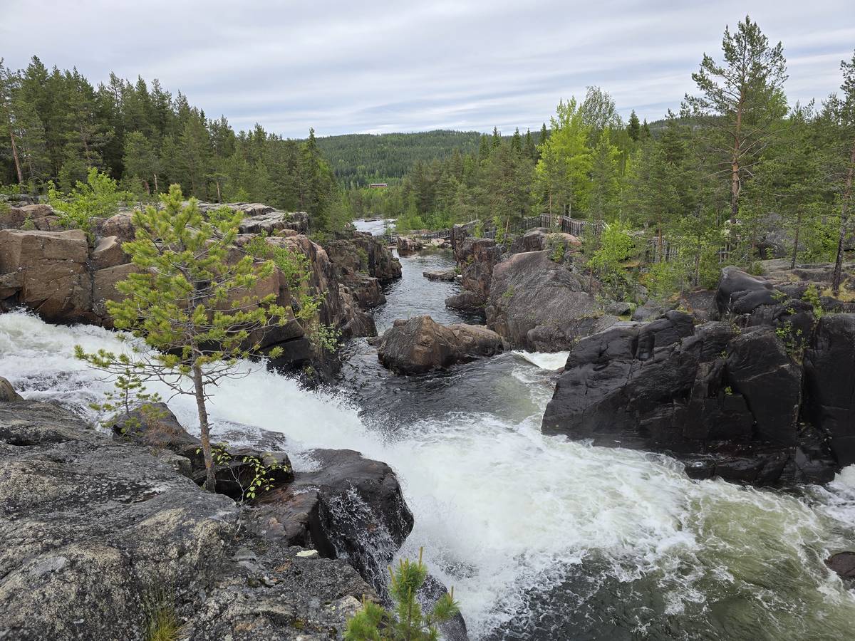 Nous arrivons avant Les chutes de Storforsen et nous faisons quelques photos de loin. Ensuite, nous montons et stationnons sur le parking à l'entrée. Nous y déjeunerons. Les chutes sont impressionnantes et rugissent à nos pieds...