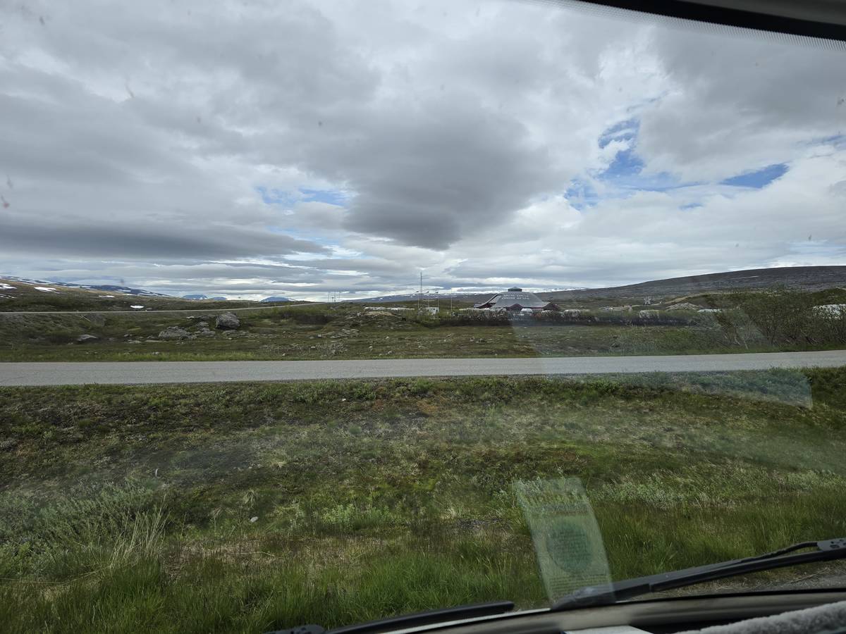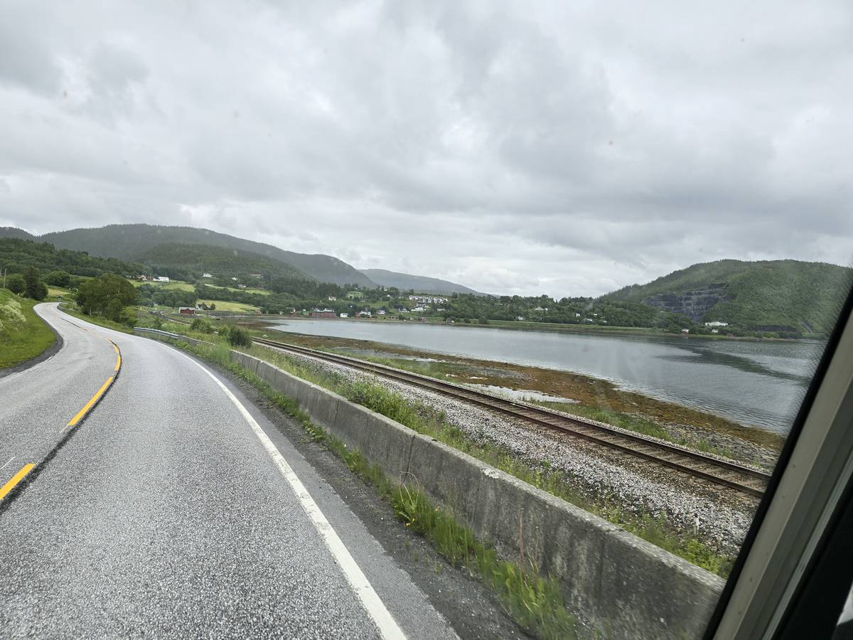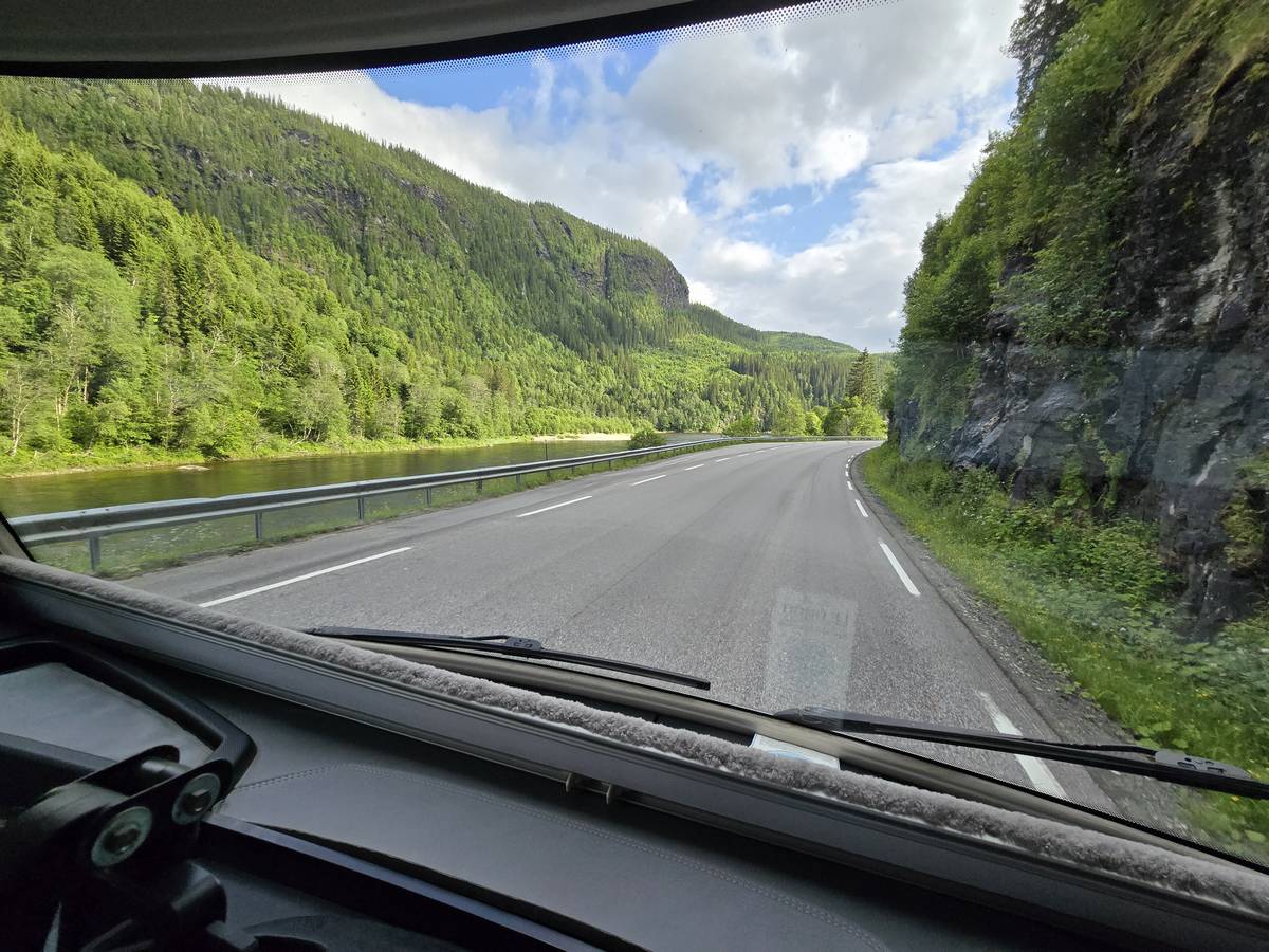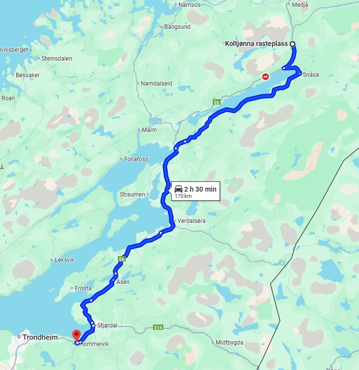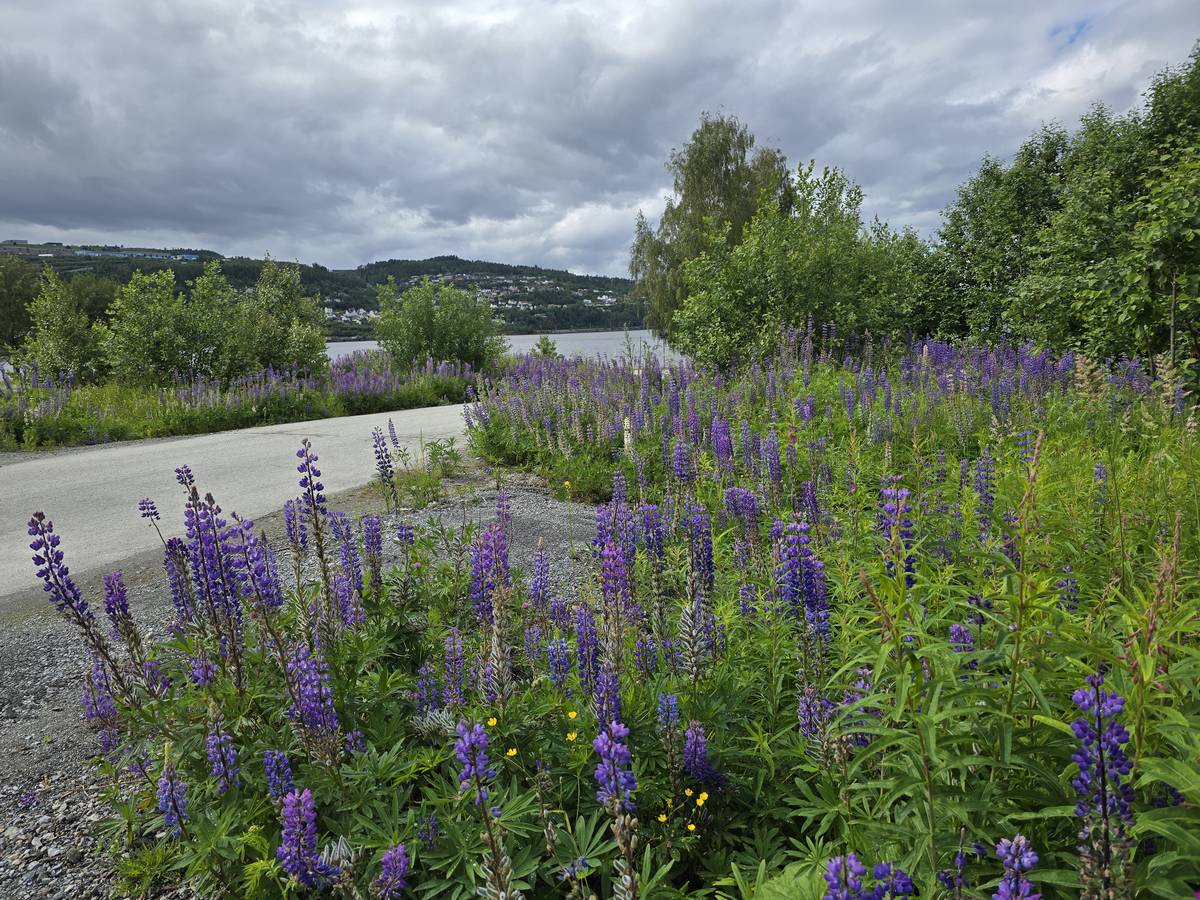 Après une mauvaise nuit sur ce parking, due à un camion frigorifique qui a tourné toute la nuit, nous prenons la route de Trondheim. nous ferons une étape à Mallvik, quelques kilomètres avant Trondheim, dans un parterre de lupins. (Coordonnées : 63.41267, 10.7977)