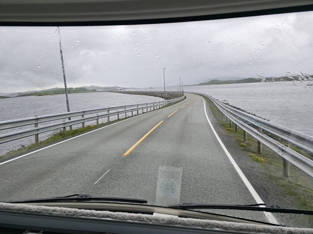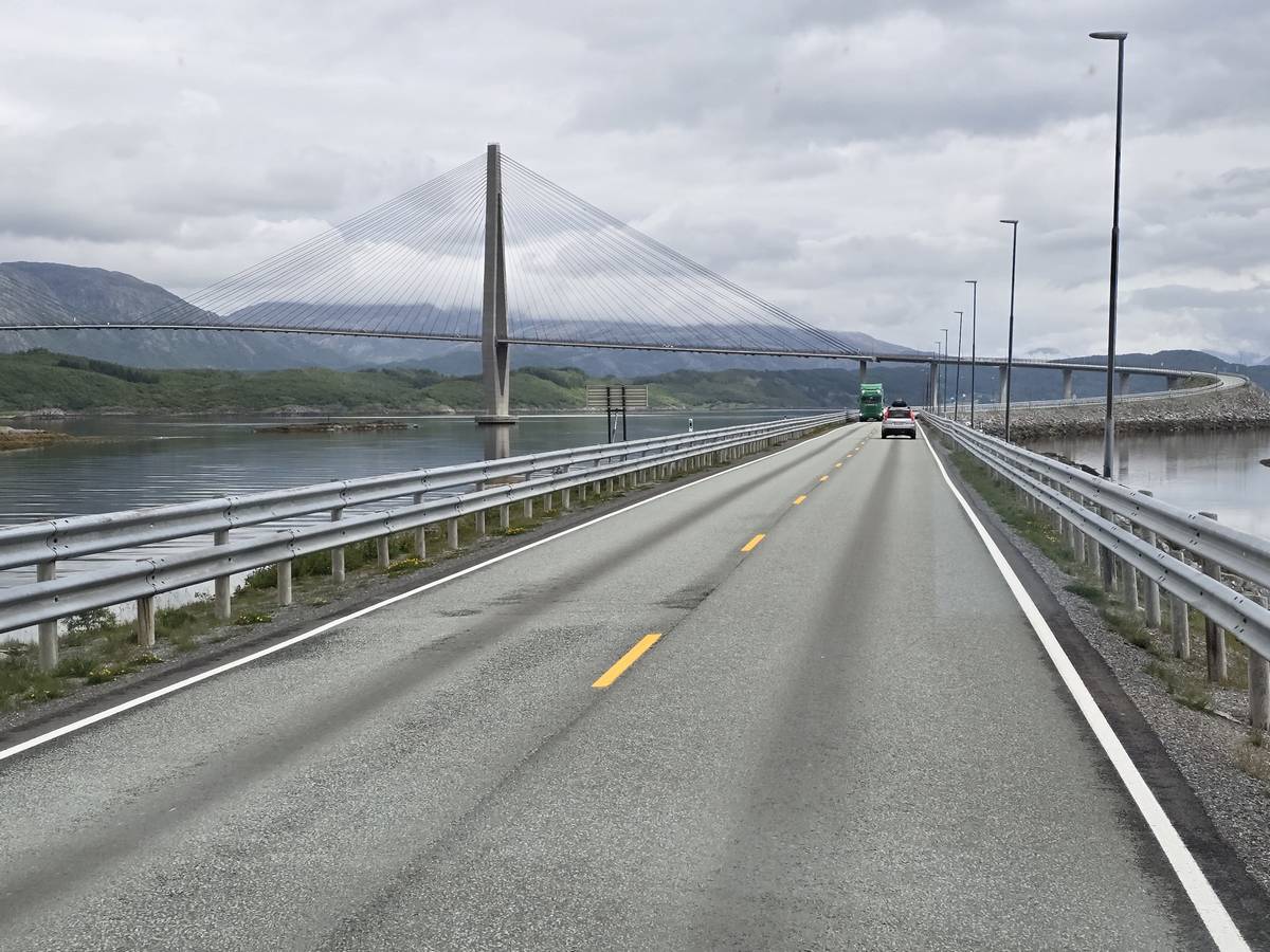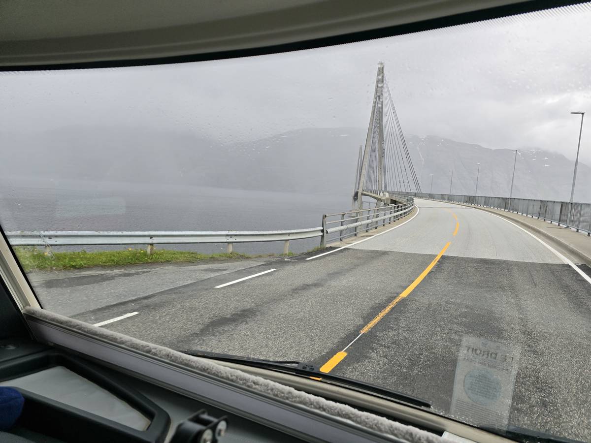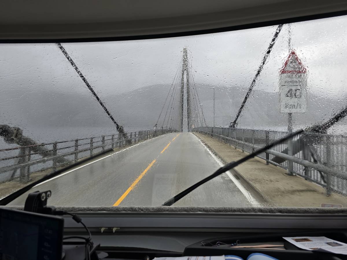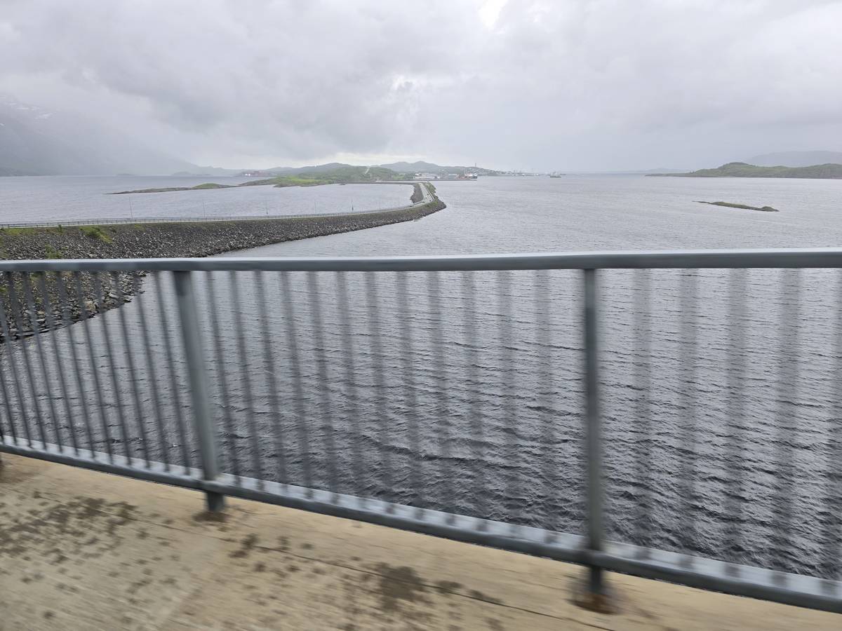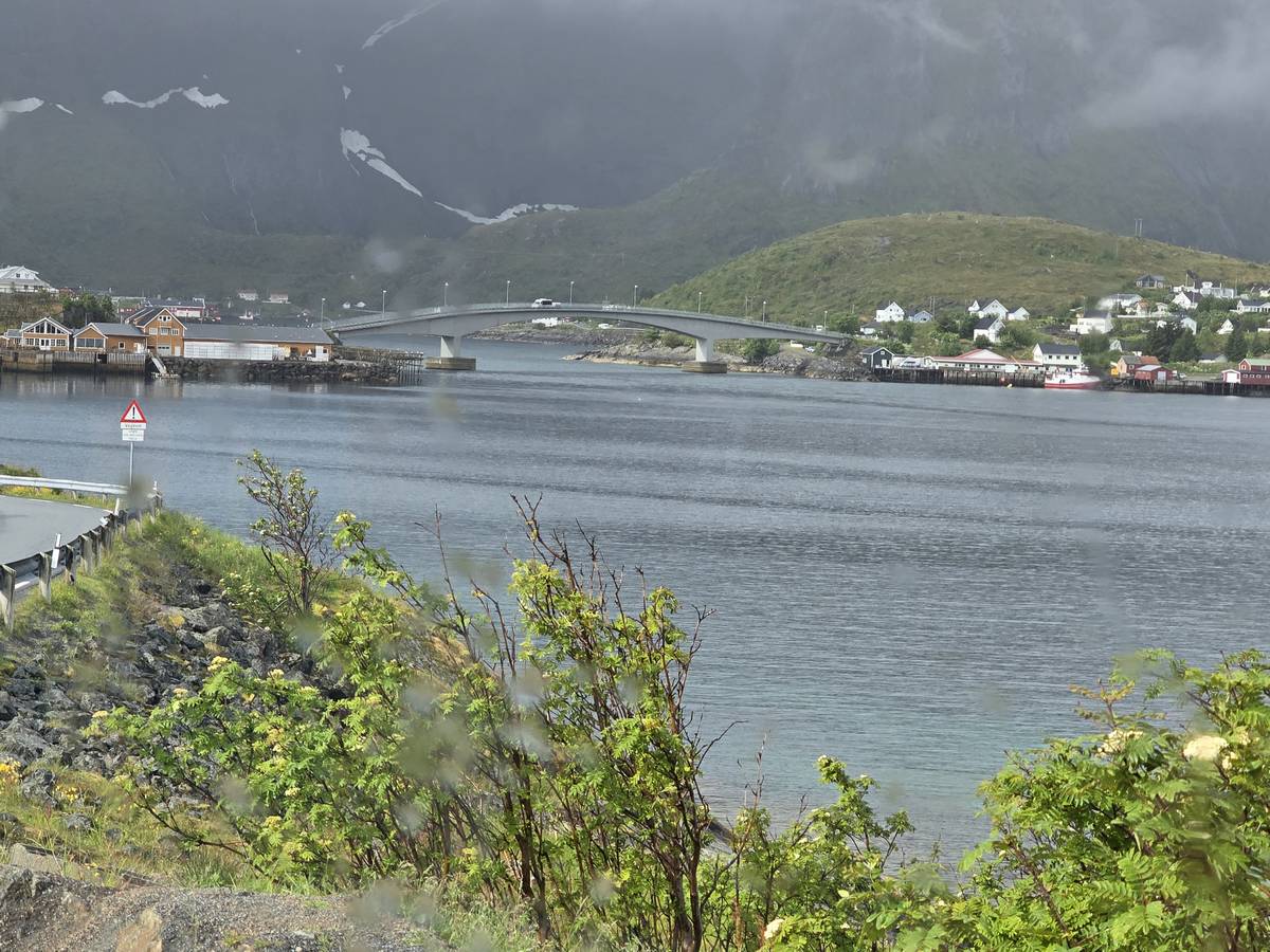 Un long pont reliant 2 îles sur la route après Mo I Rana.Il pleuvait à grosses gouttes comme les photos en témoignent!