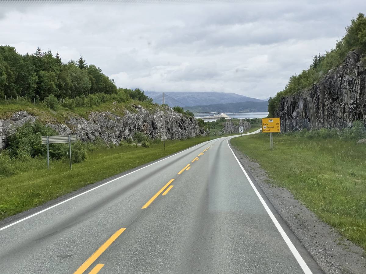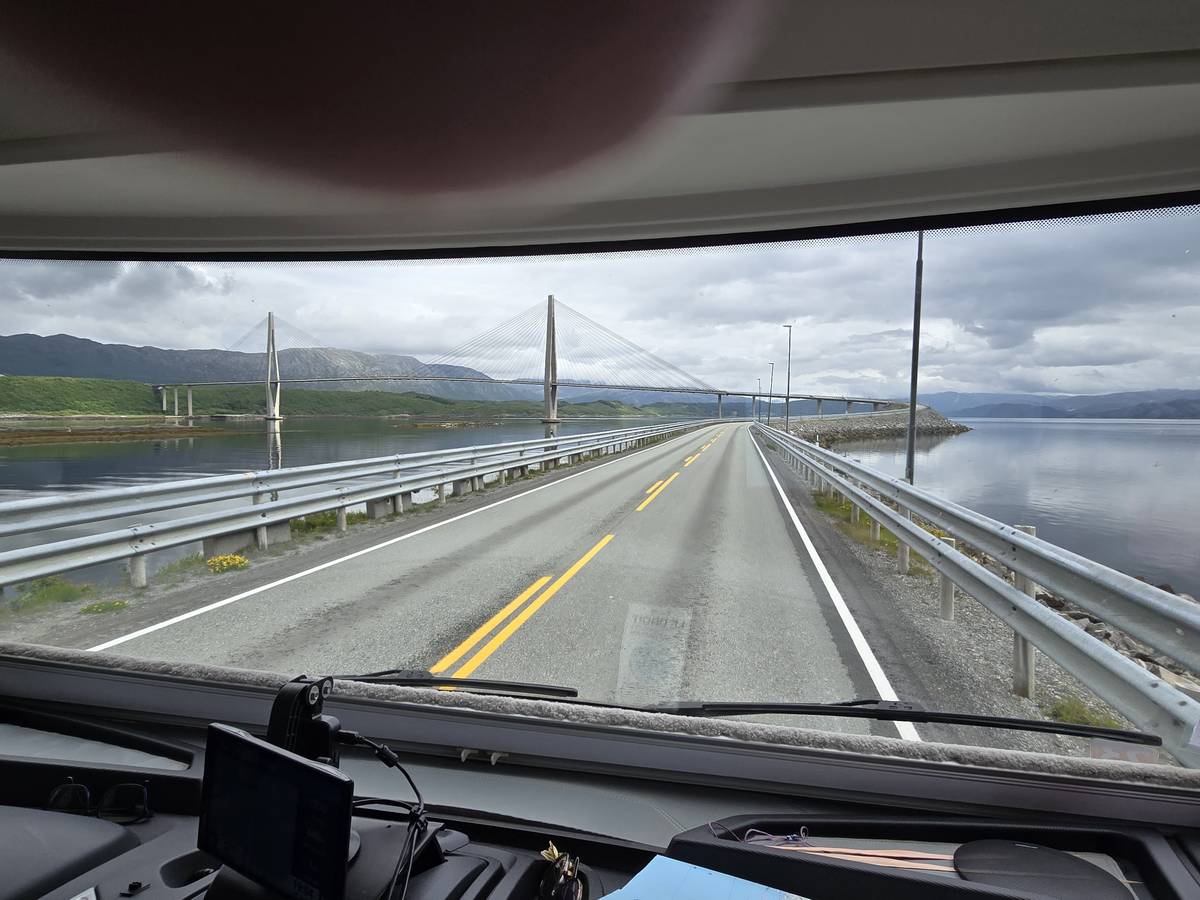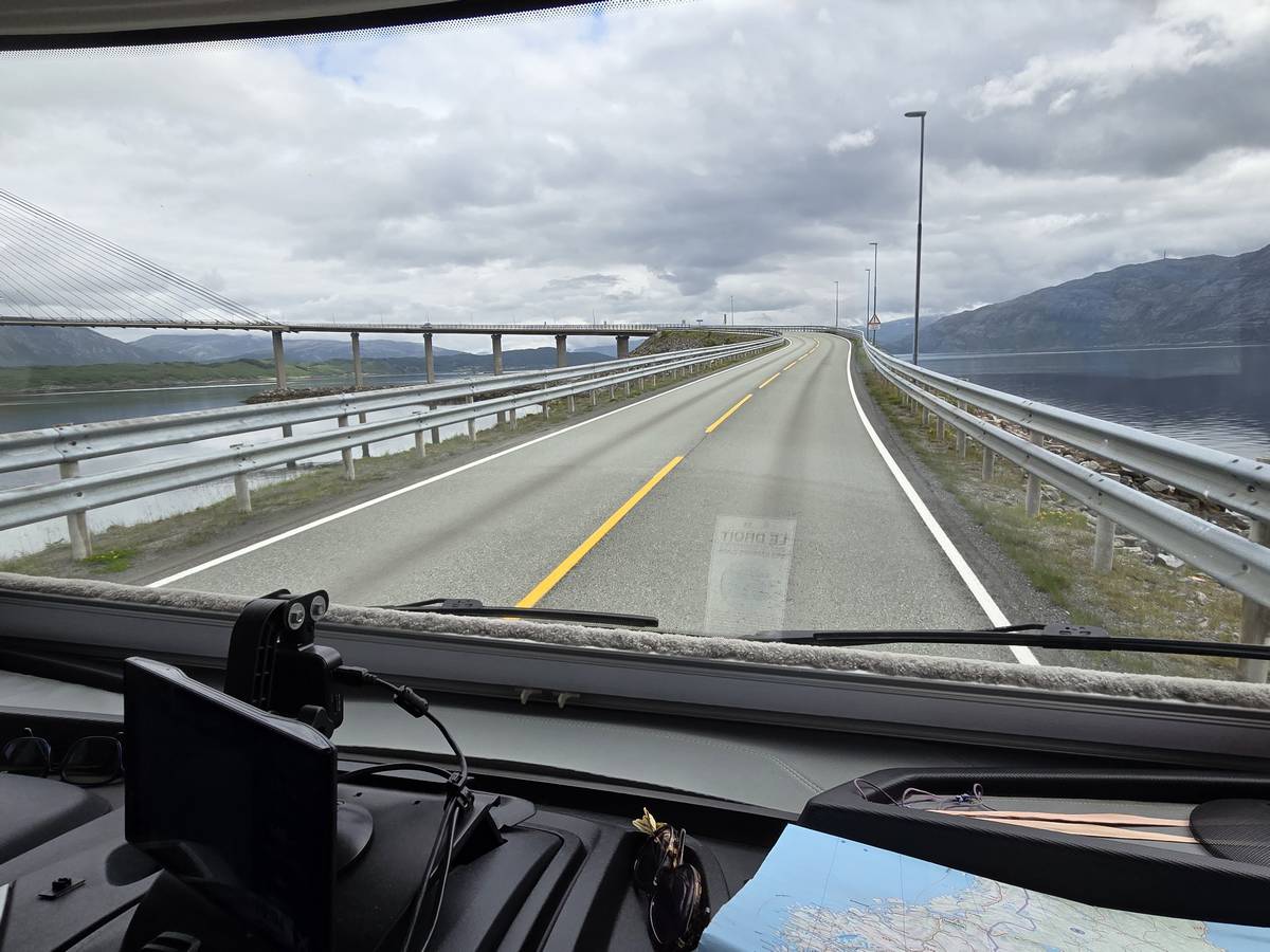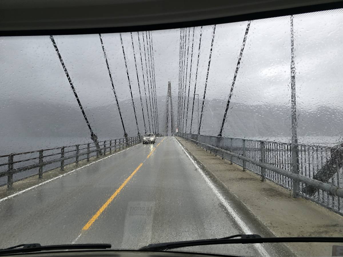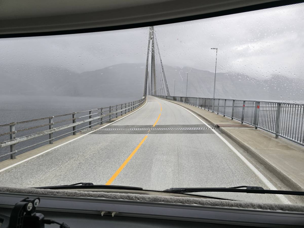 Un long pont reliant 2 îles sur la route après Mo I Rana.Il pleuvait à grosses gouttes comme les photos en témoignent!
