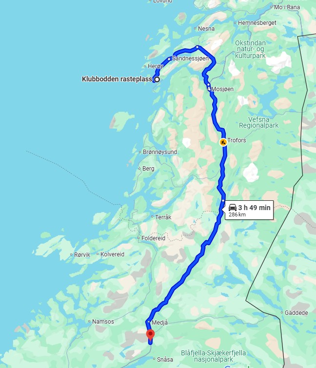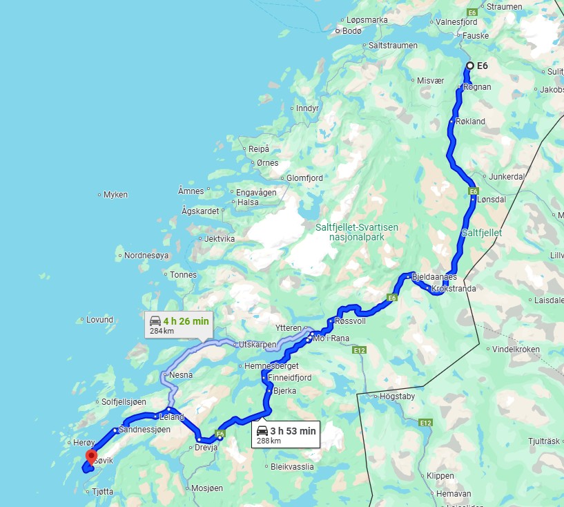 Nous passerons de nouveau et dans le sens retour le cercle polaire arctiqueFylkesves (Coordonnées : 65.896896, 12.4528)