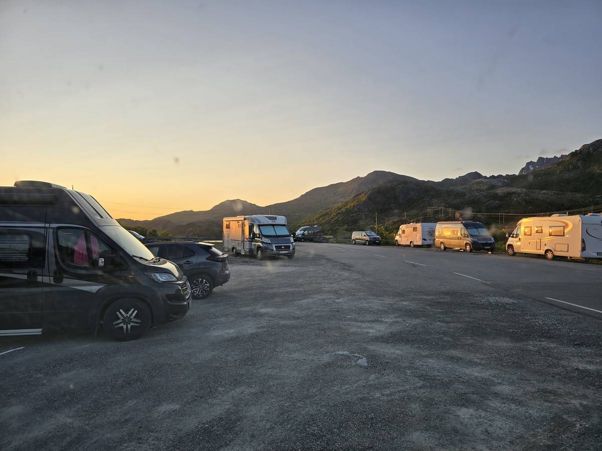 Dans les Lofoten, il n'y a pas de pompe GPL, or, la bombonne était presque vide. Aussi dès que je suis arrivé sur le continent à Bodo, je me suis dirigé sur la seule pompe dans le secteur qui se trouve à 20 kilomètres sur notre route. Lorsque j'ai branché le pistolet sur le réceptacle du camping-car un gros nuage de GPL a fusé et j'ai eu le haut du pouce brulé. Je ne vous dis pas comment j'ai incendié la pompe?! Eh bien, elle n'a pas répliqué et je n'ai pas réussi à y mettre le feu avec mes propos incendiaires. Nous avons dormi un peu plus loin sur un grand parking entre un camping-car et un camion... bien dormi... la bouteille de GPL pleine.