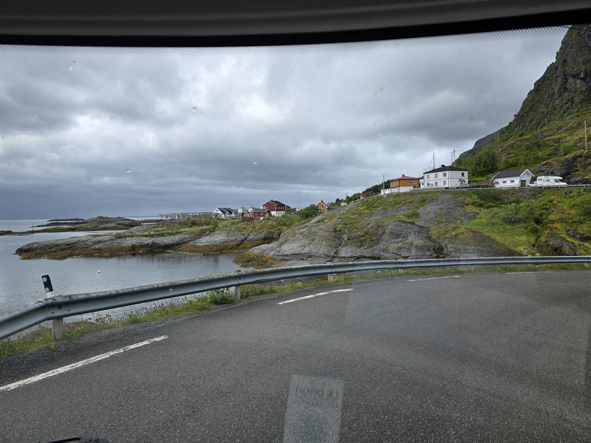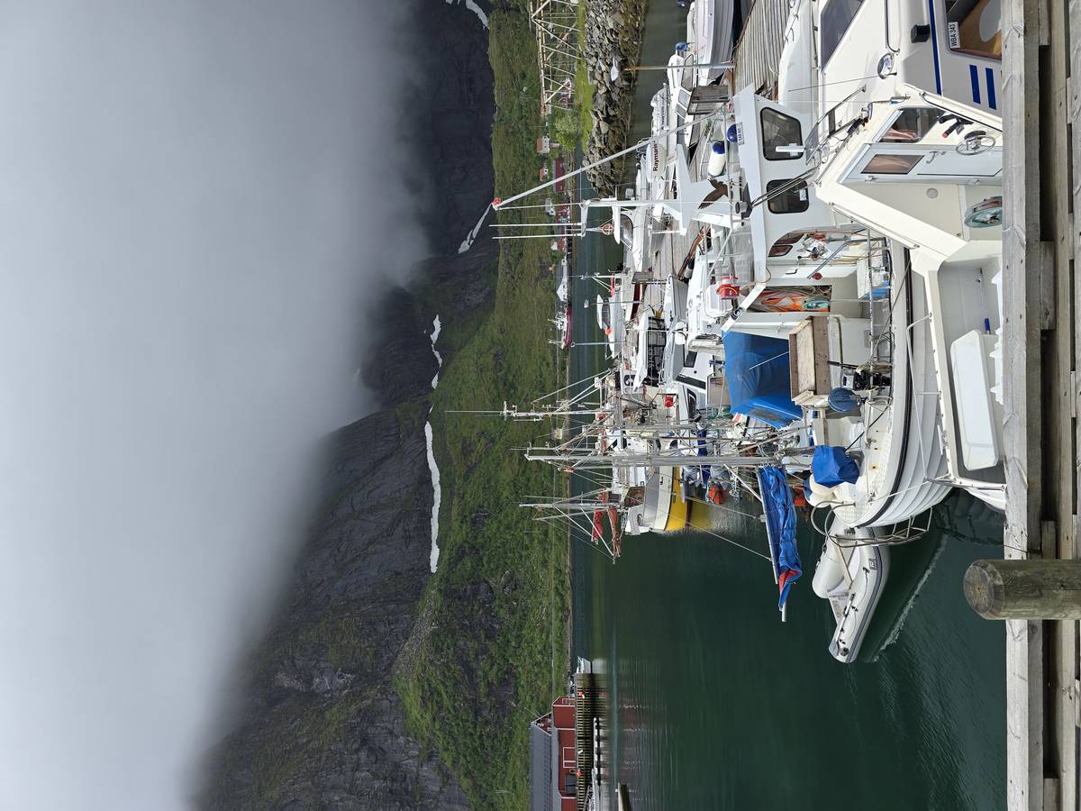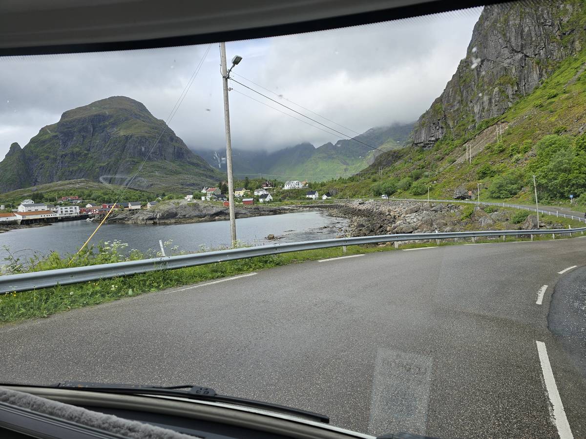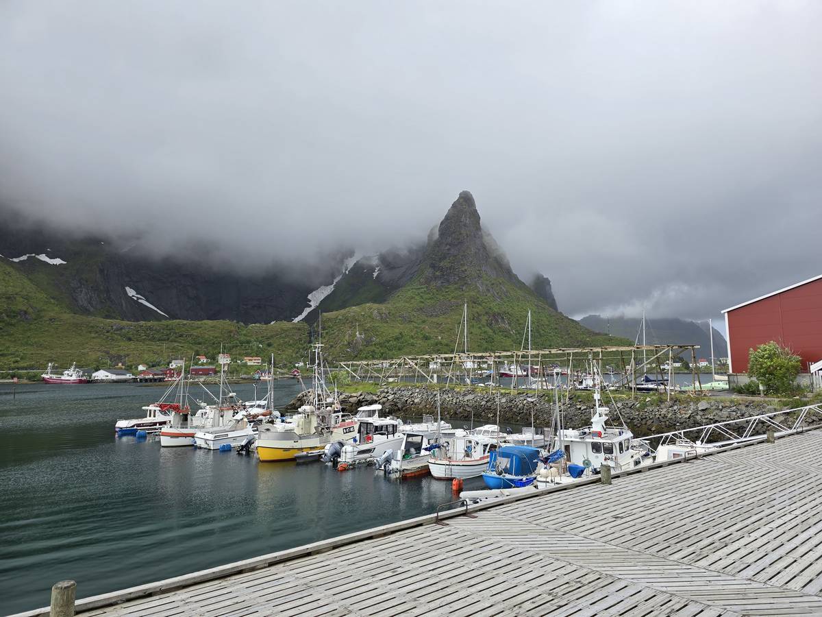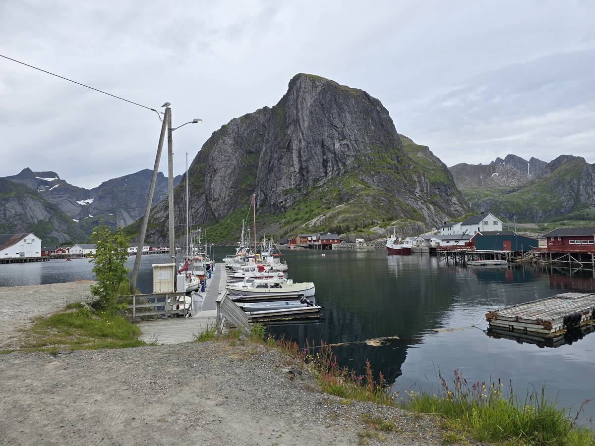 Nous prenons la route pour Reine... donné comme le plus beau village des Lofoten (sans doute à cause de son nom!)!!! Nous sommes très déçus, c'est un petit port classique, c'est tout... Nous dormons tout au fond sur la jetée. Par contre, j'ai pêché sur une des jetées avec un groupe de jeunes allemands, là, ça a donné... Pratiquement tous rejetés, sauf trois lieus jaunes. Ah, oui, pour ne pas changer, il pleuvait, ça romp le charme!!! Reine (Coordonnées : 67.935303, 13.0988)