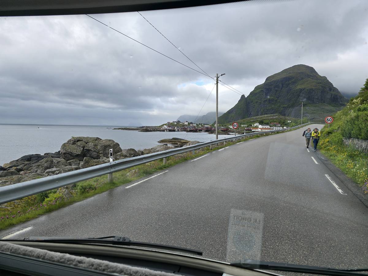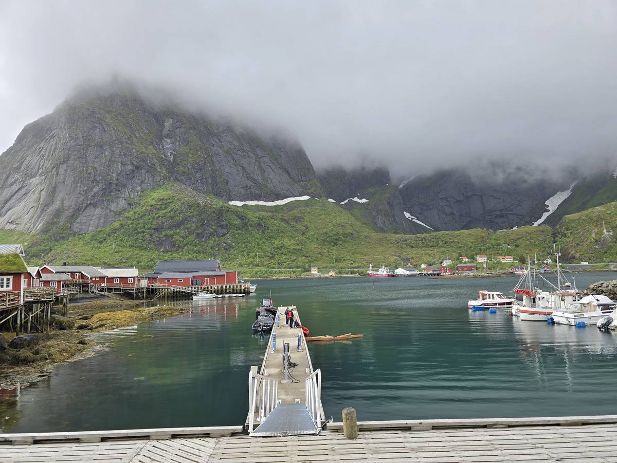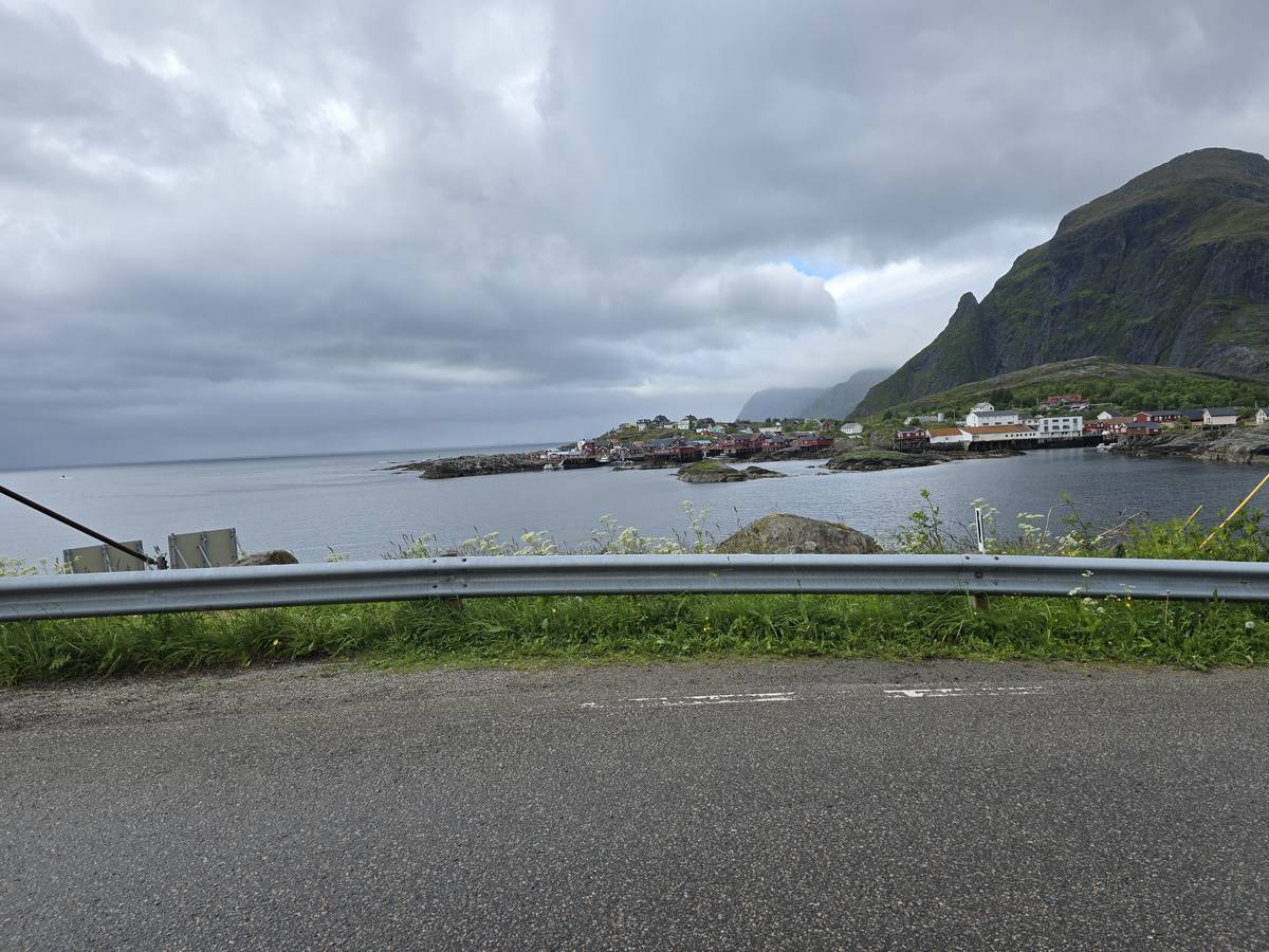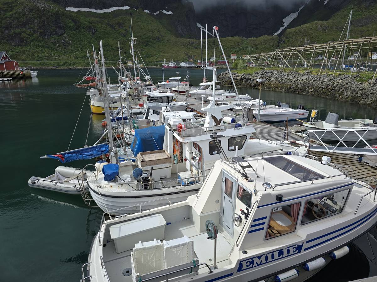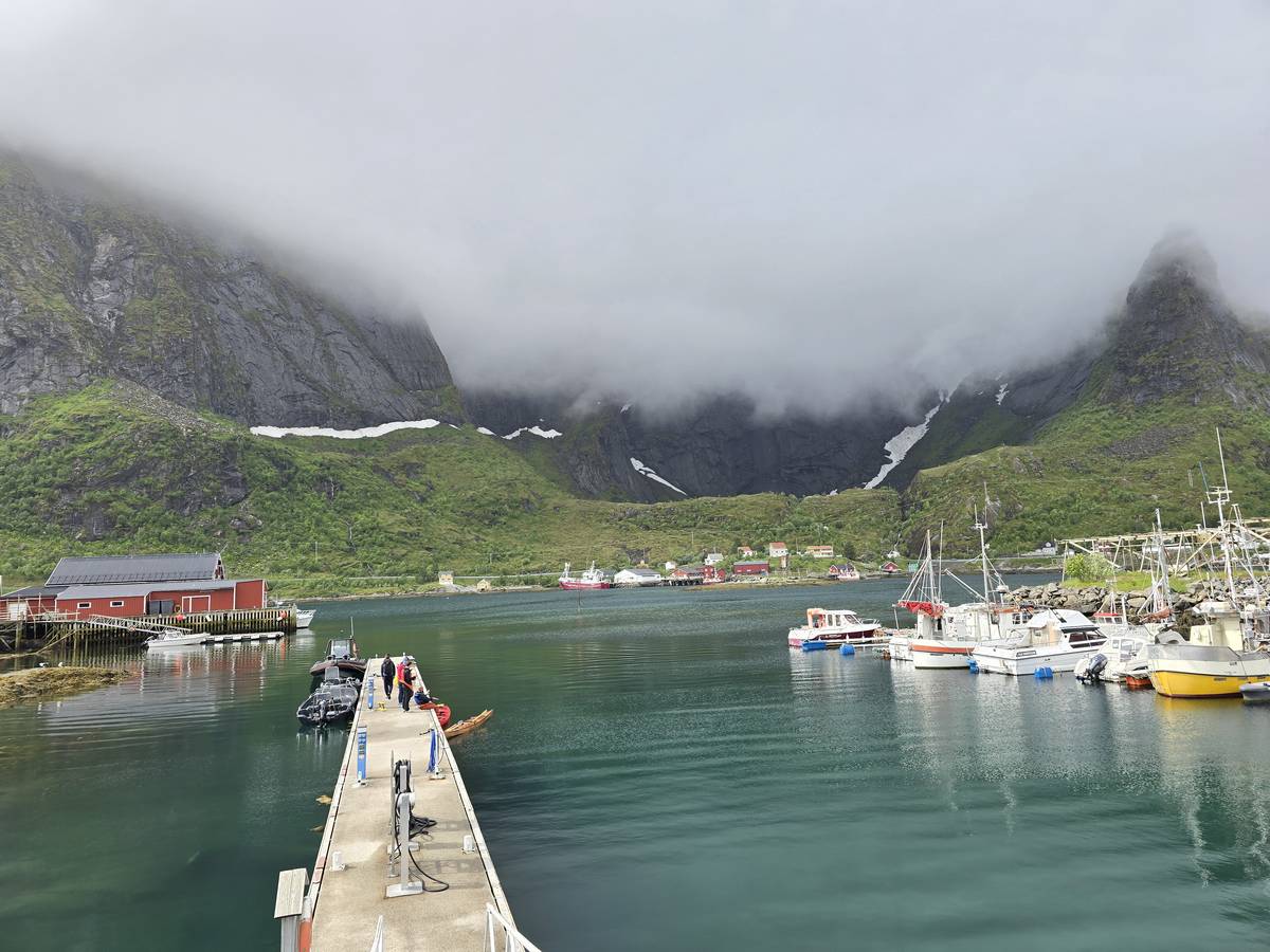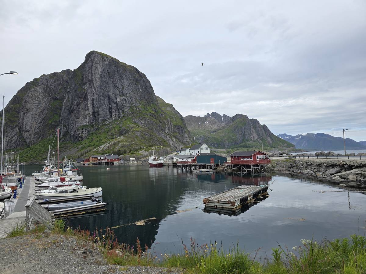 Nous prenons la route pour Reine... donné comme le plus beau village des Lofoten (sans doute à cause de son nom!)!!! Nous sommes très déçus, c'est un petit port classique, c'est tout... Nous dormons tout au fond sur la jetée. Par contre, j'ai pêché sur une des jetées avec un groupe de jeunes allemands, là, ça a donné... Pratiquement tous rejetés, sauf trois lieus jaunes. Ah, oui, pour ne pas changer, il pleuvait, ça romp le charme!!! Reine (Coordonnées : 67.935303, 13.0988)
