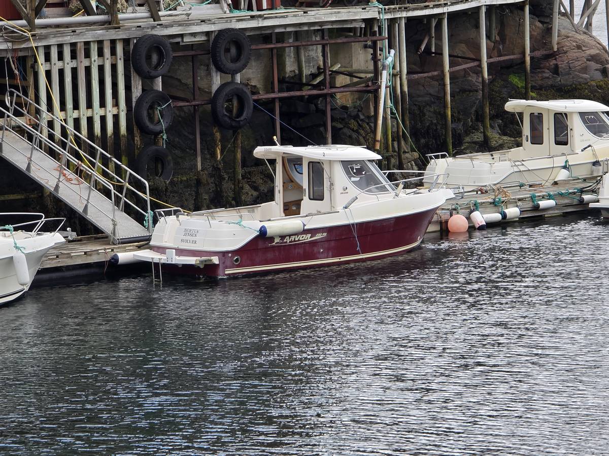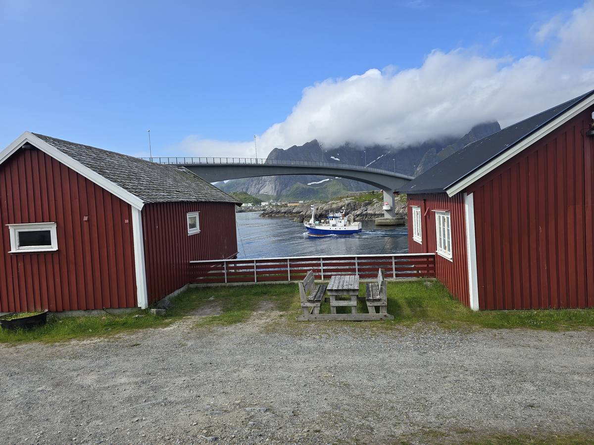 Le lendemain, de nouveau, balade dans Hamnoy. Une seule photo d'un bateau de pêche entre deux rorbuers, prêt à passer sous le pont d'Hamnoy. Nous mangeons le produit de ma pêche, meilleurs que je ne le pensais. Ah, j'ai oublié de vous dire qu'il pleut... mais nous sommes bretons et la pluie ne nous fait pas peur... par contre, le froid...