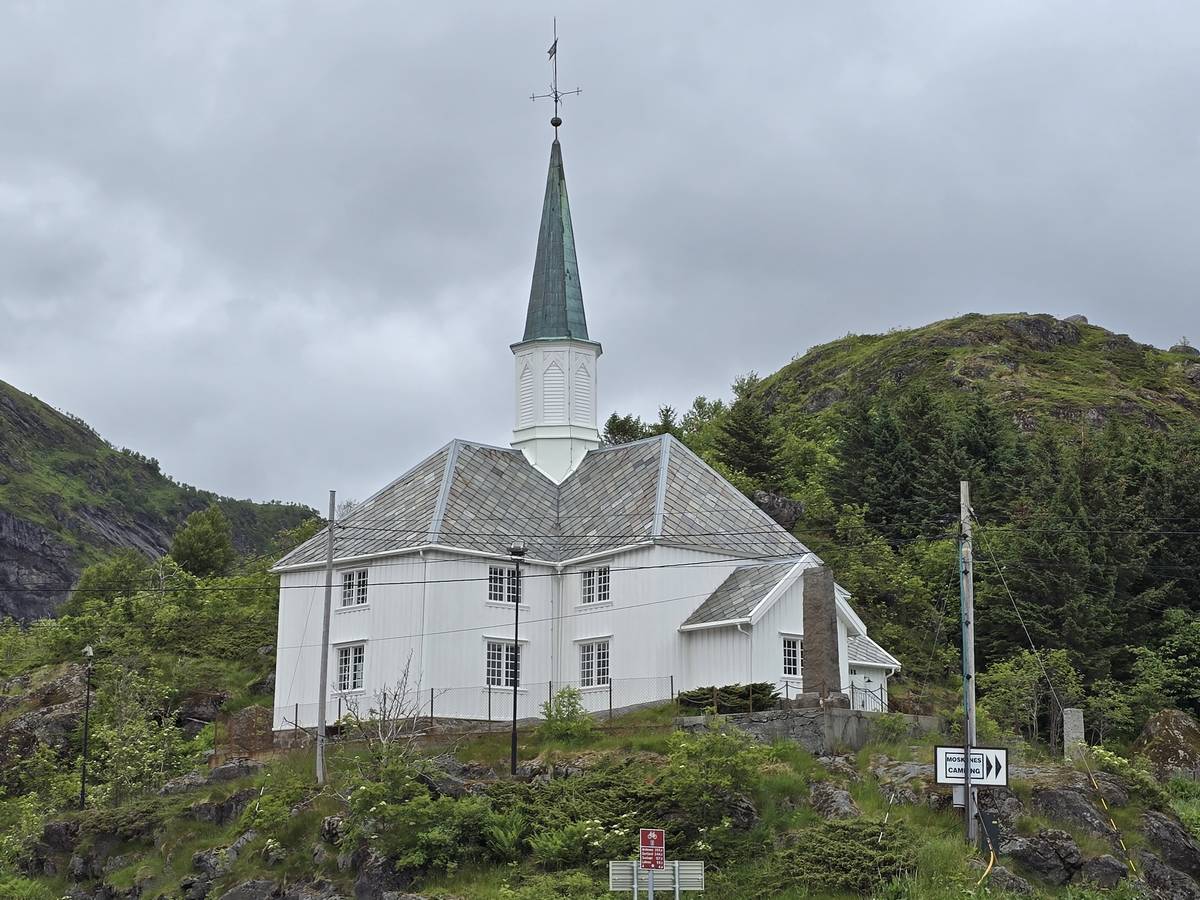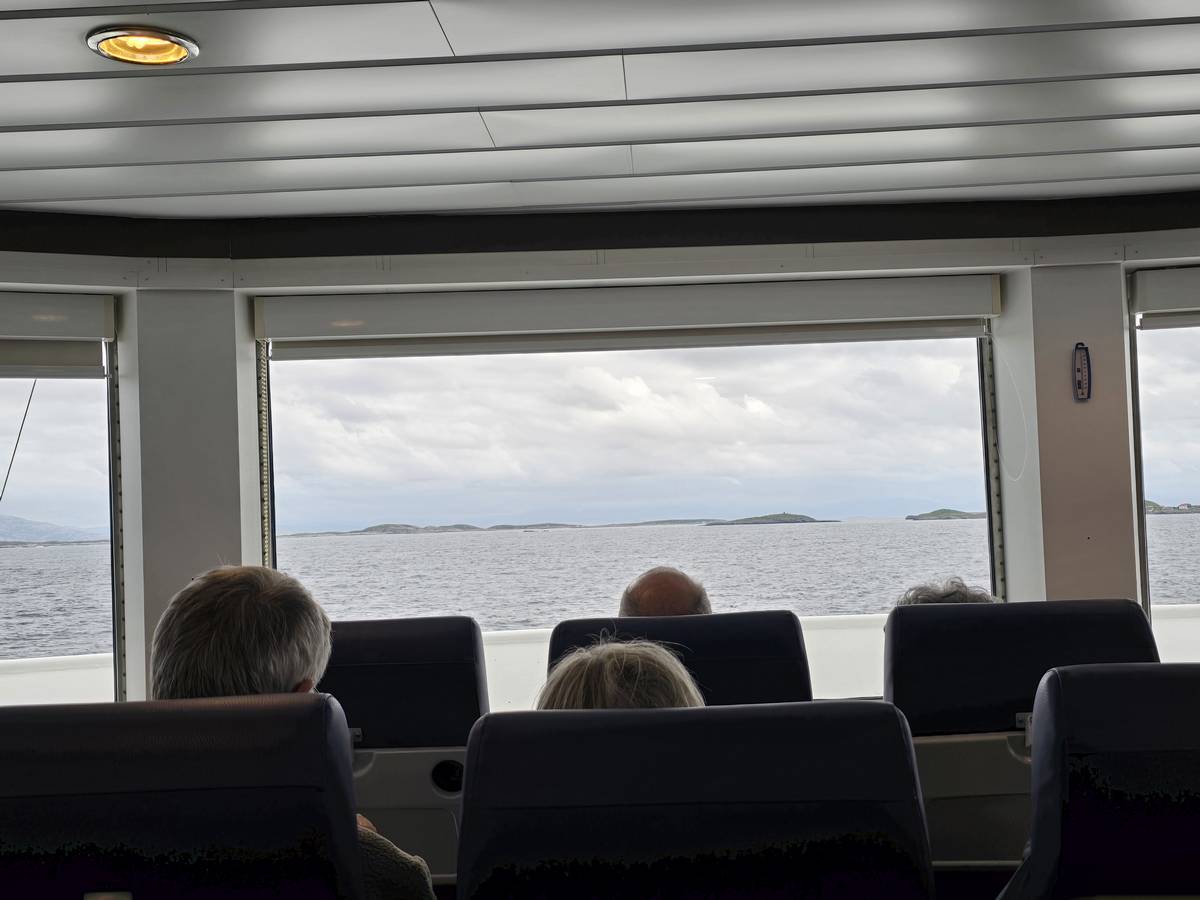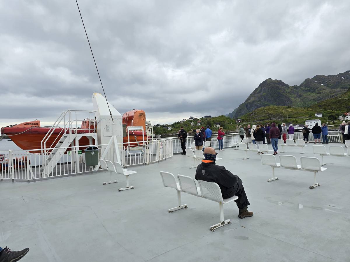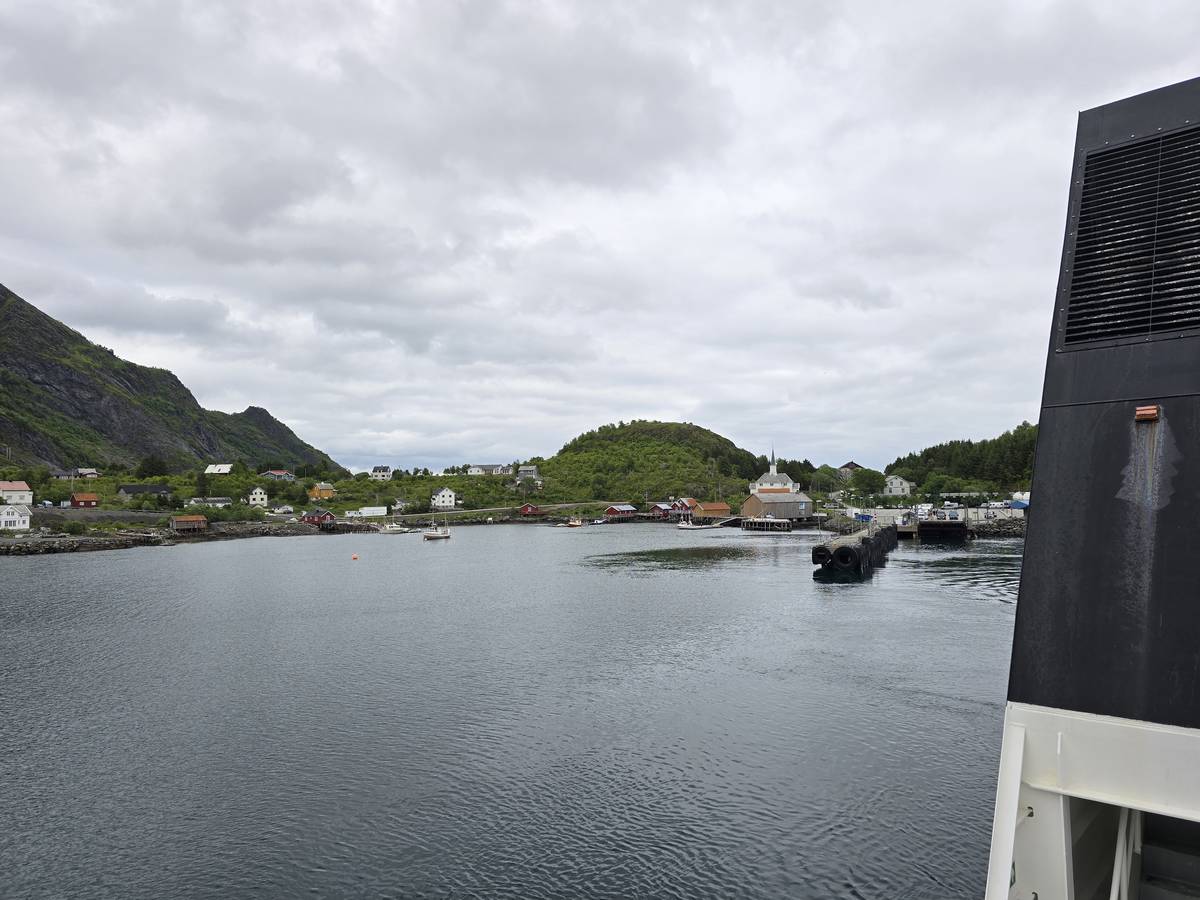 Tout d'abord, l'église de Moskenes en face de l'embarcadère sur le ferry nous amenant à Bodo. Nous ne patienterons pas longtemps. Après l'embarquement, nous allons sur l'avant du bateau pour nous prélasser dans les fauteuils, hélas au 3ème rang. Ensuite, je me dirige sur l'arrière du ferry pour prendre quelques photos. Je ne sais plus la durée de la traversée mais je sais que ça a été long (je crois, plus de 4h) et que... je me suis endormi!!!