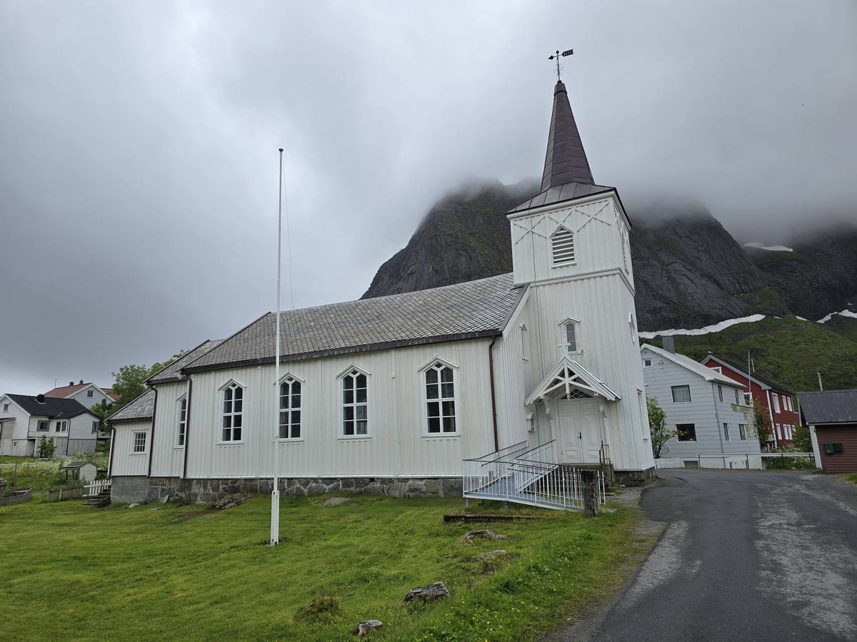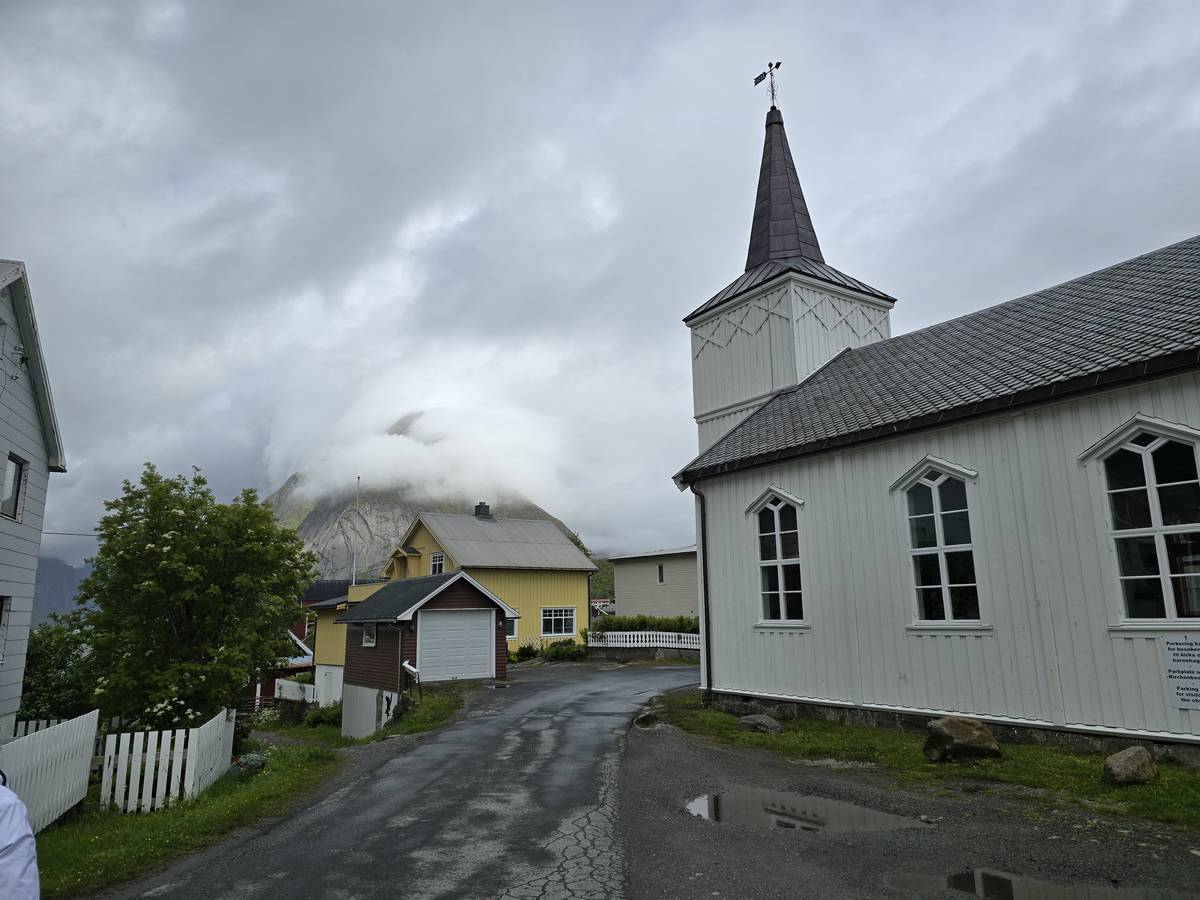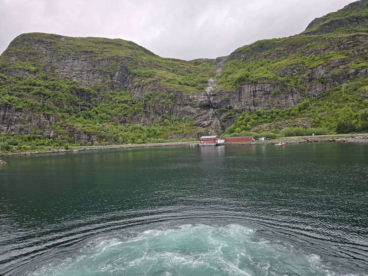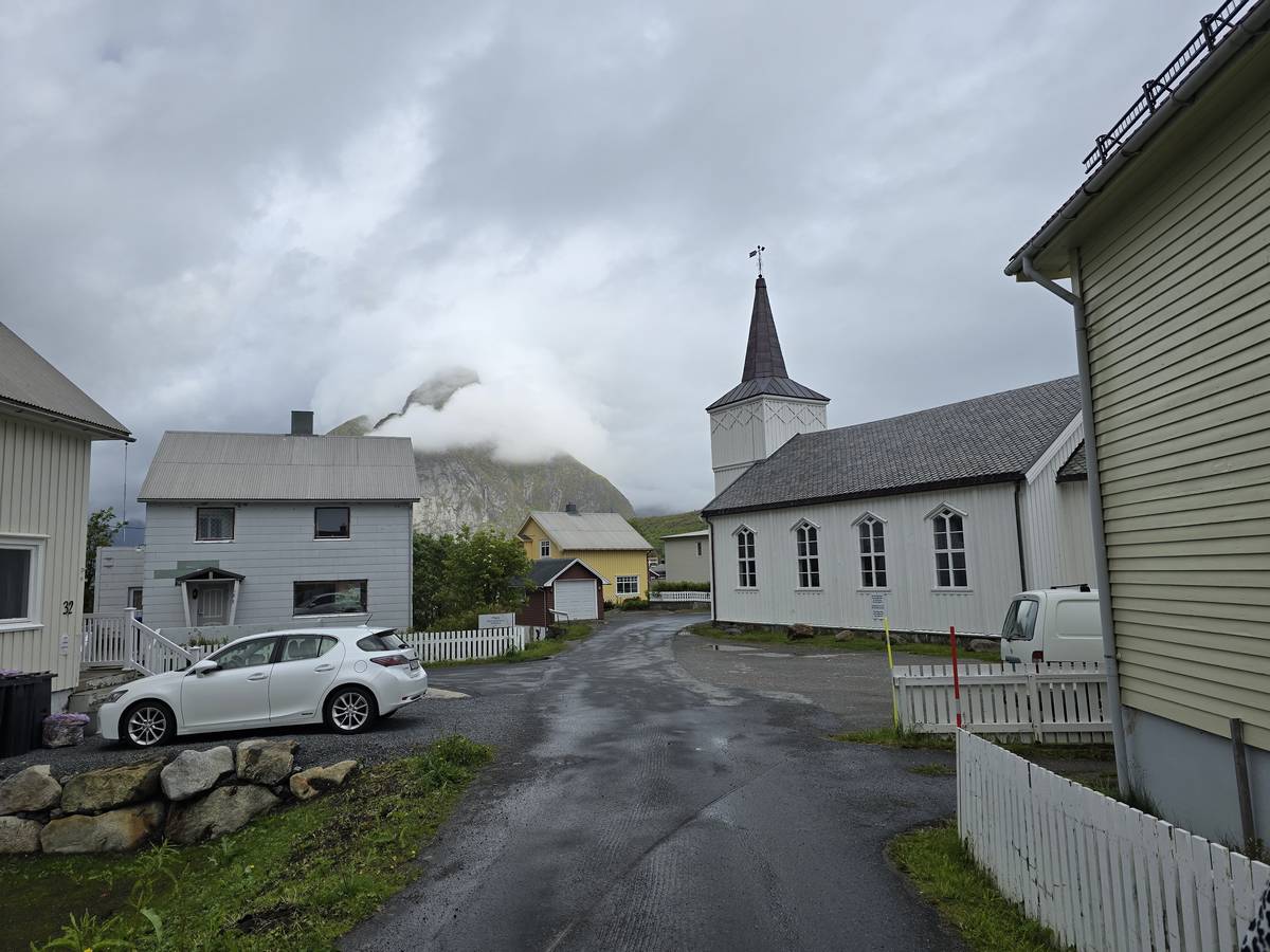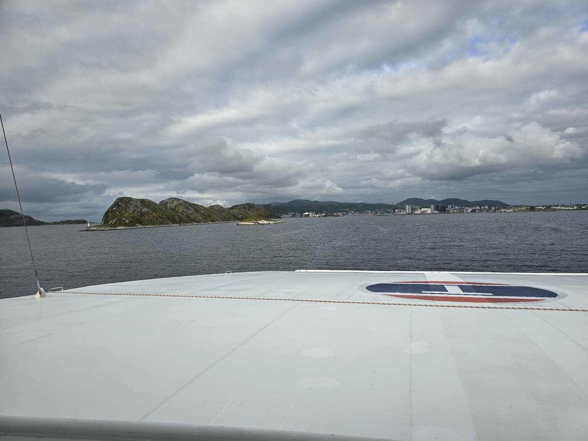 Tout d'abord, l'église de Moskenes en face de l'embarcadère sur le ferry nous amenant à Bodo. Nous ne patienterons pas longtemps. Après l'embarquement, nous allons sur l'avant du bateau pour nous prélasser dans les fauteuils, hélas au 3ème rang. Ensuite, je me dirige sur l'arrière du ferry pour prendre quelques photos. Je ne sais plus la durée de la traversée mais je sais que ça a été long (je crois, plus de 4h) et que... je me suis endormi!!!