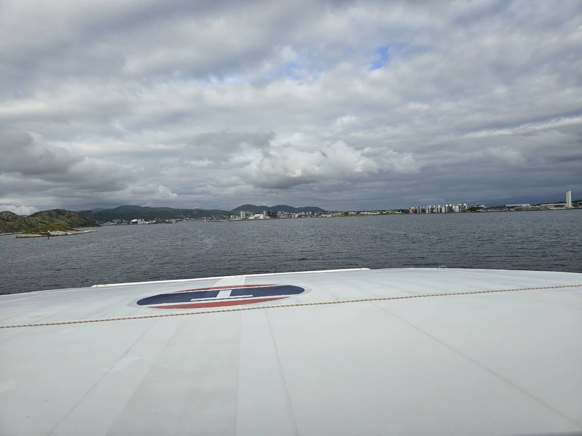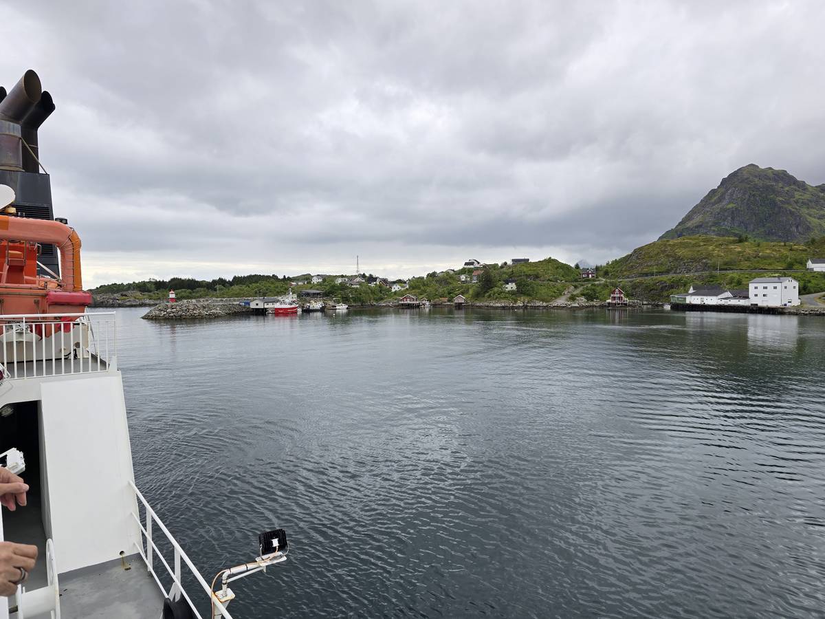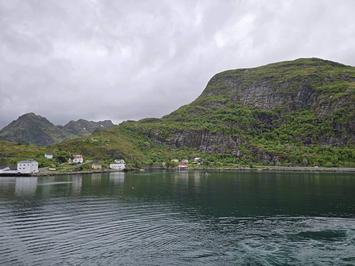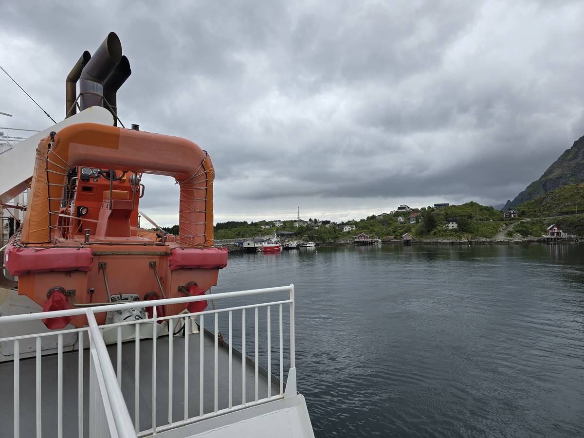 Tout d'abord, l'église de Moskenes en face de l'embarcadère sur le ferry nous amenant à Bodo. Nous ne patienterons pas longtemps. Après l'embarquement, nous allons sur l'avant du bateau pour nous prélasser dans les fauteuils, hélas au 3ème rang. Ensuite, je me dirige sur l'arrière du ferry pour prendre quelques photos. Je ne sais plus la durée de la traversée mais je sais que ça a été long (je crois, plus de 4h) et que... je me suis endormi!!!