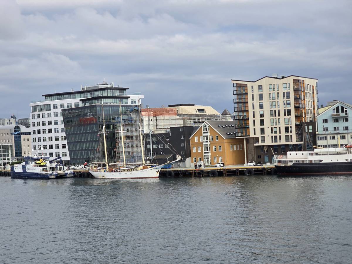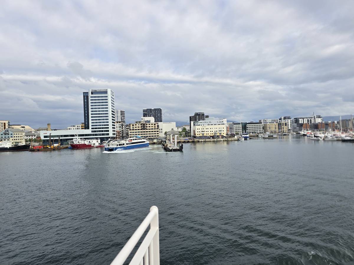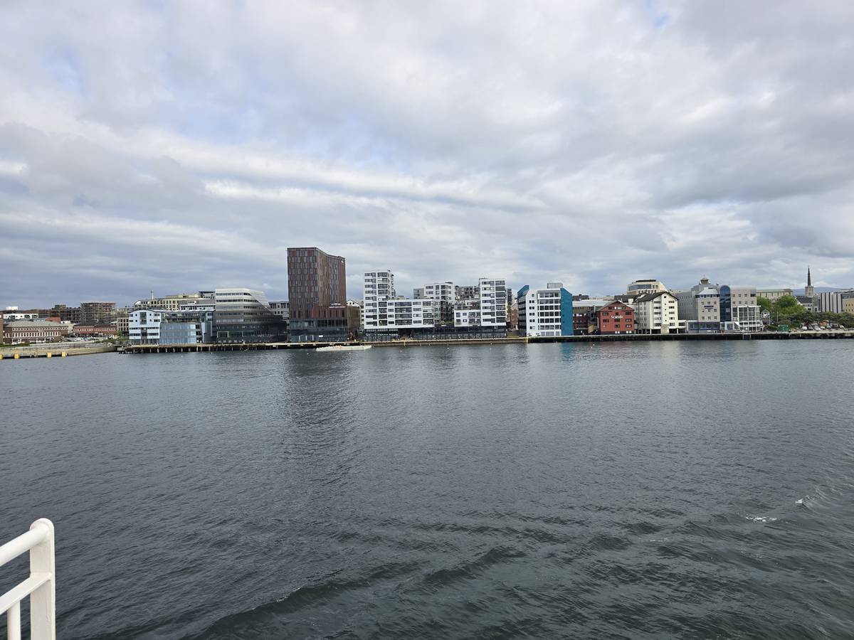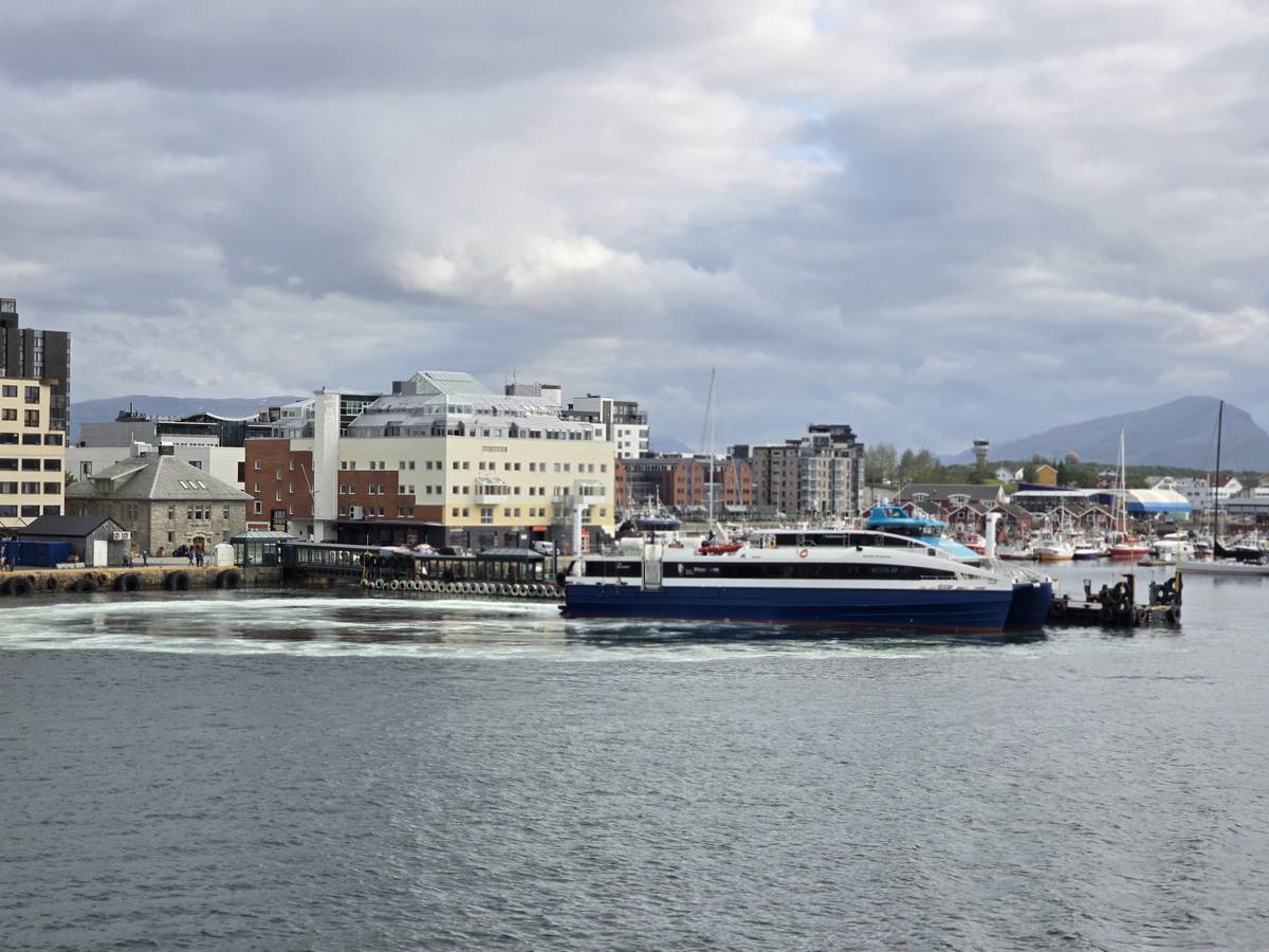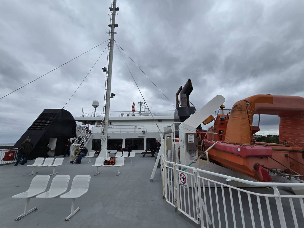 Tout d'abord, l'église de Moskenes en face de l'embarcadère sur le ferry nous amenant à Bodo. Nous ne patienterons pas longtemps. Après l'embarquement, nous allons sur l'avant du bateau pour nous prélasser dans les fauteuils, hélas au 3ème rang. Ensuite, je me dirige sur l'arrière du ferry pour prendre quelques photos. Je ne sais plus la durée de la traversée mais je sais que ça a été long (je crois, plus de 4h) et que... je me suis endormi!!!