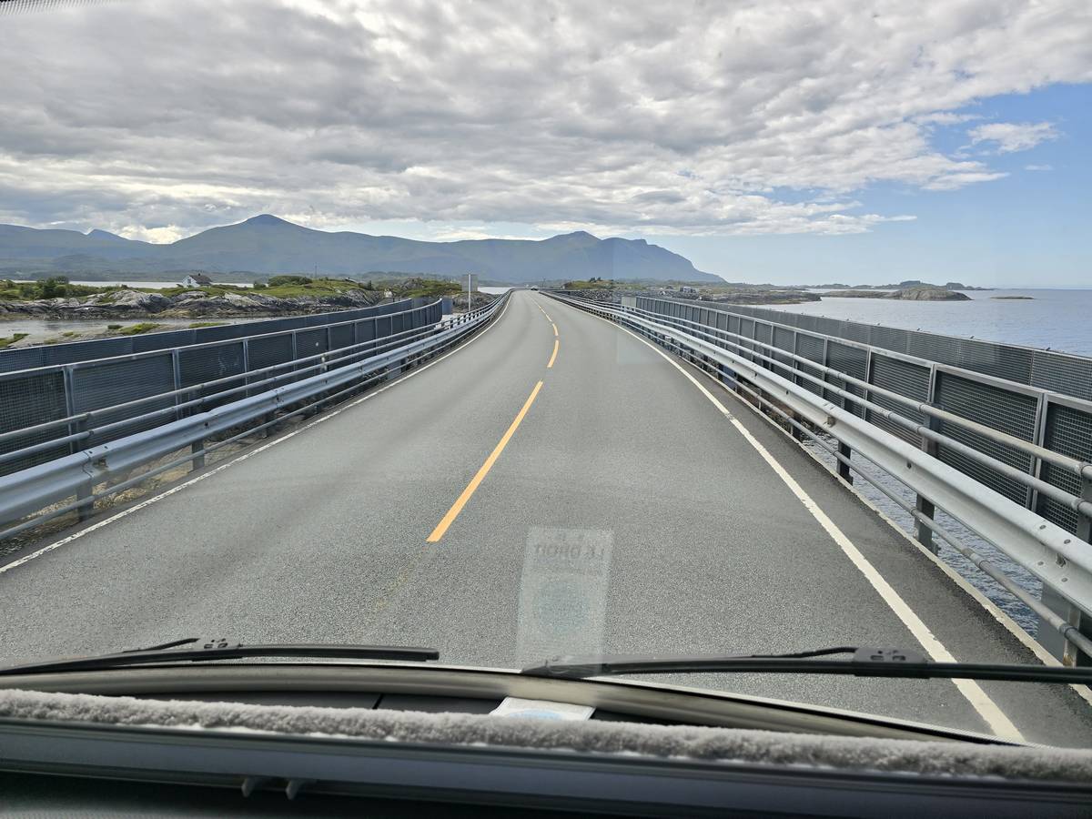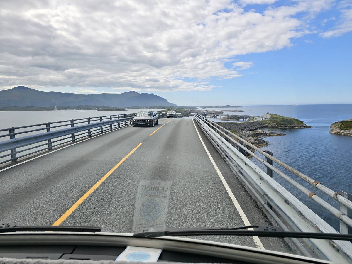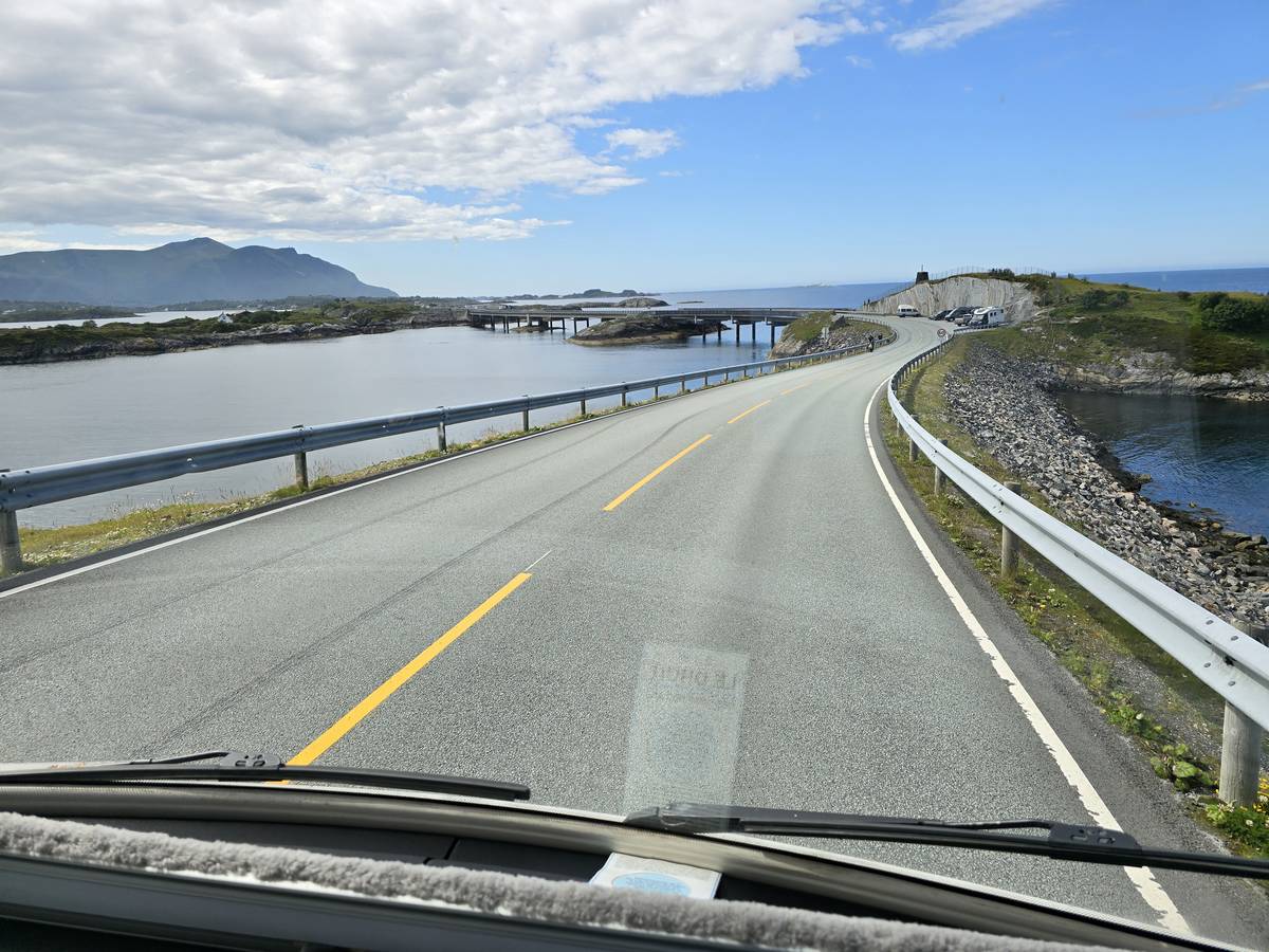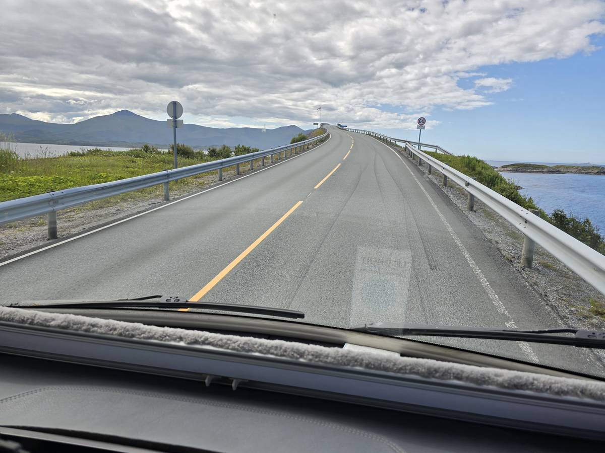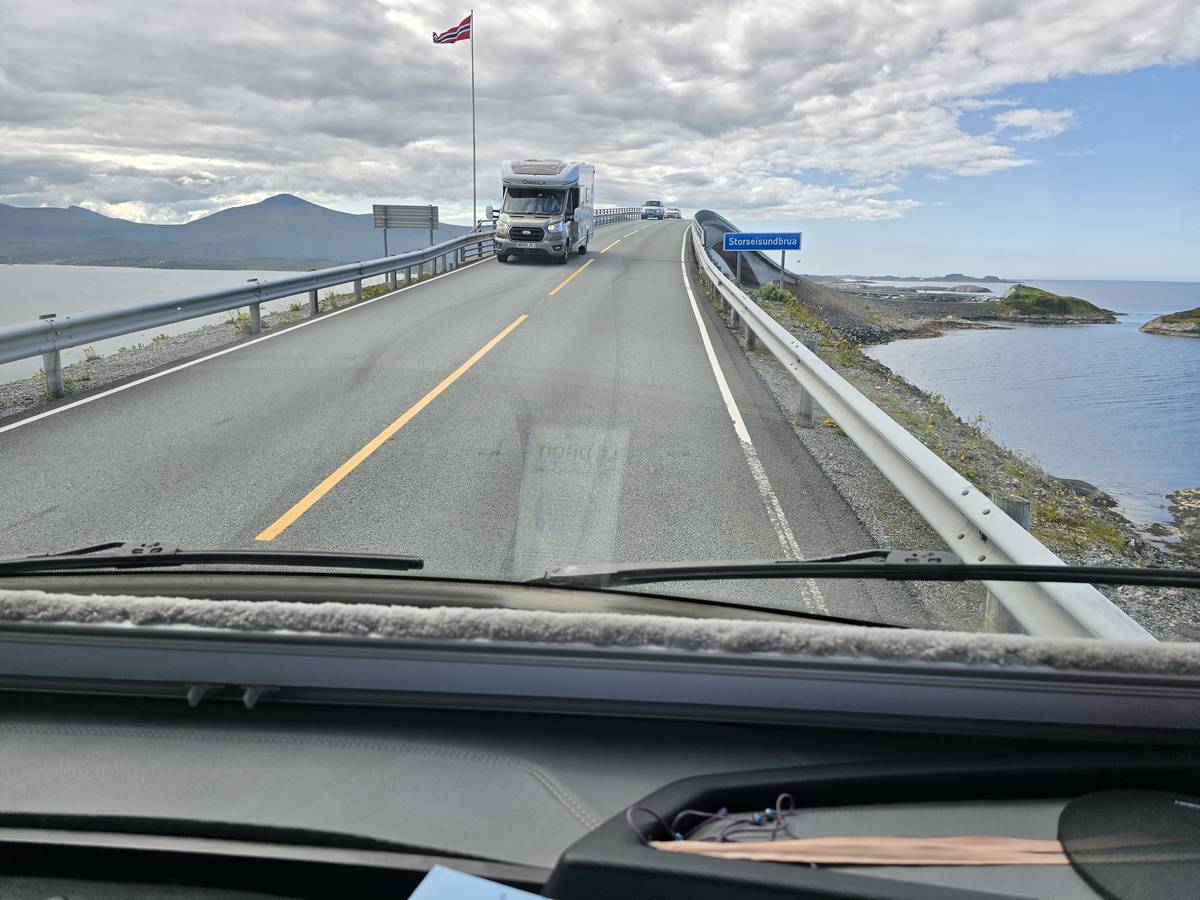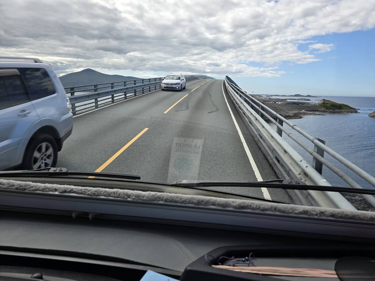 Nous prenons le ferry pour Christiansund. Puis la magique route de l'Atlantique. Vous trouverez cerainement des photos un peu similaires, c'est volontaire! J'ai trouvé cette route tellement belle que j'ai pris beaucoup de photos (nous avons pris) et j'en ai gardé beaucoup et jeté également beaucoup. Nous passerons la nuit entre Alesund et Vetnes sur un grand parking (Coordonnées : 62.532978, 6.950589).