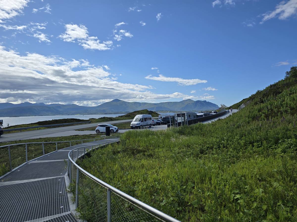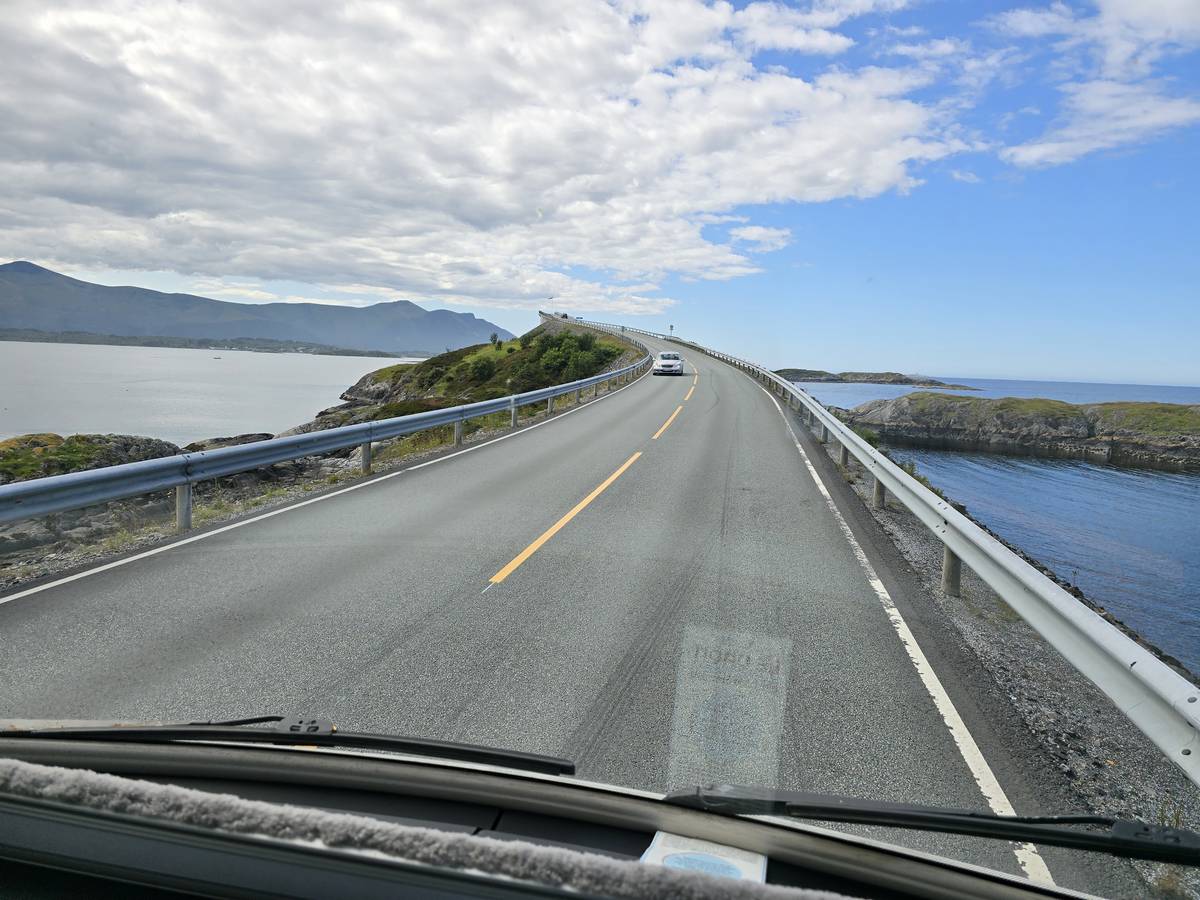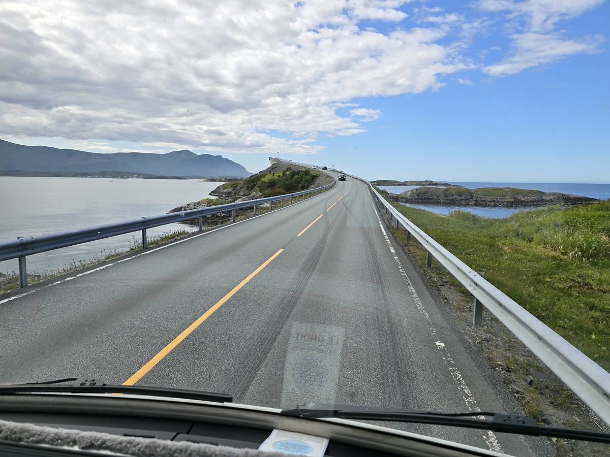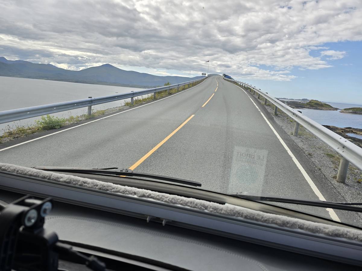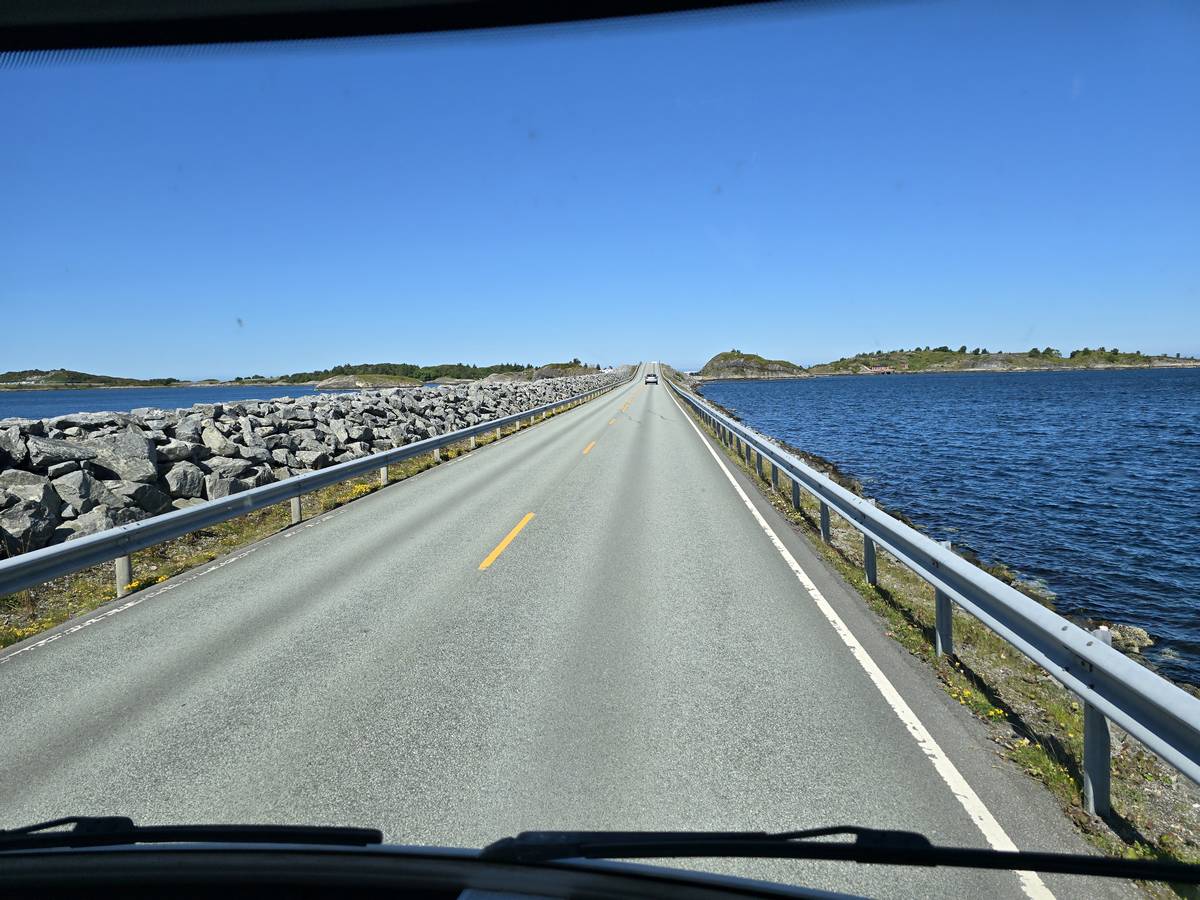 Nous prenons le ferry pour Christiansund. Puis la magique route de l'Atlantique. Vous trouverez cerainement des photos un peu similaires, c'est volontaire! J'ai trouvé cette route tellement belle que j'ai pris beaucoup de photos (nous avons pris) et j'en ai gardé beaucoup et jeté également beaucoup. Nous passerons la nuit entre Alesund et Vetnes sur un grand parking (Coordonnées : 62.532978, 6.950589).
