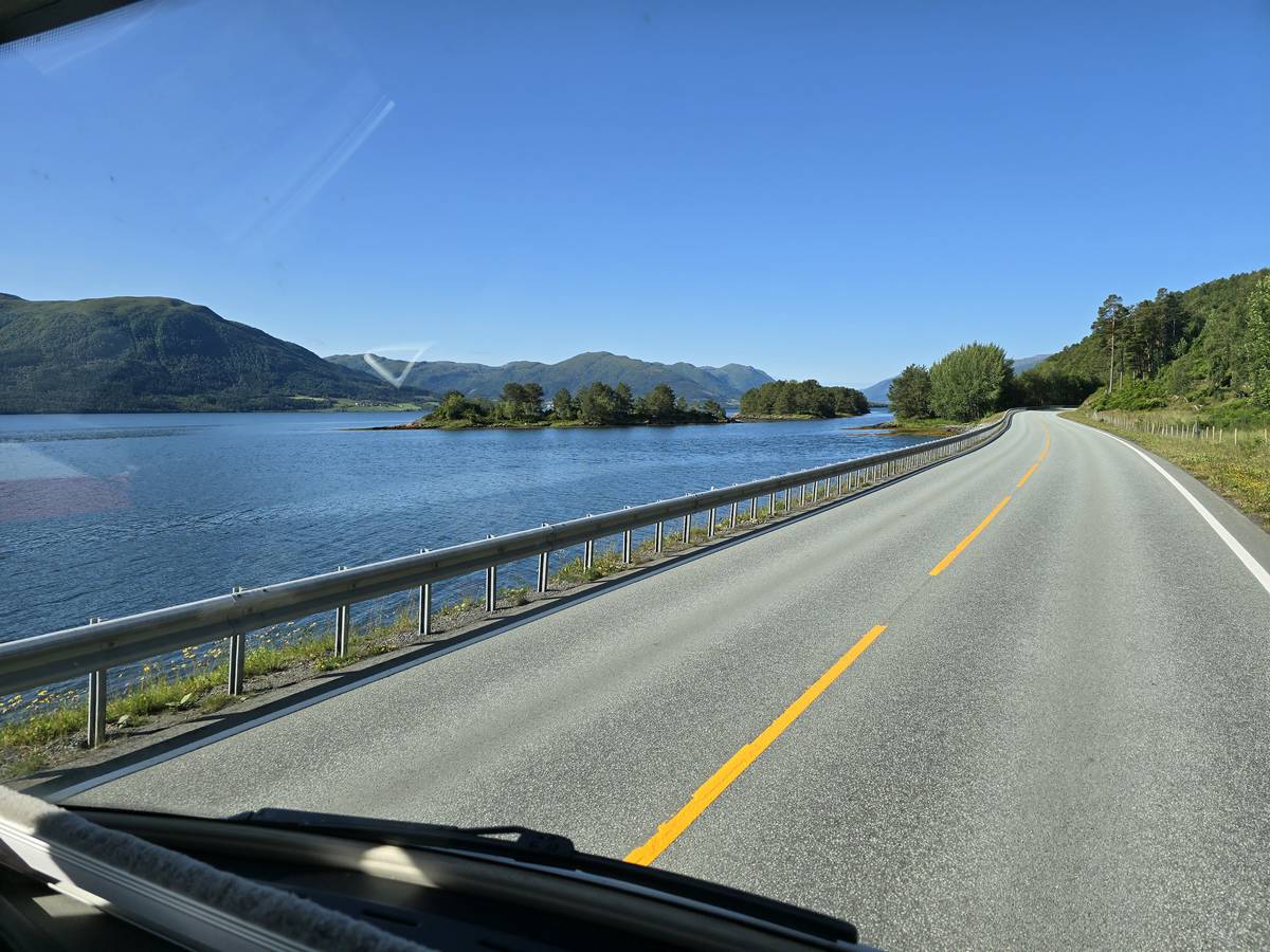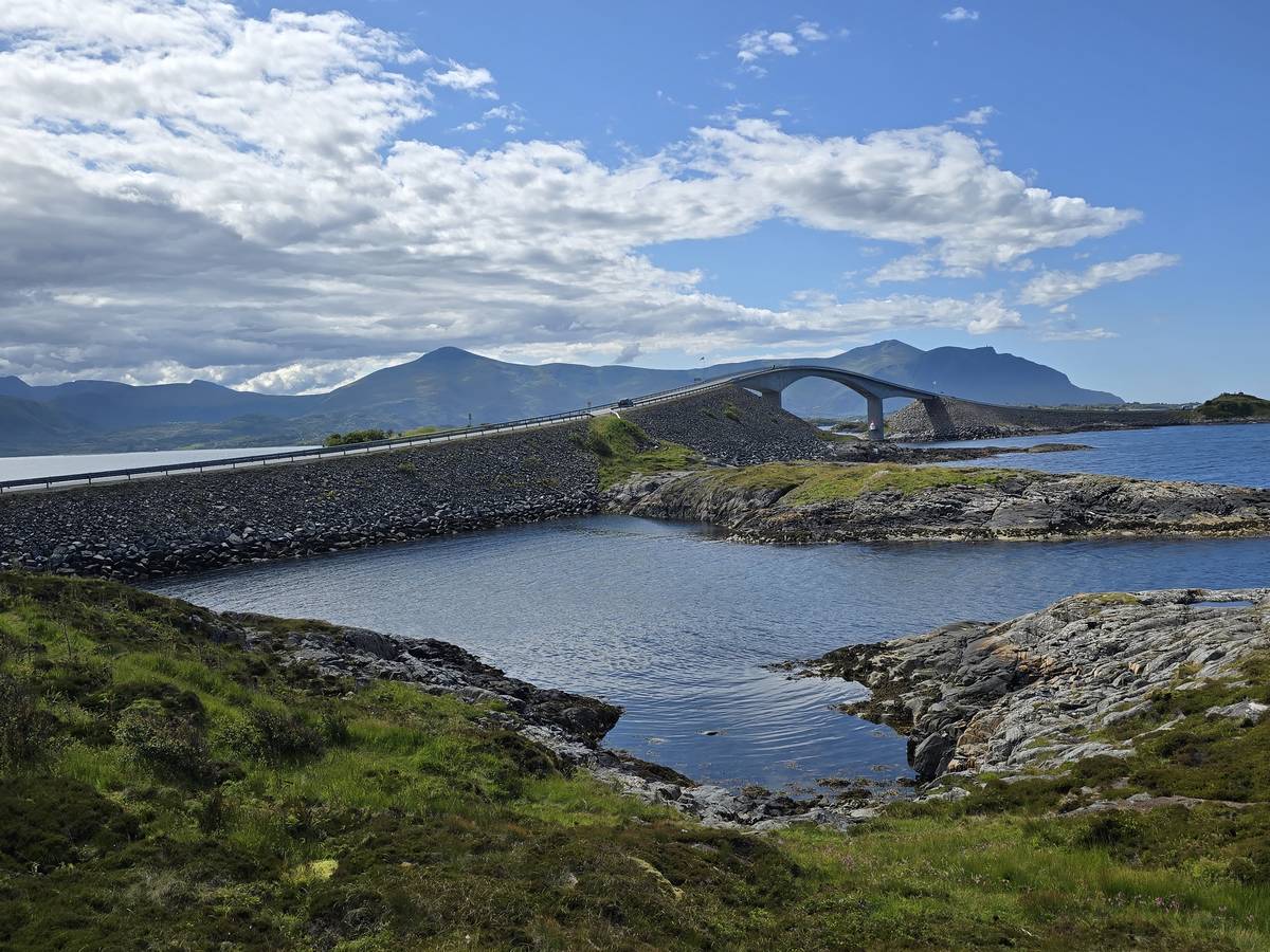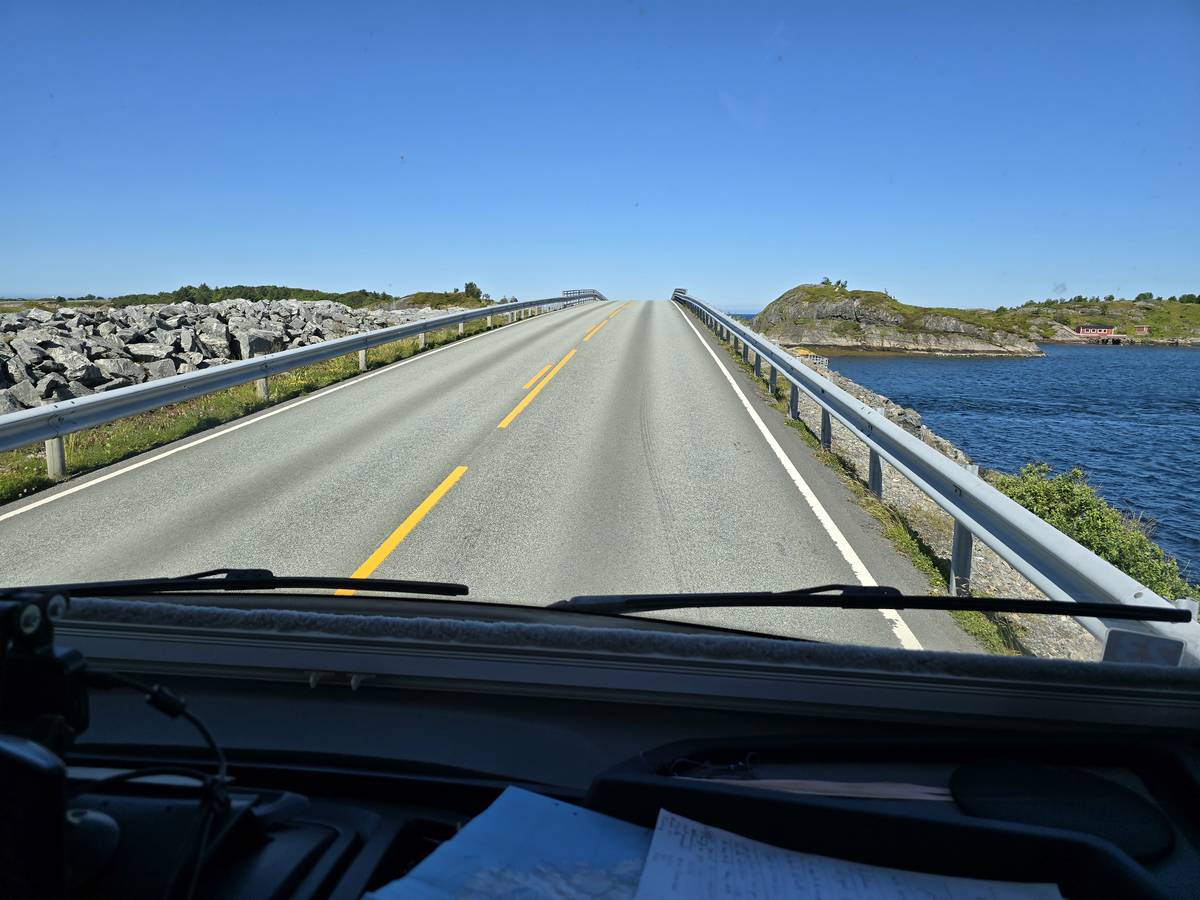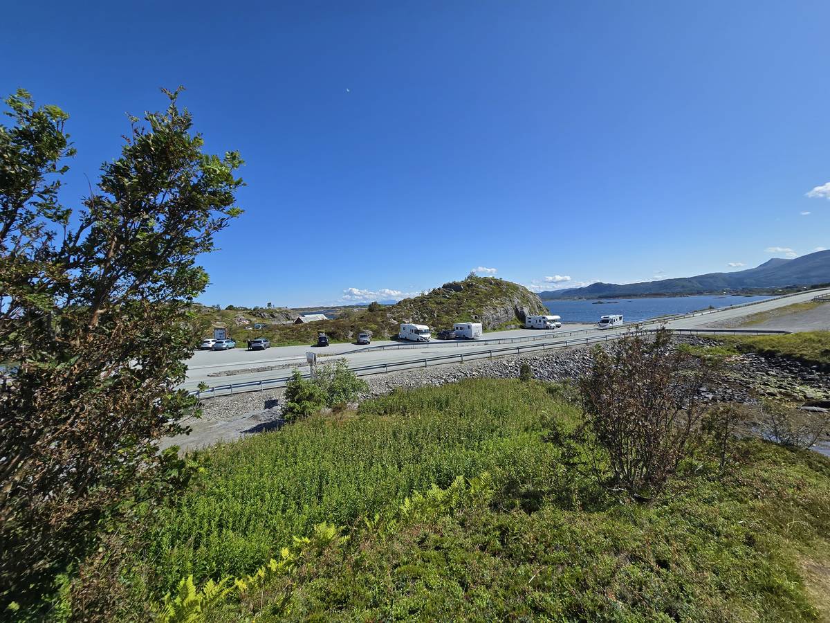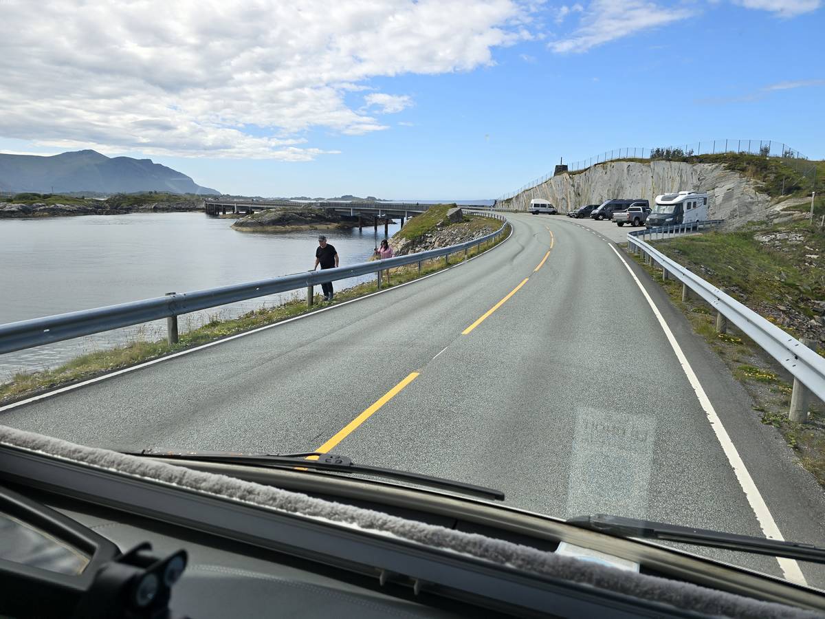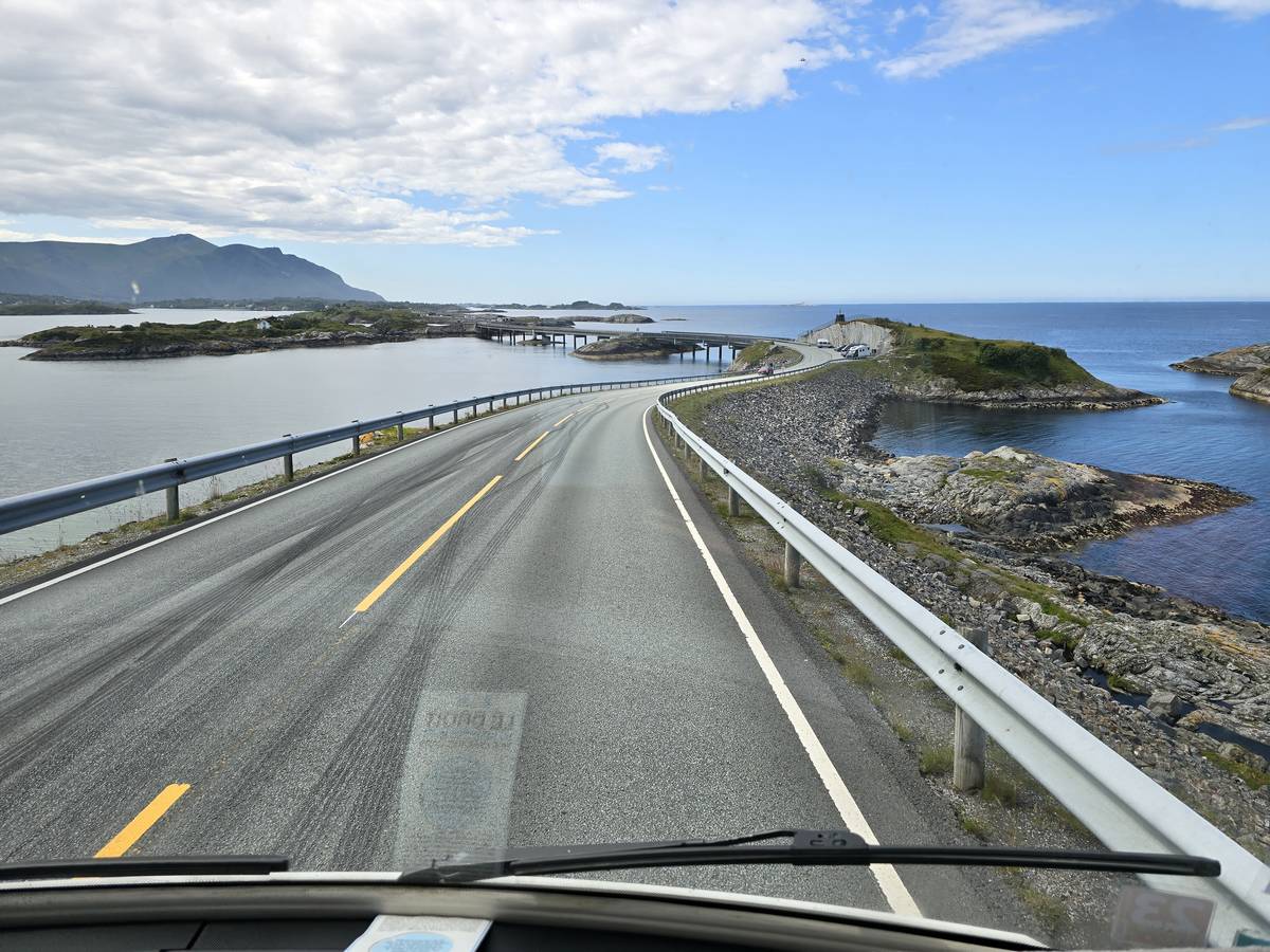 Nous prenons le ferry pour Christiansund. Puis la magique route de l'Atlantique. Vous trouverez cerainement des photos un peu similaires, c'est volontaire! J'ai trouvé cette route tellement belle que j'ai pris beaucoup de photos (nous avons pris) et j'en ai gardé beaucoup et jeté également beaucoup. Nous passerons la nuit entre Alesund et Vetnes sur un grand parking (Coordonnées : 62.532978, 6.950589).
