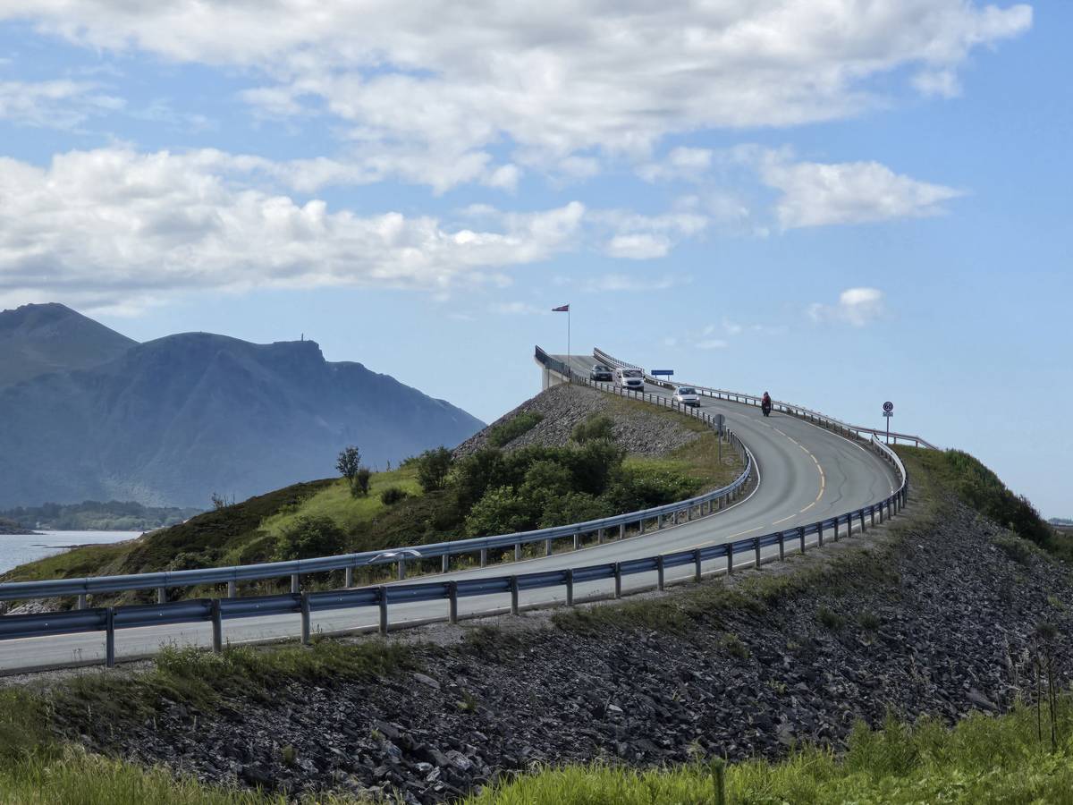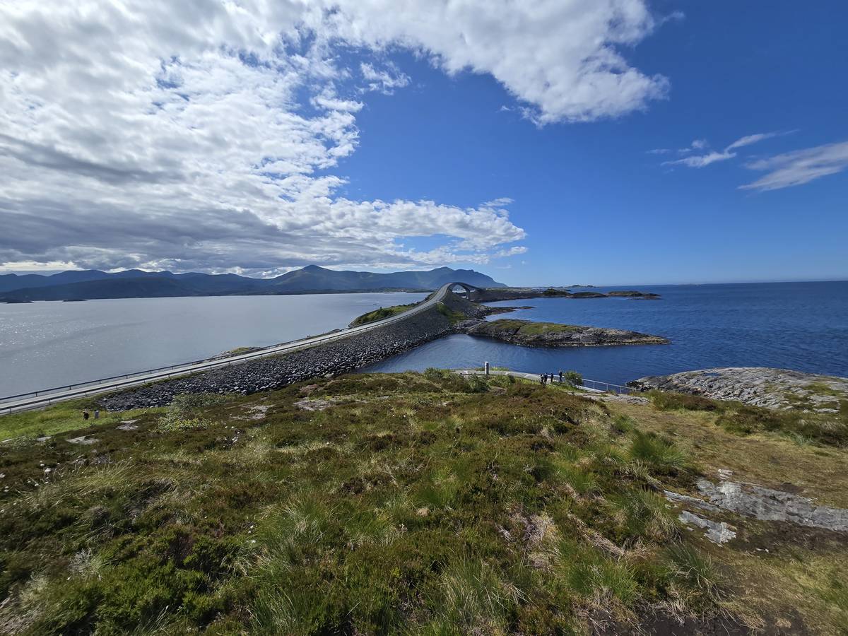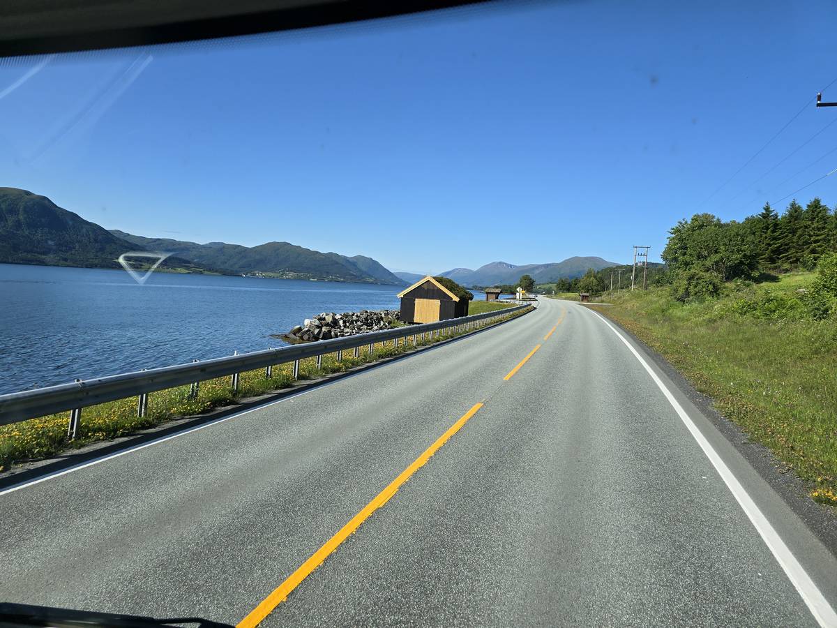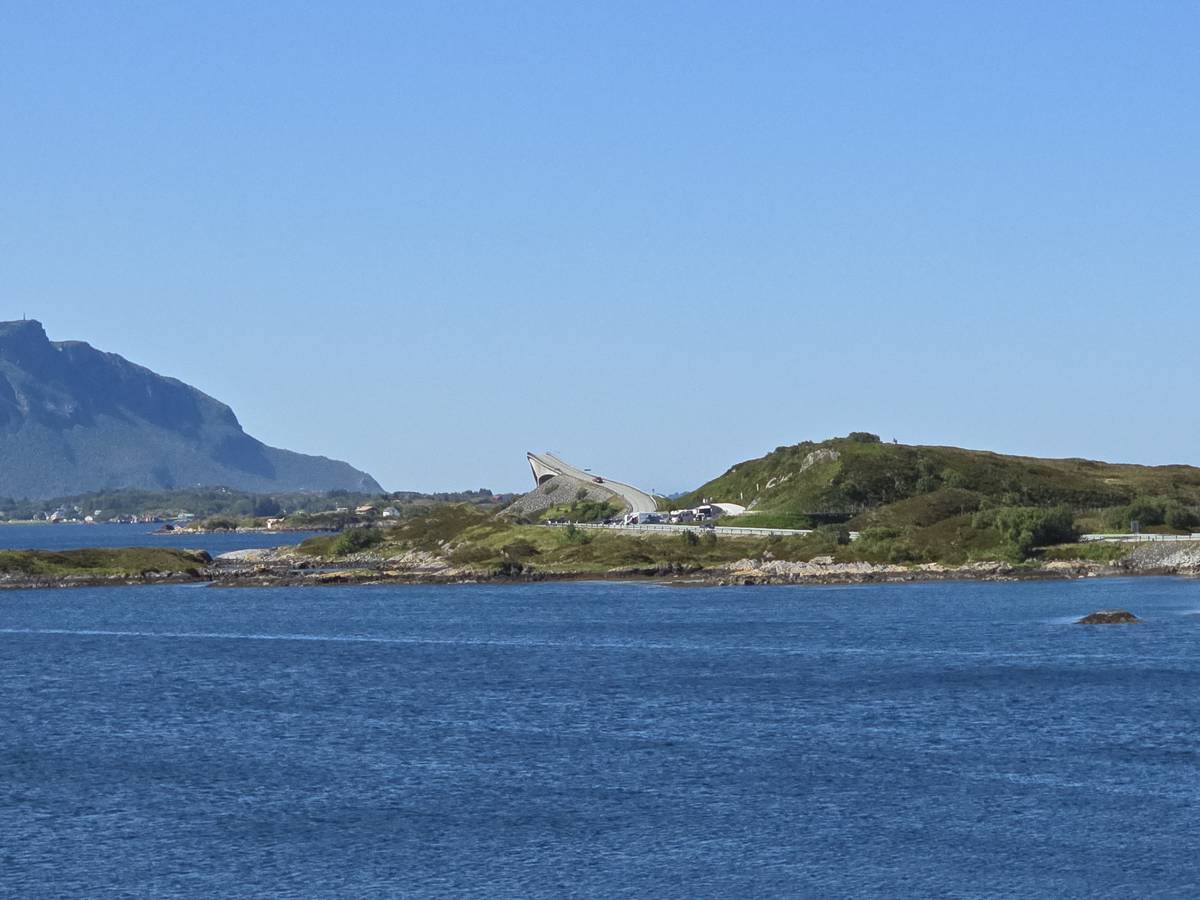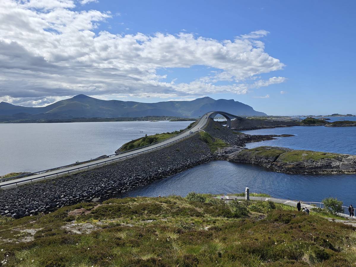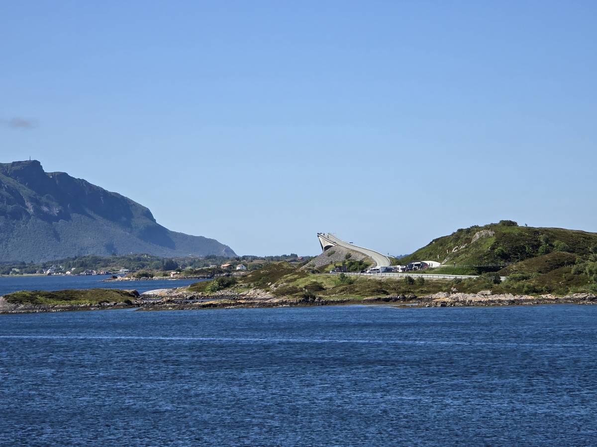 Nous prenons le ferry pour Christiansund. Puis la magique route de l'Atlantique. Vous trouverez cerainement des photos un peu similaires, c'est volontaire! J'ai trouvé cette route tellement belle que j'ai pris beaucoup de photos (nous avons pris) et j'en ai gardé beaucoup et jeté également beaucoup. Nous passerons la nuit entre Alesund et Vetnes sur un grand parking (Coordonnées : 62.532978, 6.950589).