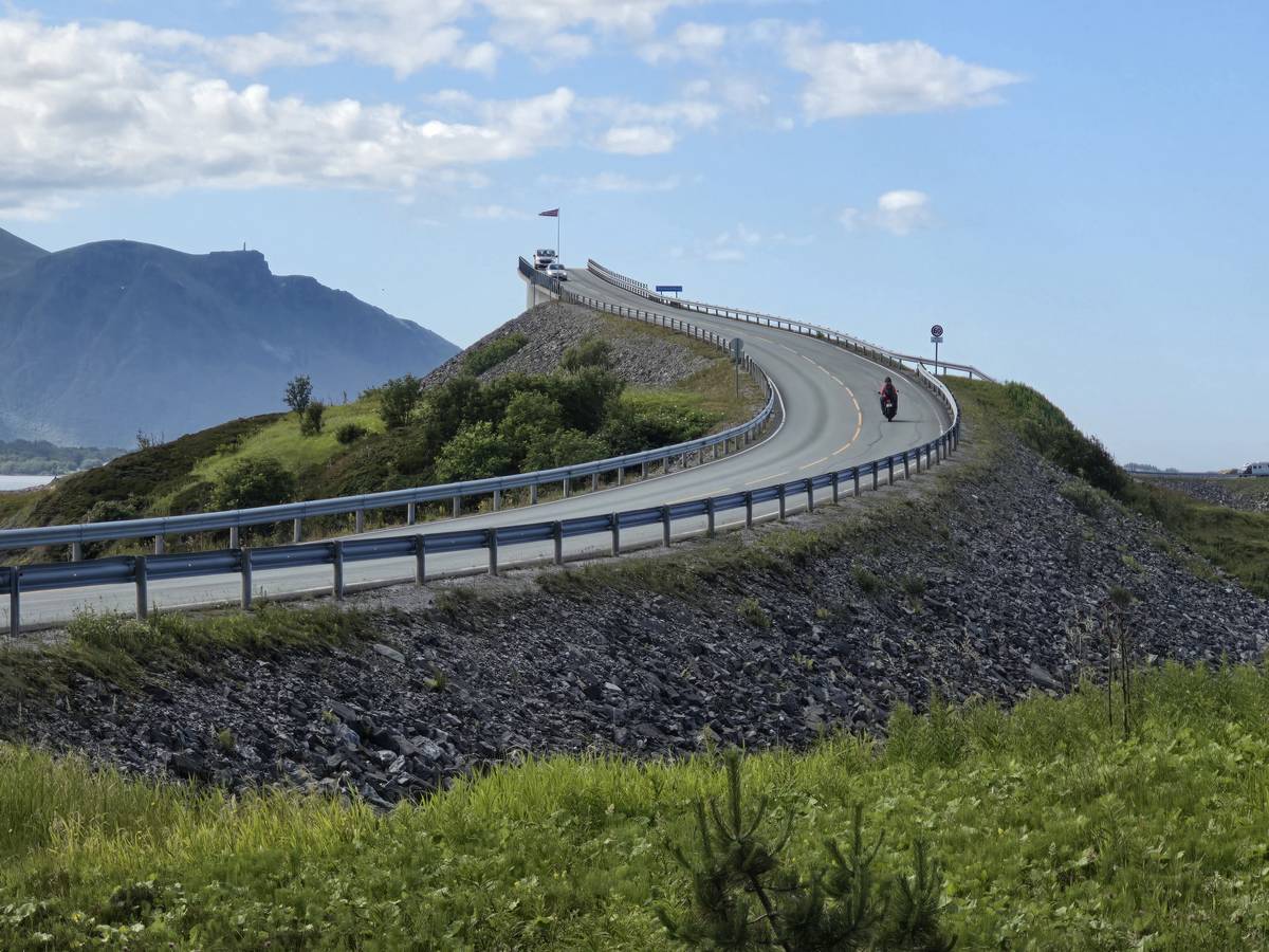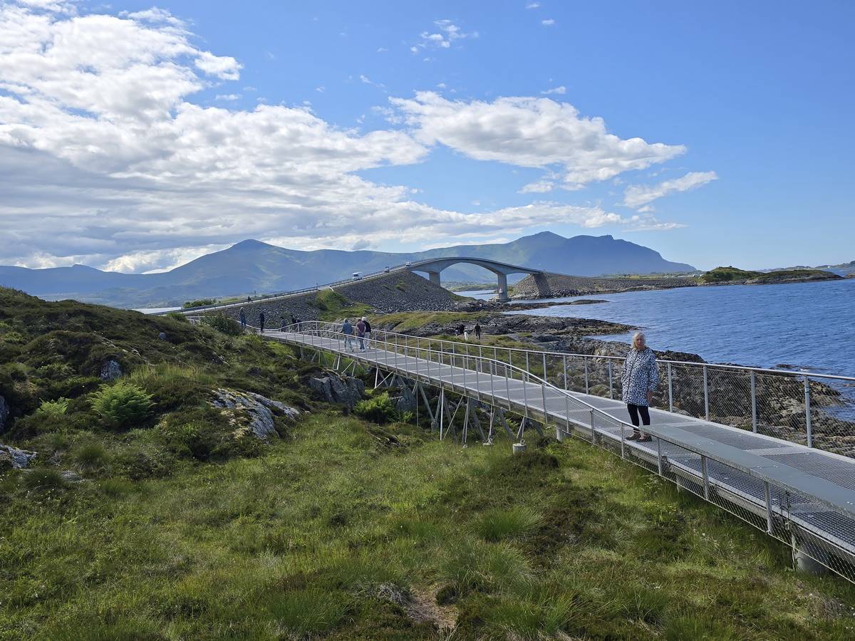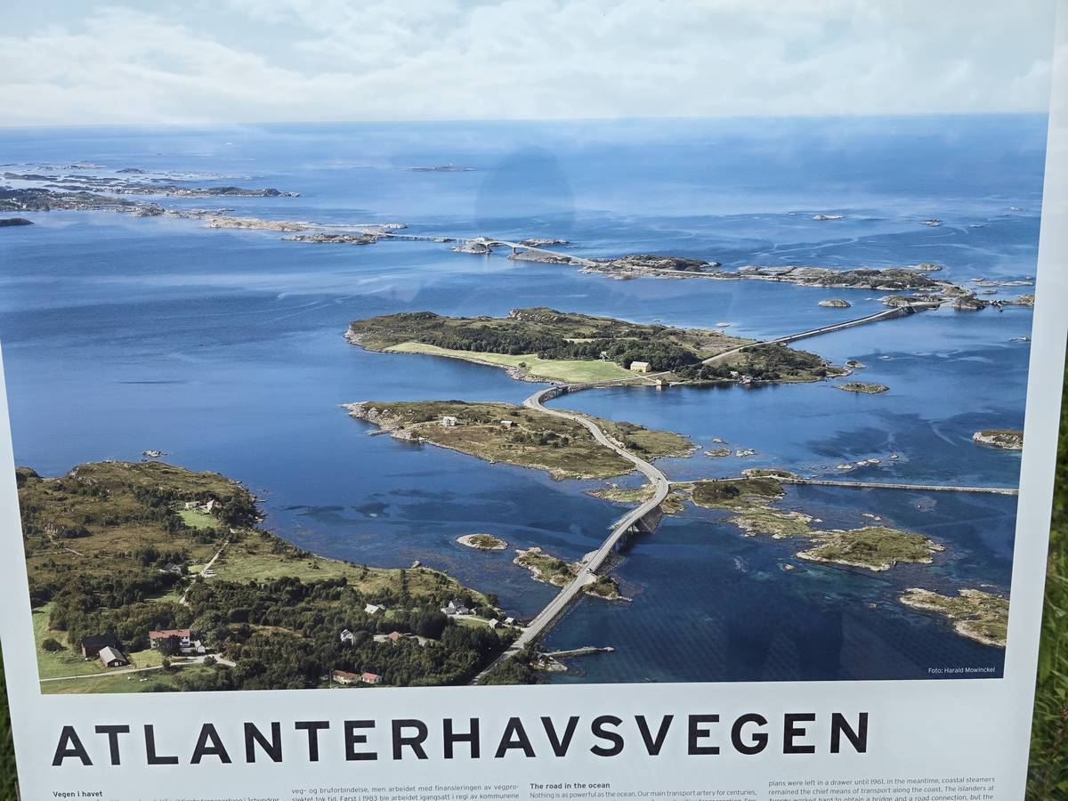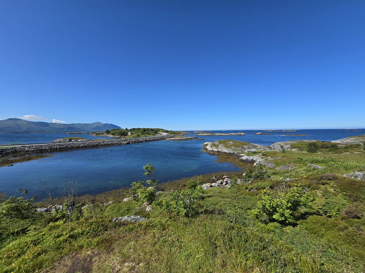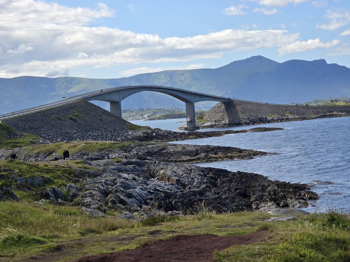 Nous prenons le ferry pour Christiansund. Puis la magique route de l'Atlantique. Vous trouverez cerainement des photos un peu similaires, c'est volontaire! J'ai trouvé cette route tellement belle que j'ai pris beaucoup de photos (nous avons pris) et j'en ai gardé beaucoup et jeté également beaucoup. Nous passerons la nuit entre Alesund et Vetnes sur un grand parking (Coordonnées : 62.532978, 6.950589).