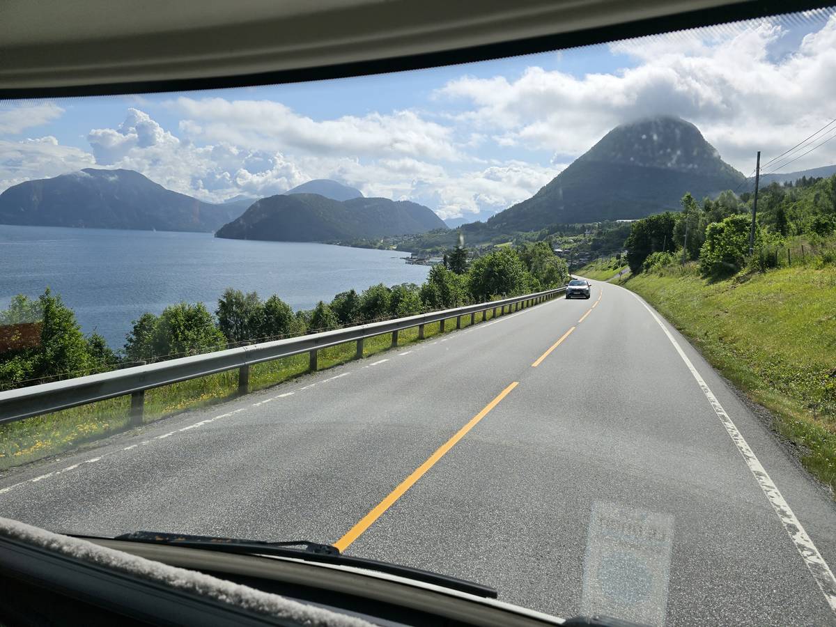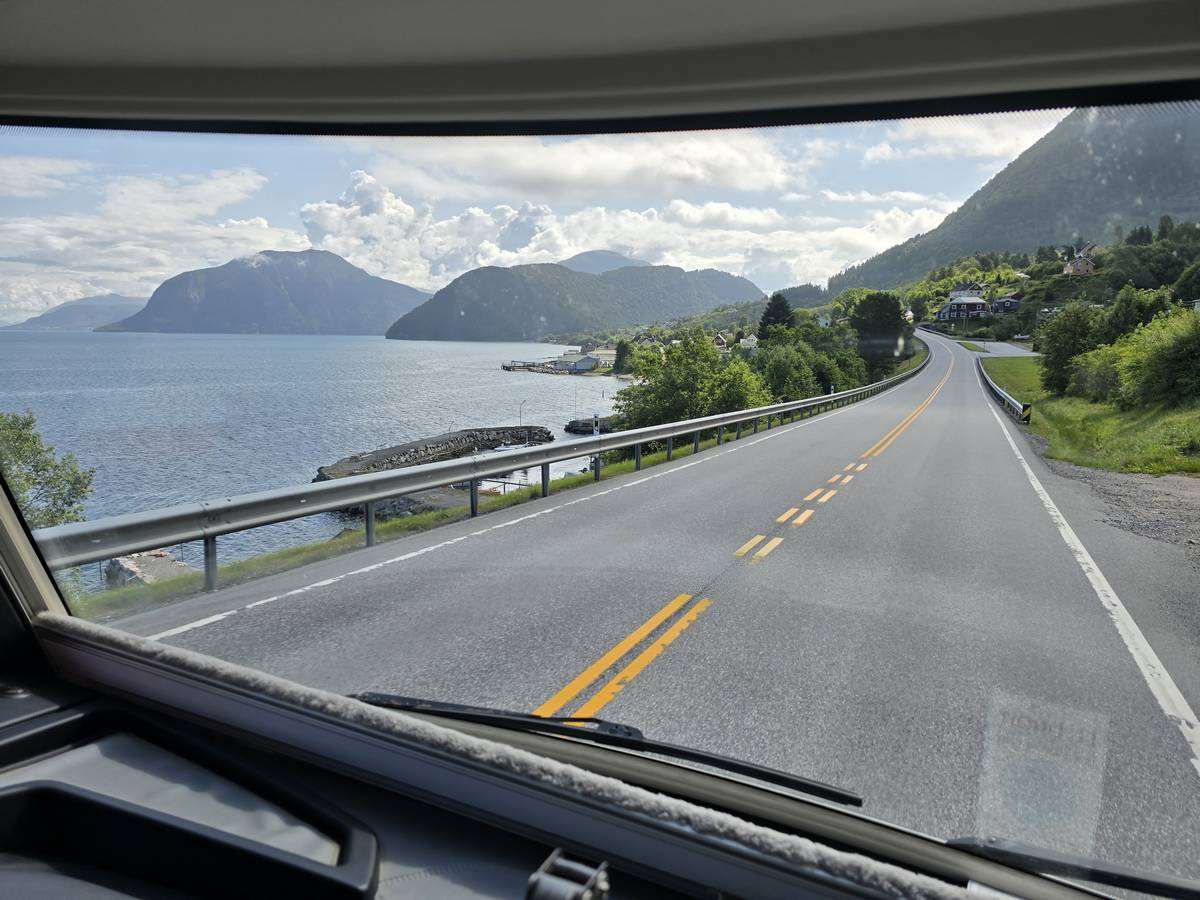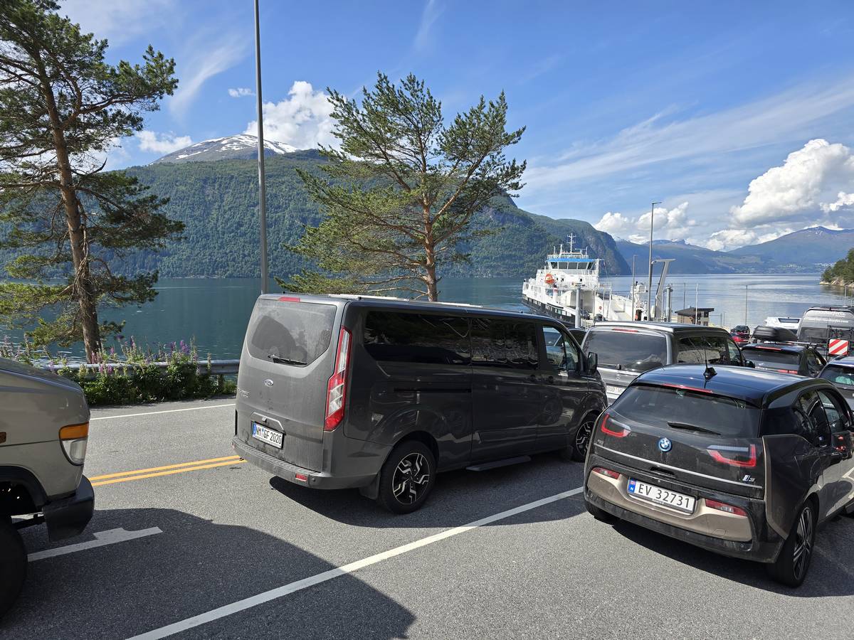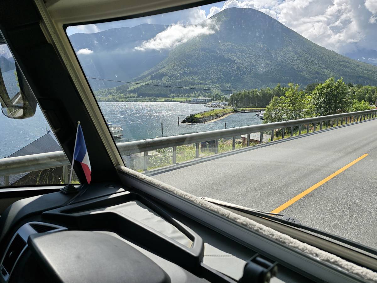 Sur la route jusqu'au sommet de la route des aigles (Orneveien). Nous prenons le ferry à Linge, nous traversons le Storfjord et débarquons à Eidsdal.
