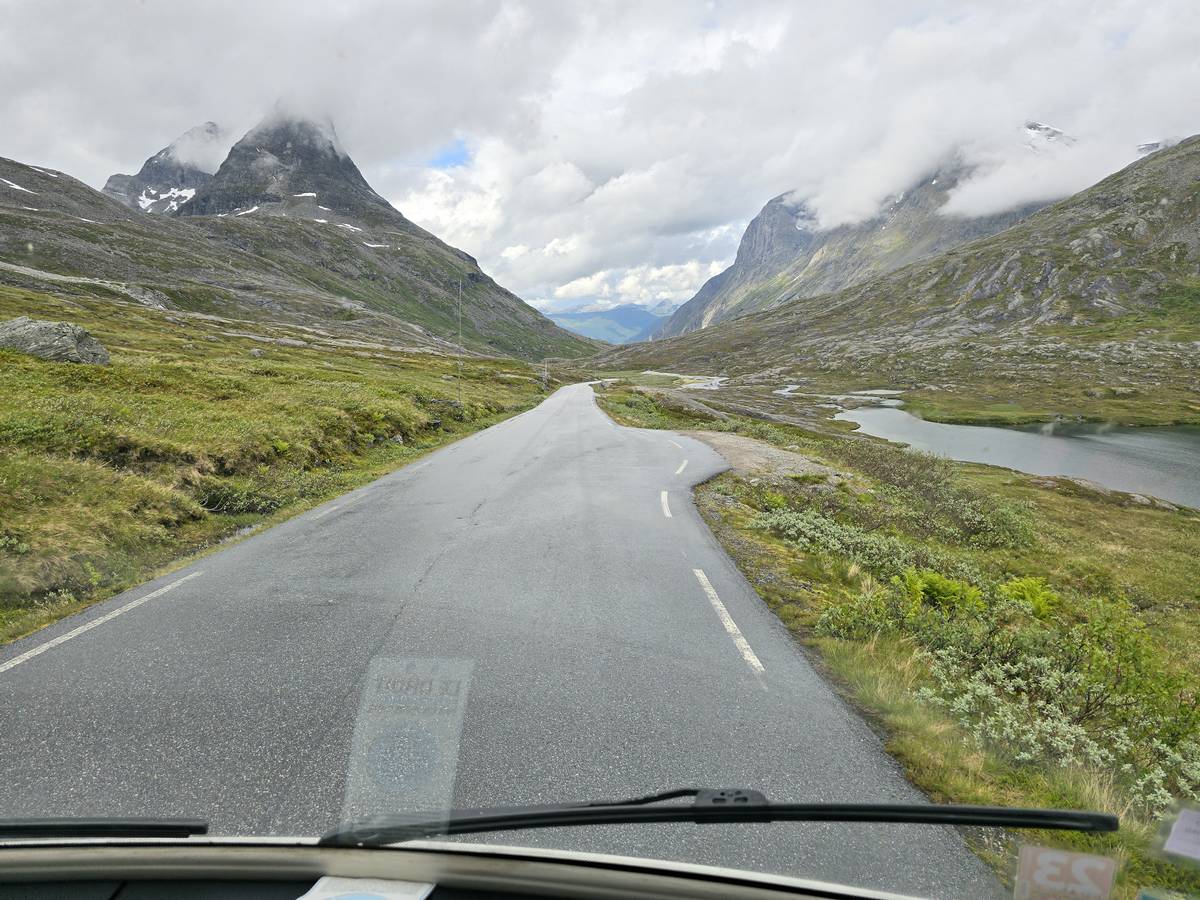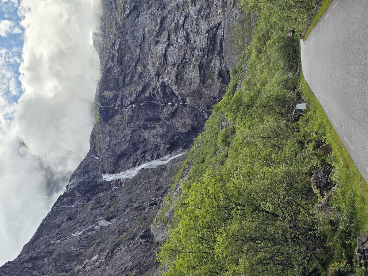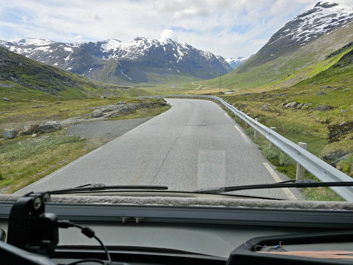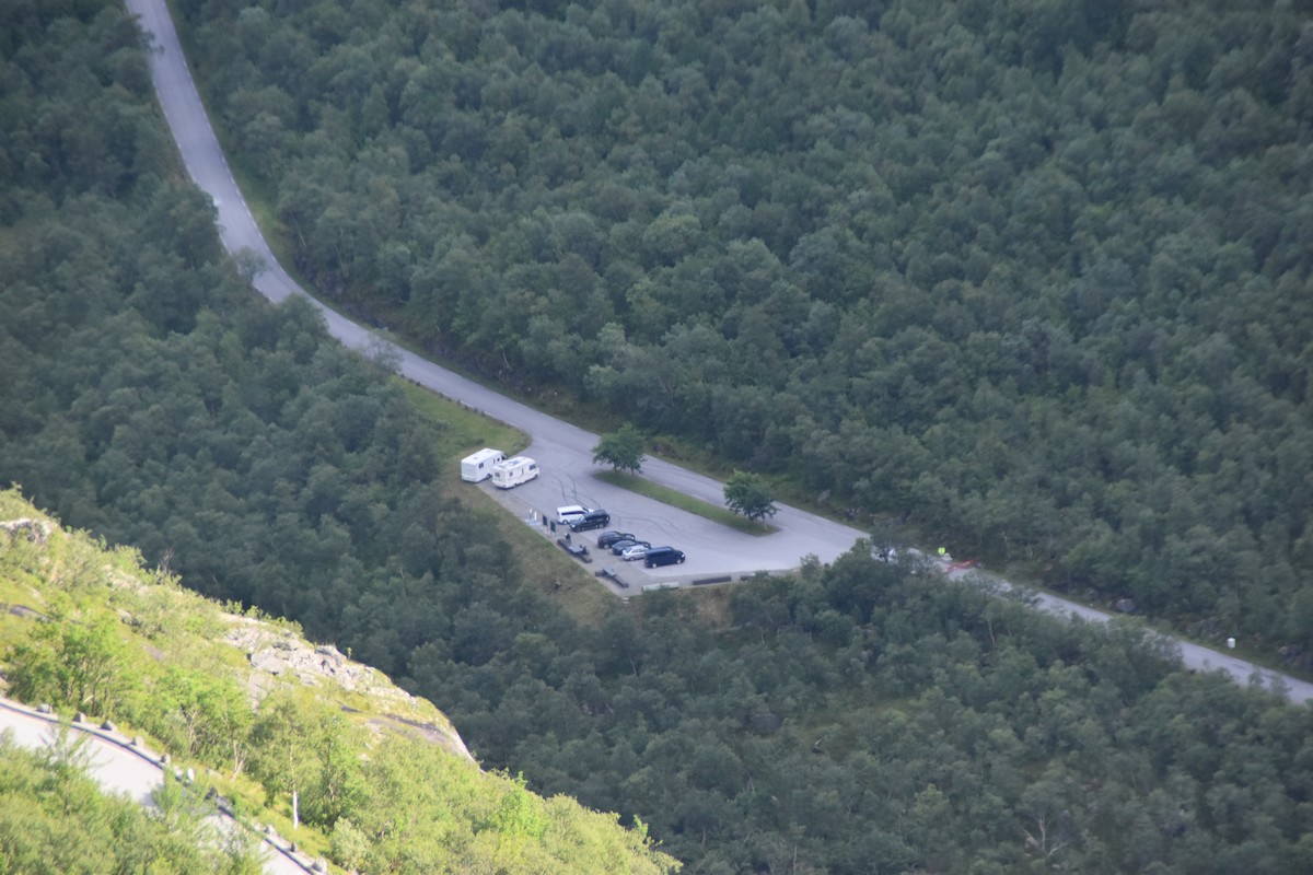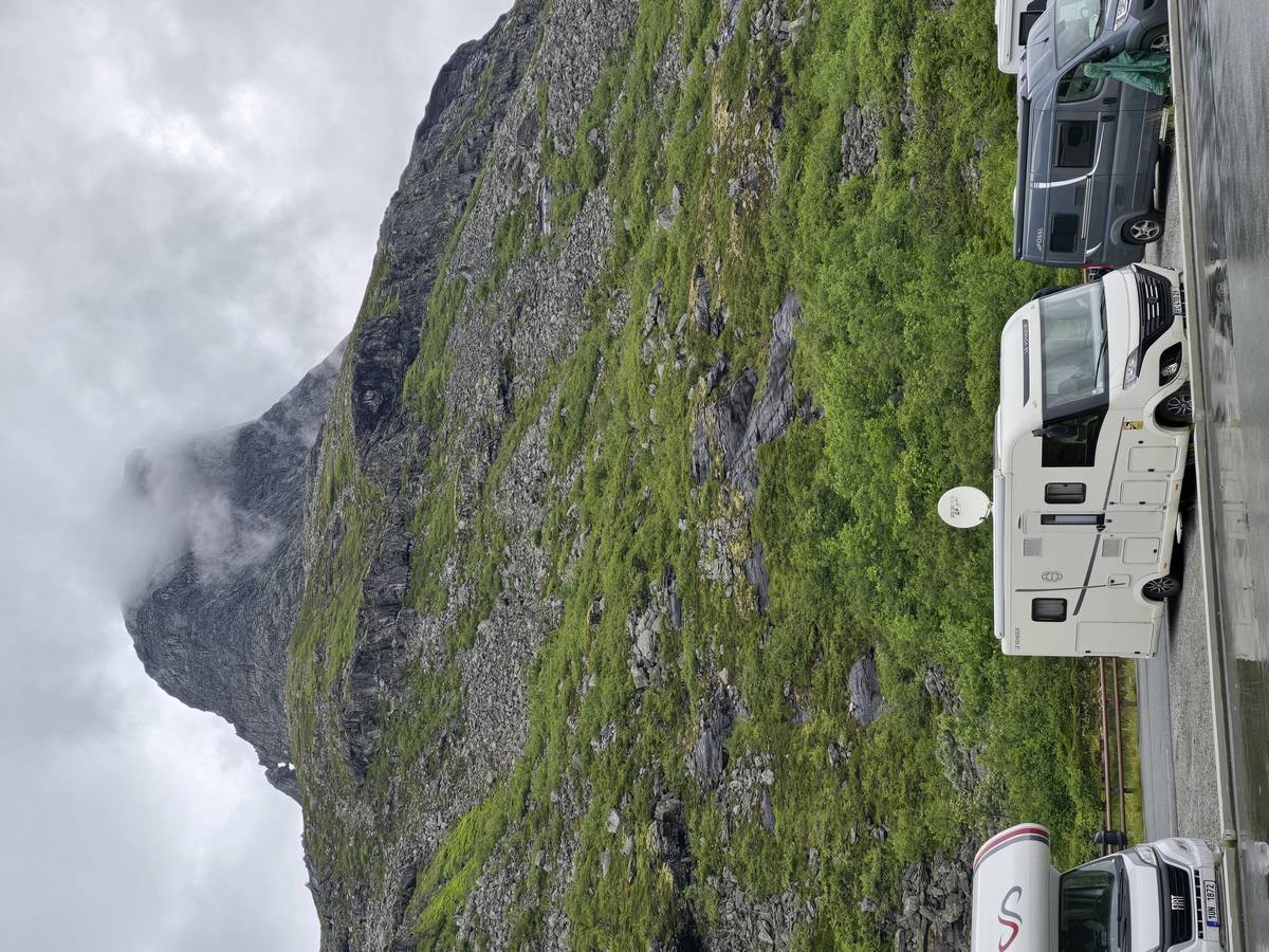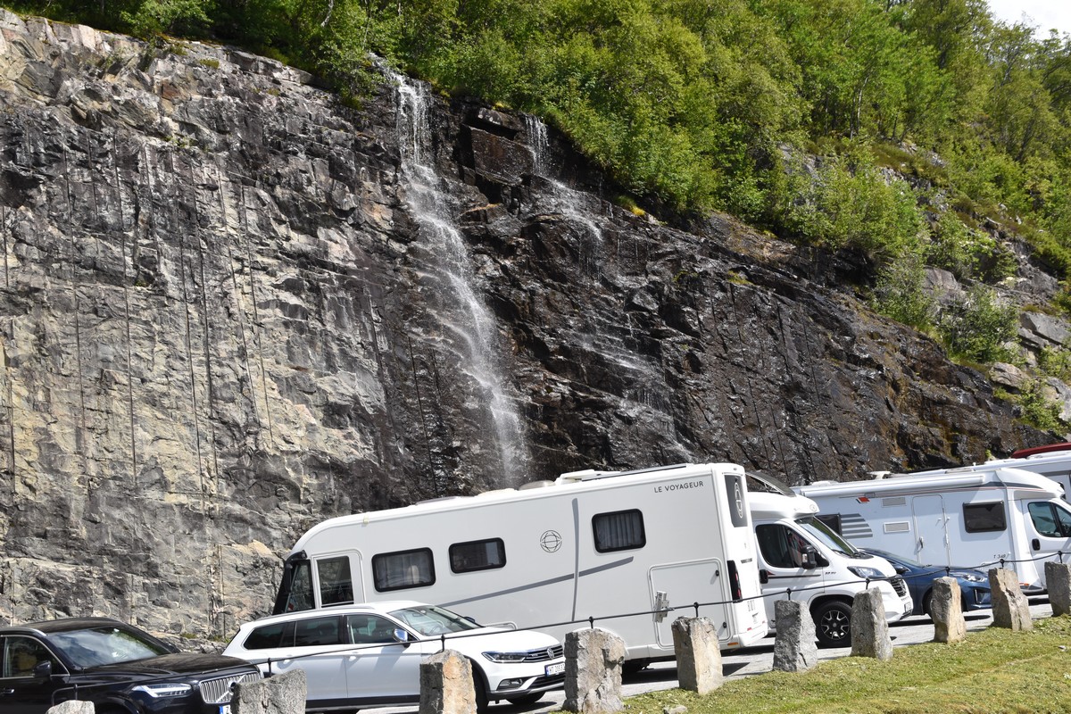 Ce jour, est un jour pas de chances!!! En effet, nous partons de notre parking-bivouac à une vingtaine de kilomètres d'Alesund pour rejoindre Andalsnes puis la route des trolls qui nous mènerait en haut des cascades à Trollstigen. Tout s'est bien passé jusqu'au début de la route des trolls que nous trouvons barrée avec un écriteau nous interdisant son passage pour cause de risques de glissement de terrain. Nous faisons quelques photos et... nous décidons de faire le tour pour admirer les chutes d'en haut... environ 120 Km... c'est faisable... puisque nous l'avons fait!!! Nous dormons le soir, bien fatigués, mais heureux sur le parking en haut à Trollstigen (nom de la route des trolls) (Coordonnées : 62.453375, 7.663351).