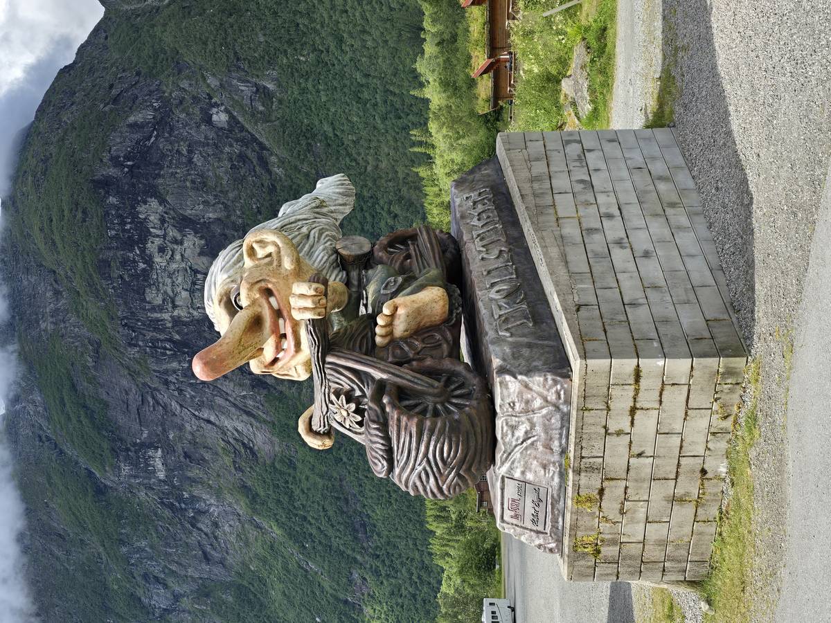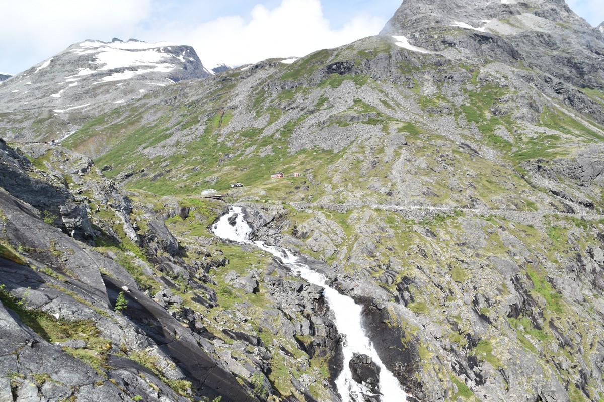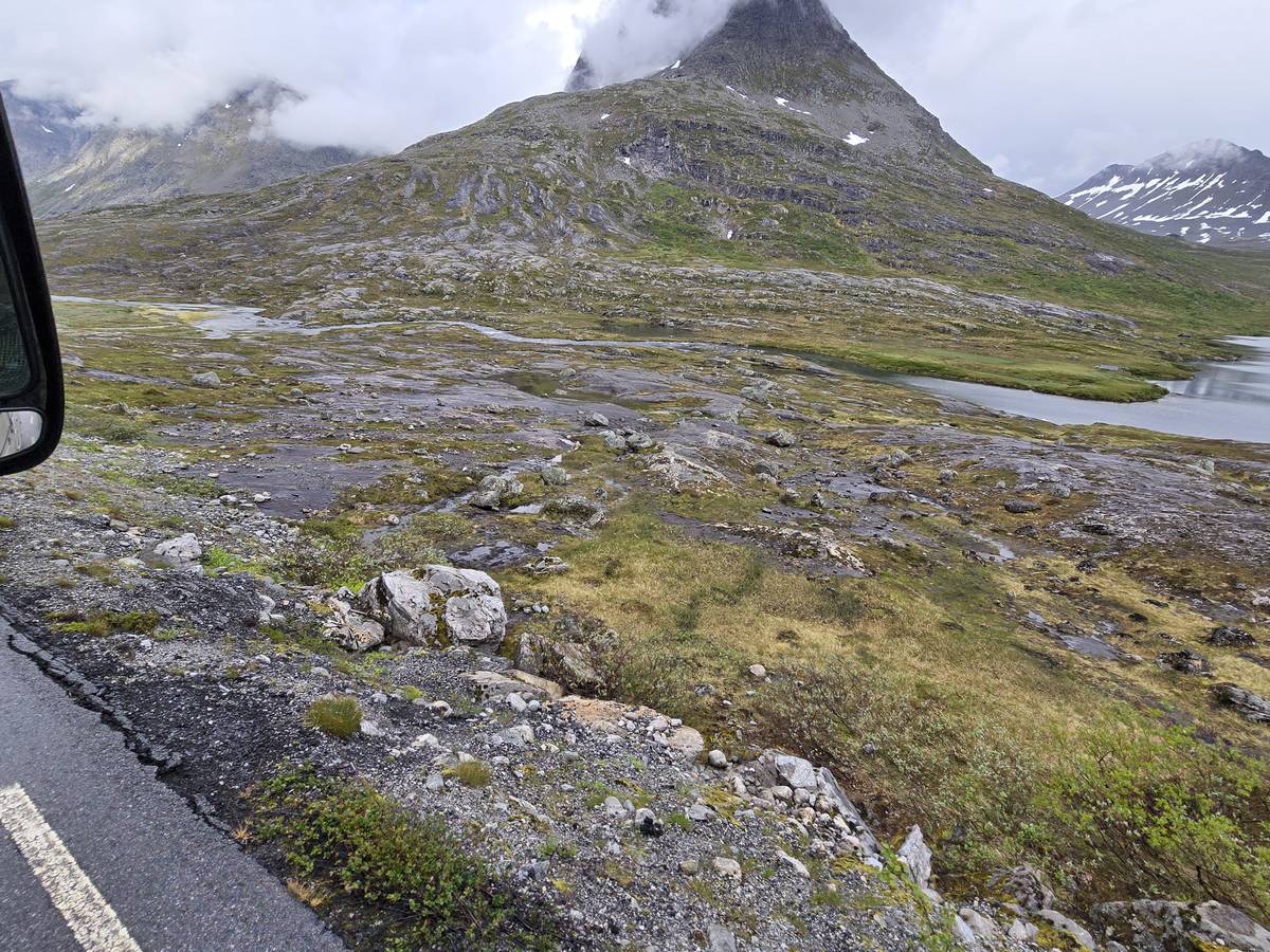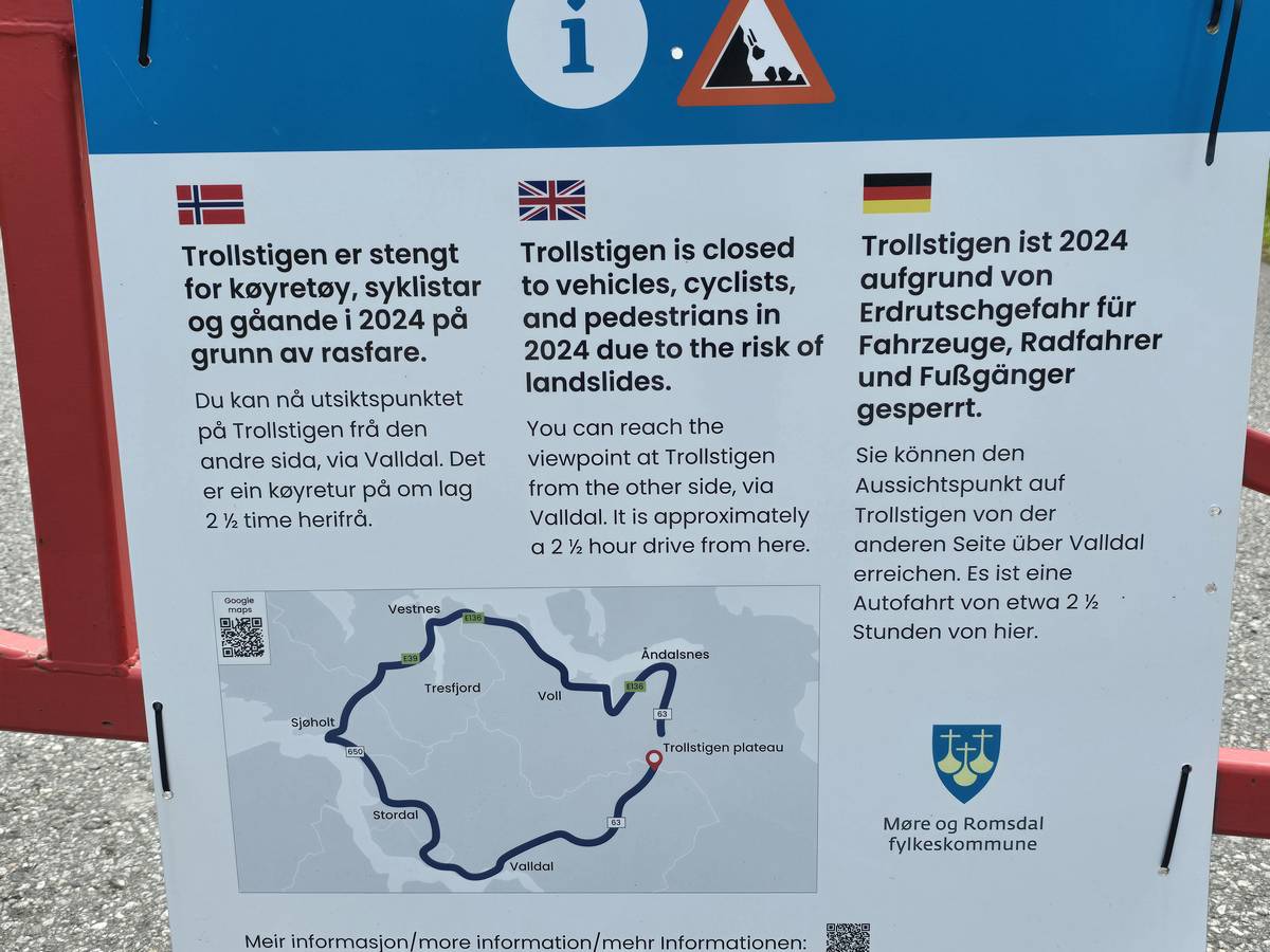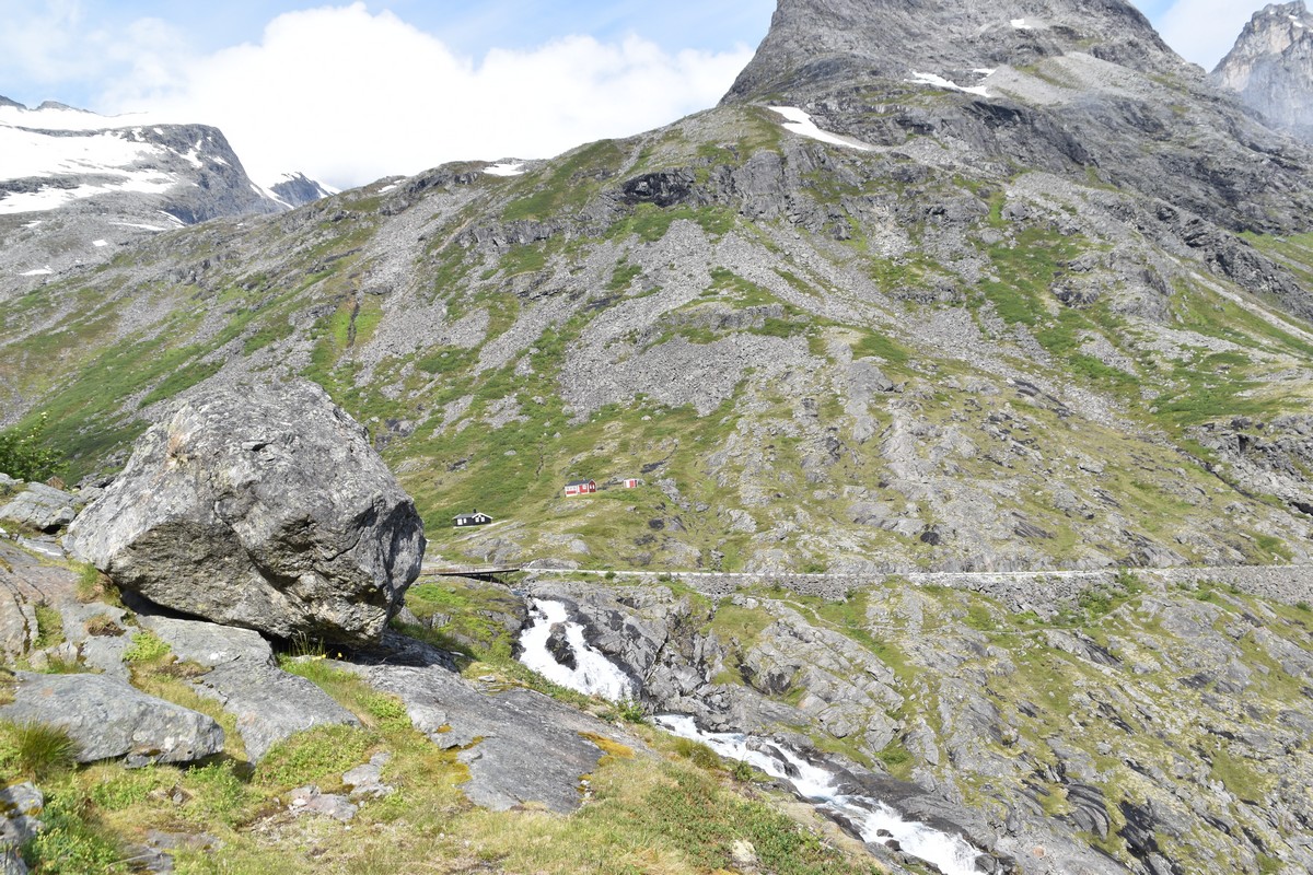 Ce jour, est un jour pas de chances!!! En effet, nous partons de notre parking-bivouac à une vingtaine de kilomètres d'Alesund pour rejoindre Andalsnes puis la route des trolls qui nous mènerait en haut des cascades à Trollstigen. Tout s'est bien passé jusqu'au début de la route des trolls que nous trouvons barrée avec un écriteau nous interdisant son passage pour cause de risques de glissement de terrain. Nous faisons quelques photos et... nous décidons de faire le tour pour admirer les chutes d'en haut... environ 120 Km... c'est faisable... puisque nous l'avons fait!!! Nous dormons le soir, bien fatigués, mais heureux sur le parking en haut à Trollstigen (nom de la route des trolls) (Coordonnées : 62.453375, 7.663351).