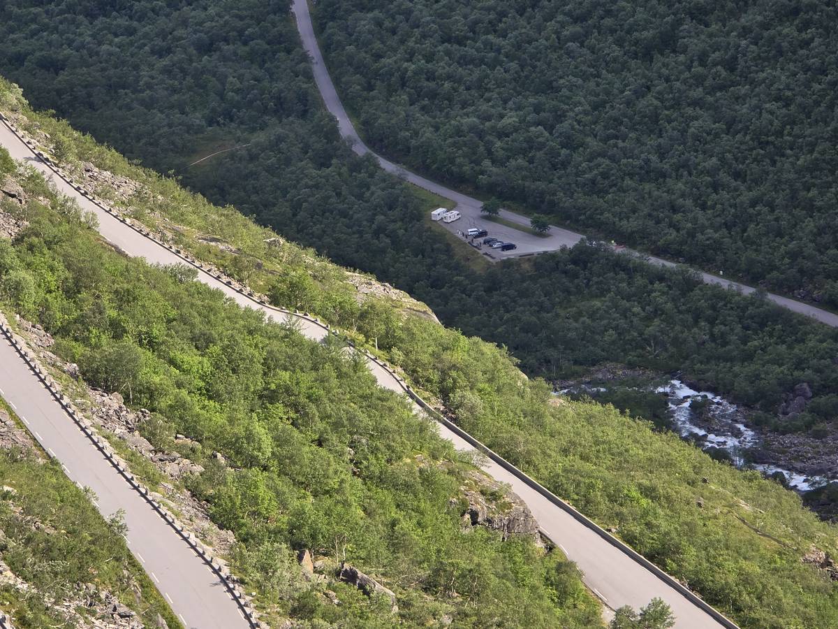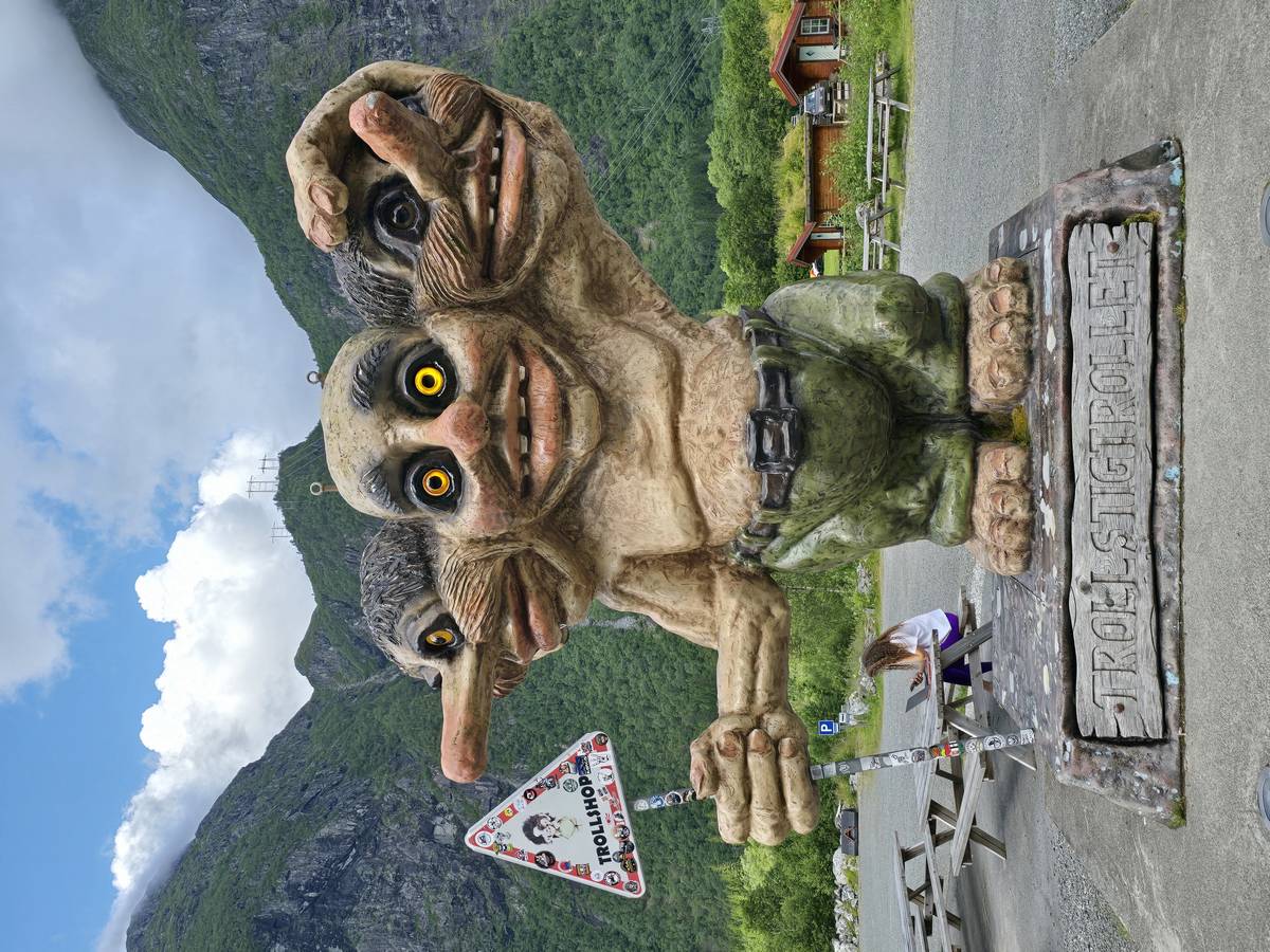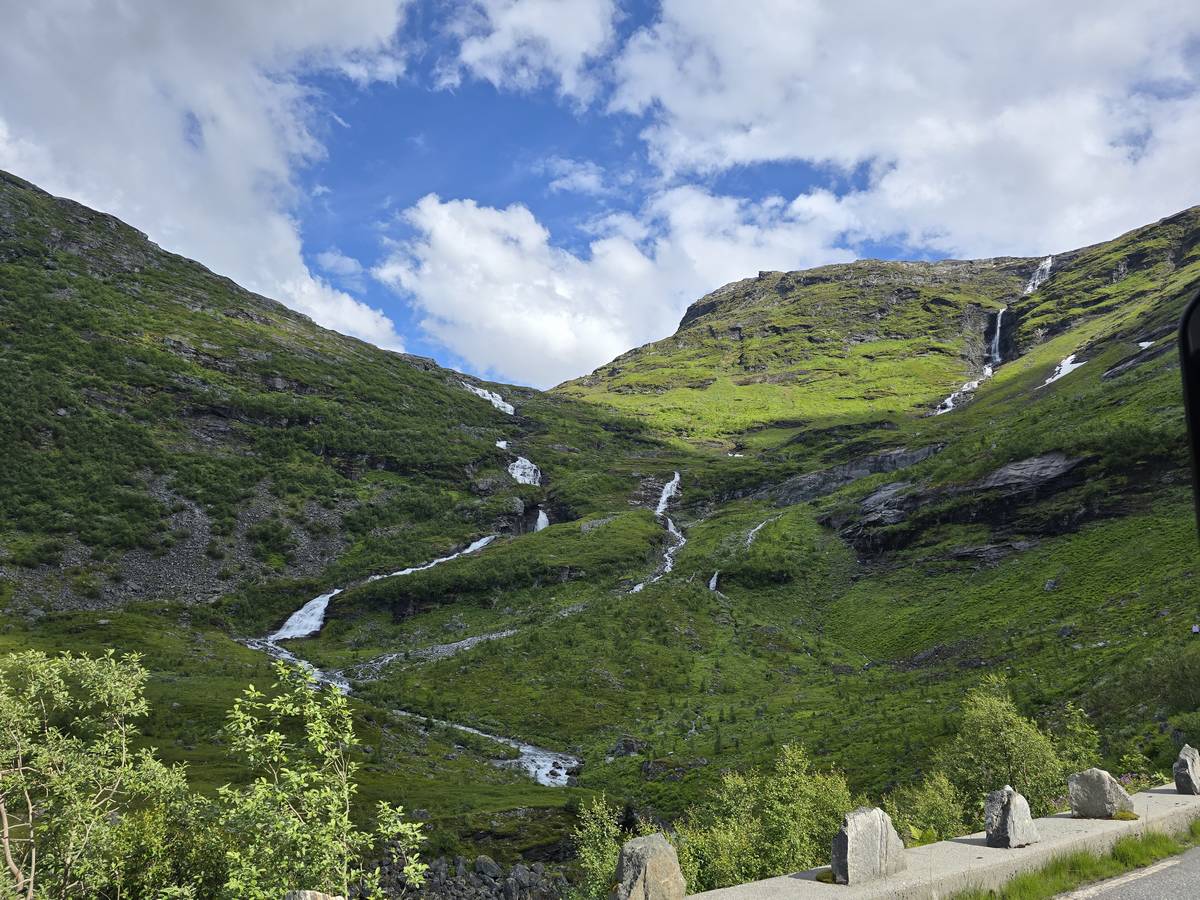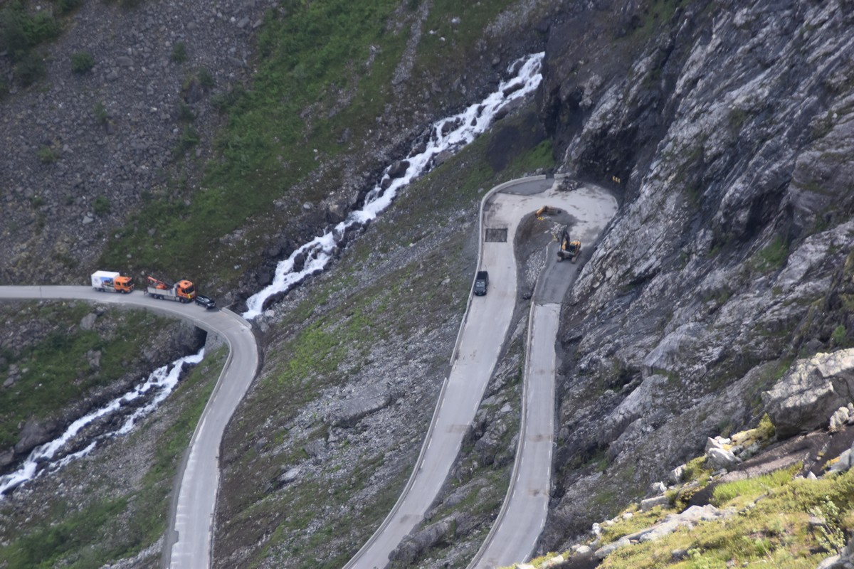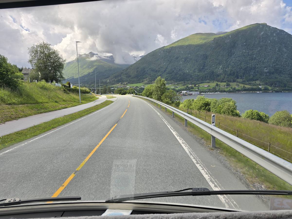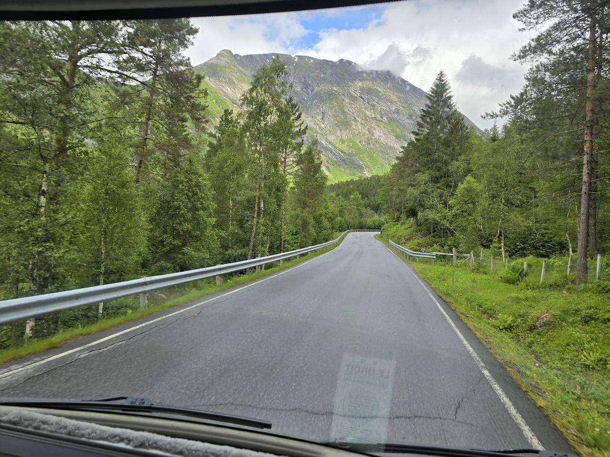 Ce jour, est un jour pas de chances!!! En effet, nous partons de notre parking-bivouac à une vingtaine de kilomètres d'Alesund pour rejoindre Andalsnes puis la route des trolls qui nous mènerait en haut des cascades à Trollstigen. Tout s'est bien passé jusqu'au début de la route des trolls que nous trouvons barrée avec un écriteau nous interdisant son passage pour cause de risques de glissement de terrain. Nous faisons quelques photos et... nous décidons de faire le tour pour admirer les chutes d'en haut... environ 120 Km... c'est faisable... puisque nous l'avons fait!!! Nous dormons le soir, bien fatigués, mais heureux sur le parking en haut à Trollstigen (nom de la route des trolls) (Coordonnées : 62.453375, 7.663351).