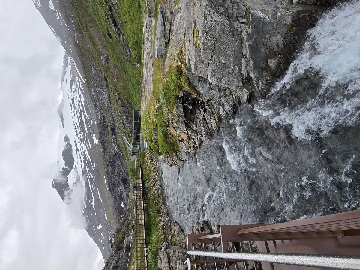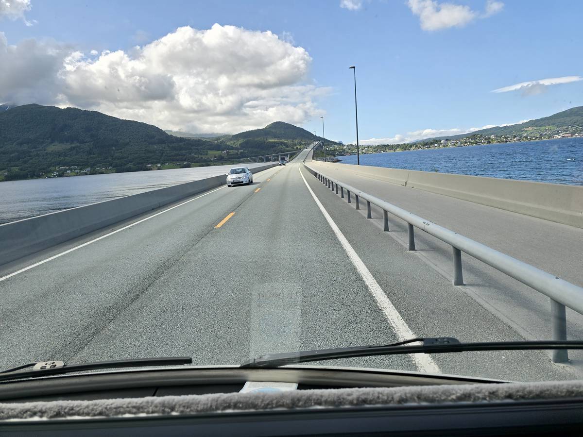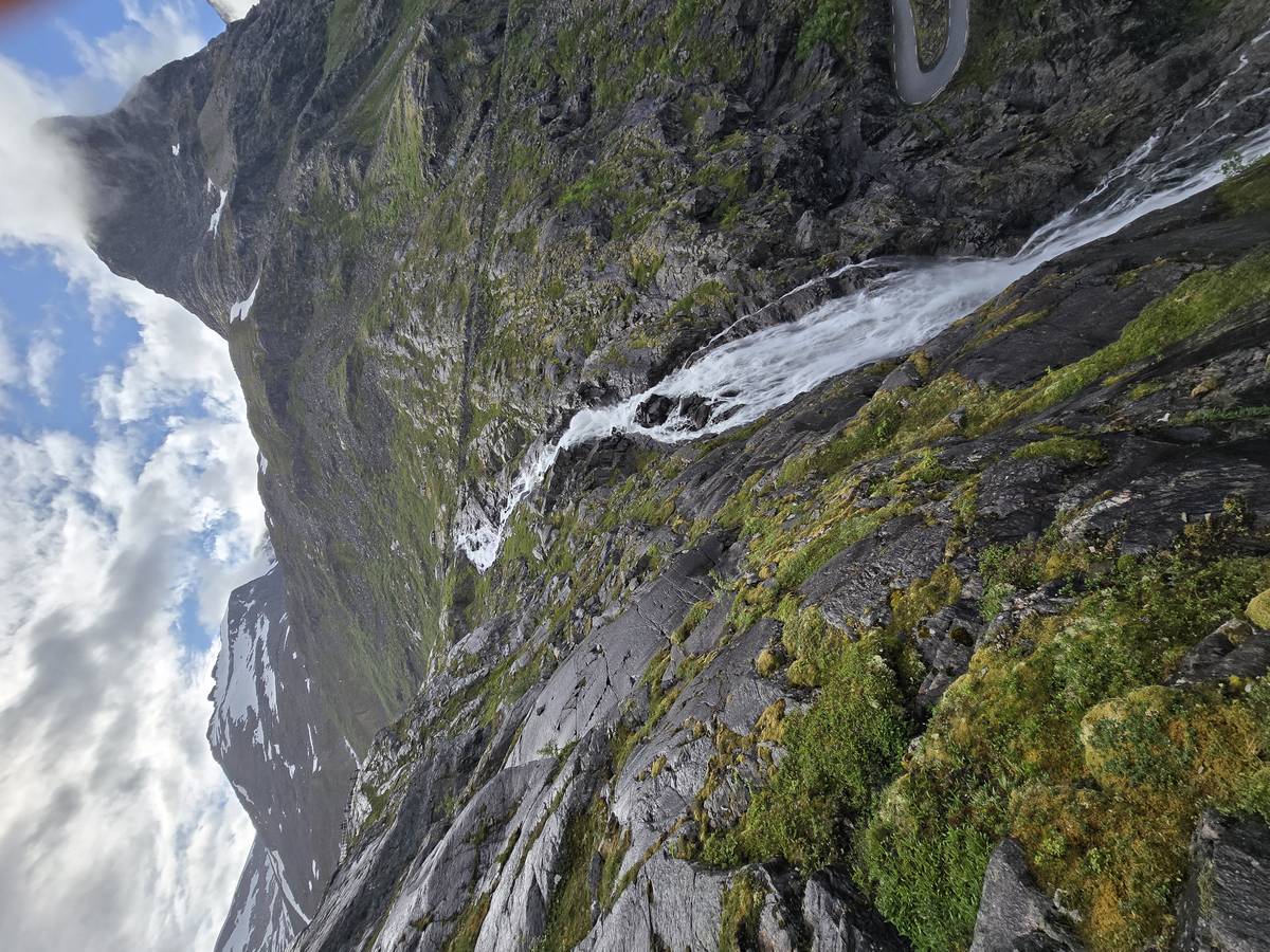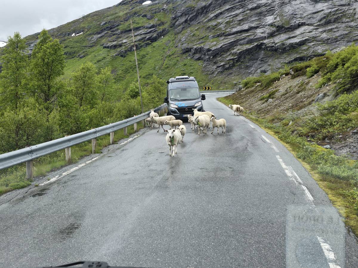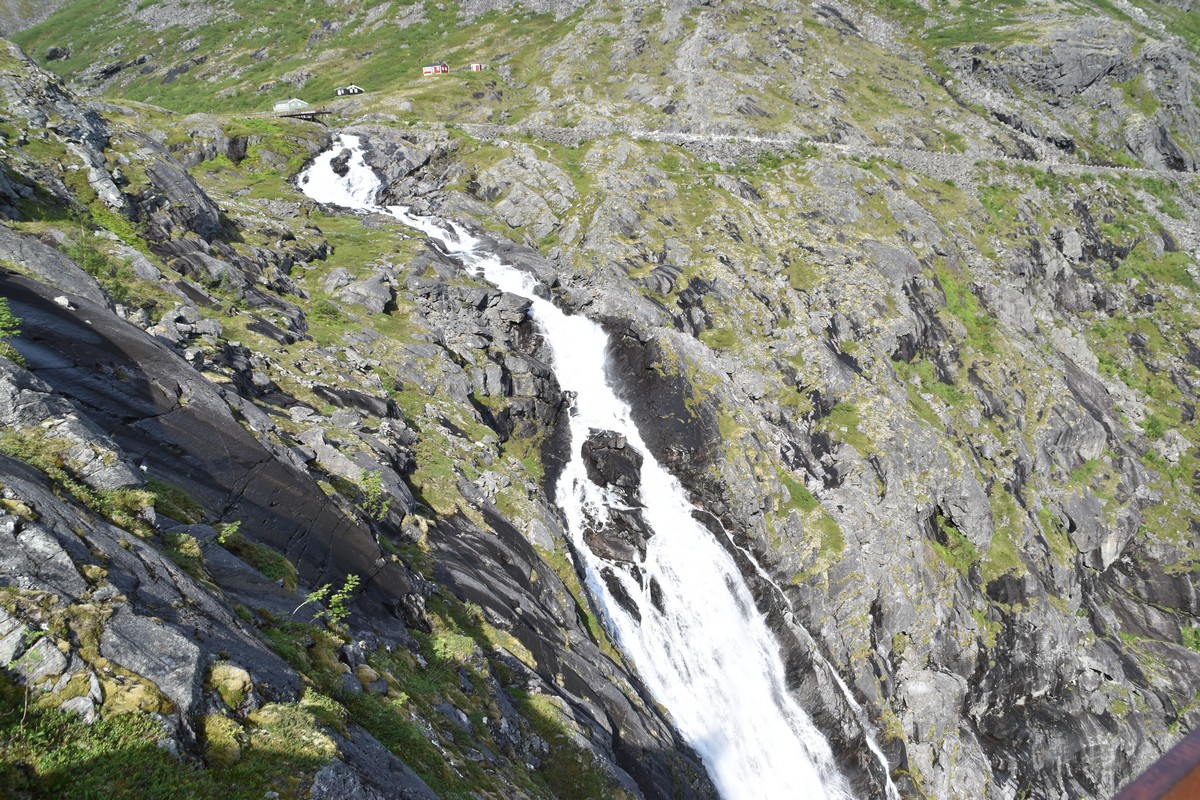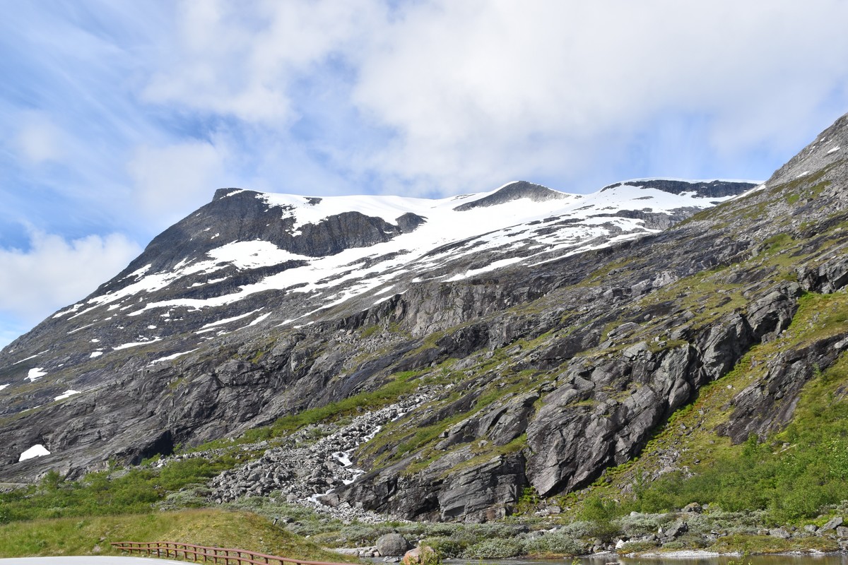 Ce jour, est un jour pas de chances!!! En effet, nous partons de notre parking-bivouac à une vingtaine de kilomètres d'Alesund pour rejoindre Andalsnes puis la route des trolls qui nous mènerait en haut des cascades à Trollstigen. Tout s'est bien passé jusqu'au début de la route des trolls que nous trouvons barrée avec un écriteau nous interdisant son passage pour cause de risques de glissement de terrain. Nous faisons quelques photos et... nous décidons de faire le tour pour admirer les chutes d'en haut... environ 120 Km... c'est faisable... puisque nous l'avons fait!!! Nous dormons le soir, bien fatigués, mais heureux sur le parking en haut à Trollstigen (nom de la route des trolls) (Coordonnées : 62.453375, 7.663351).