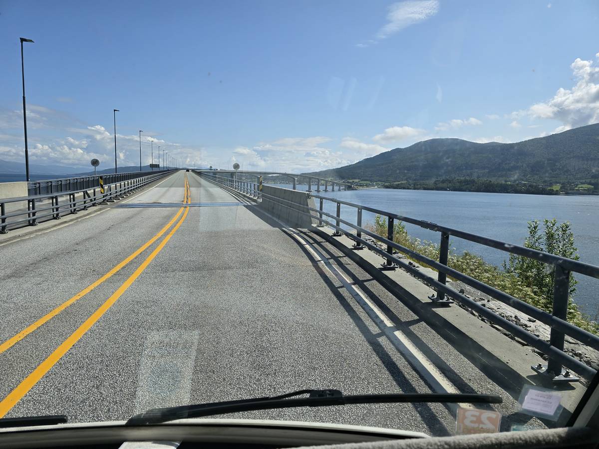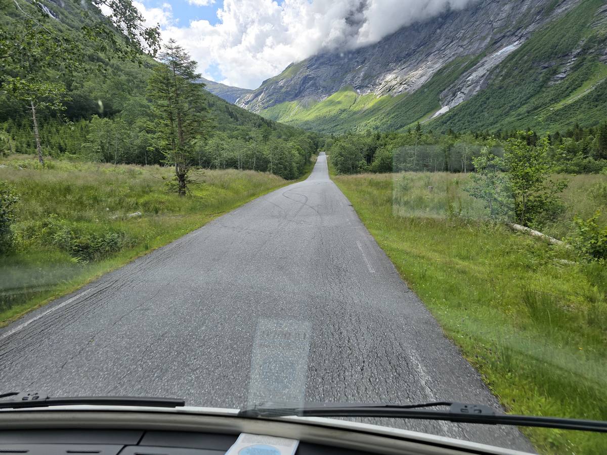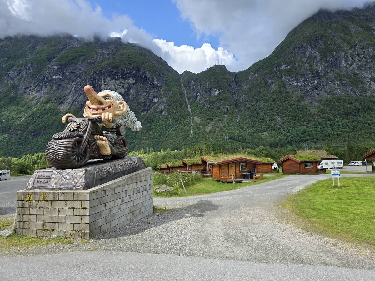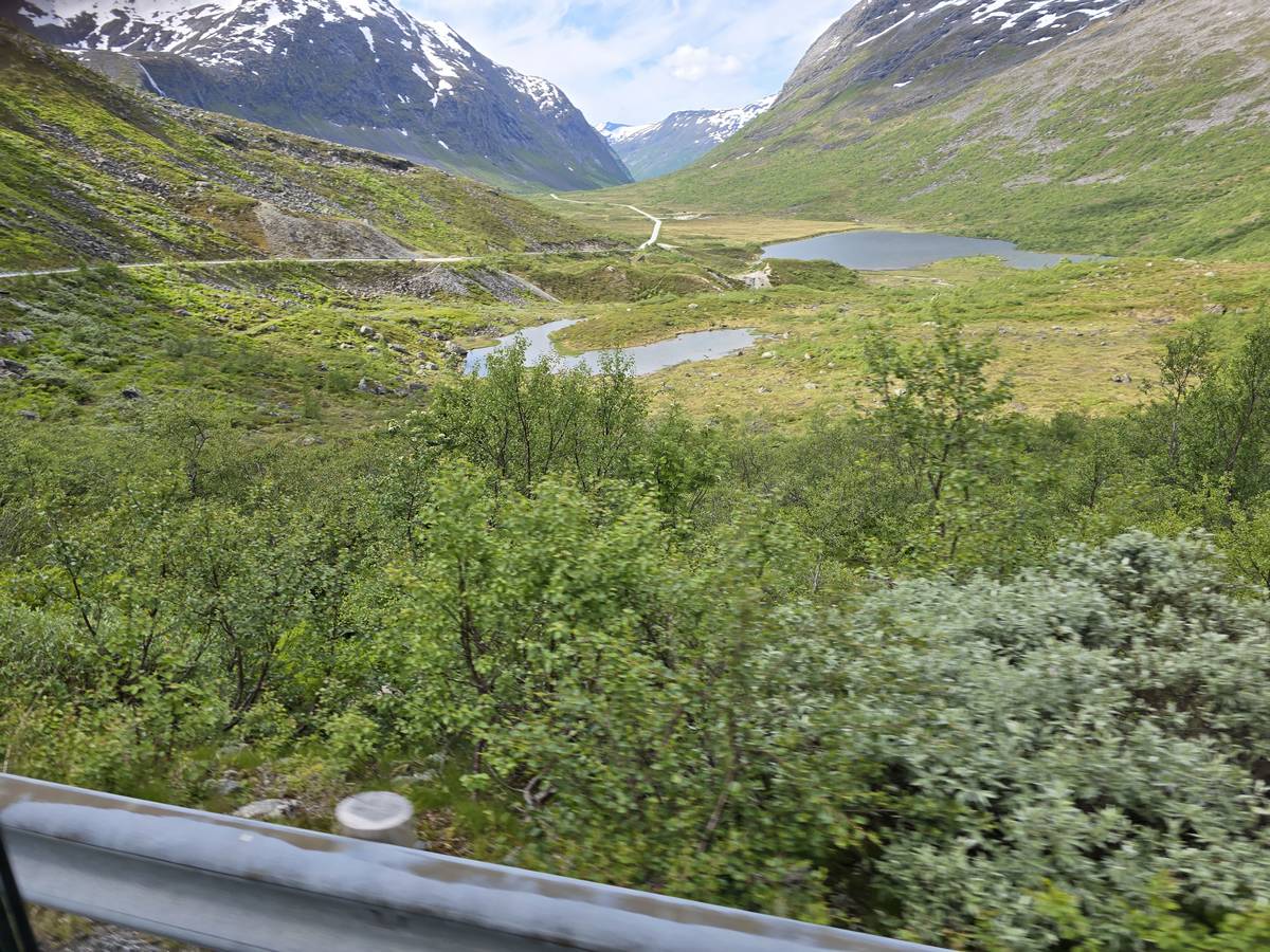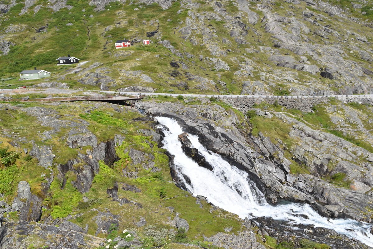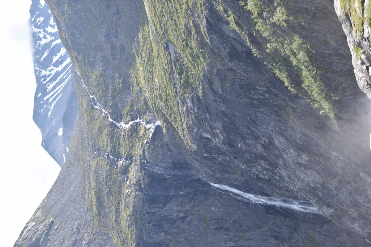 Ce jour, est un jour pas de chances!!! En effet, nous partons de notre parking-bivouac à une vingtaine de kilomètres d'Alesund pour rejoindre Andalsnes puis la route des trolls qui nous mènerait en haut des cascades à Trollstigen. Tout s'est bien passé jusqu'au début de la route des trolls que nous trouvons barrée avec un écriteau nous interdisant son passage pour cause de risques de glissement de terrain. Nous faisons quelques photos et... nous décidons de faire le tour pour admirer les chutes d'en haut... environ 120 Km... c'est faisable... puisque nous l'avons fait!!! Nous dormons le soir, bien fatigués, mais heureux sur le parking en haut à Trollstigen (nom de la route des trolls) (Coordonnées : 62.453375, 7.663351).