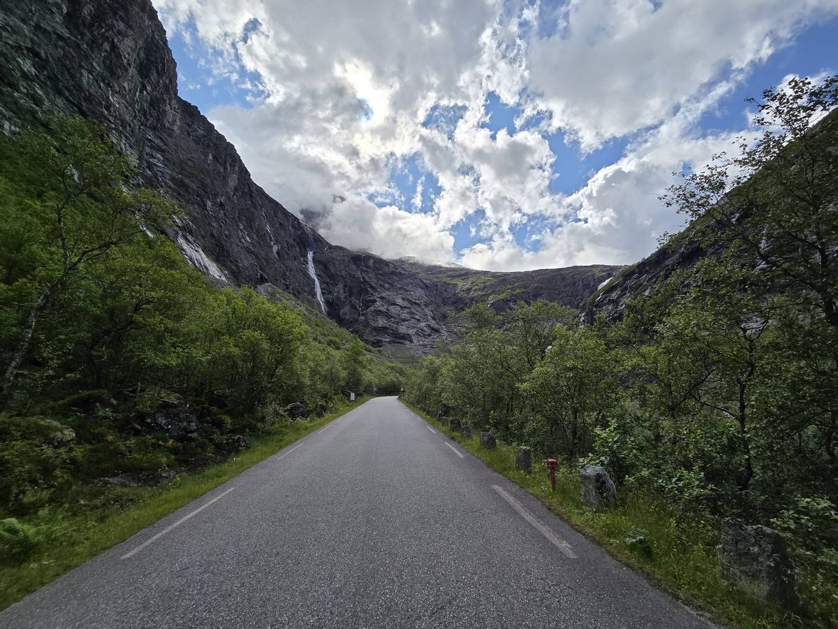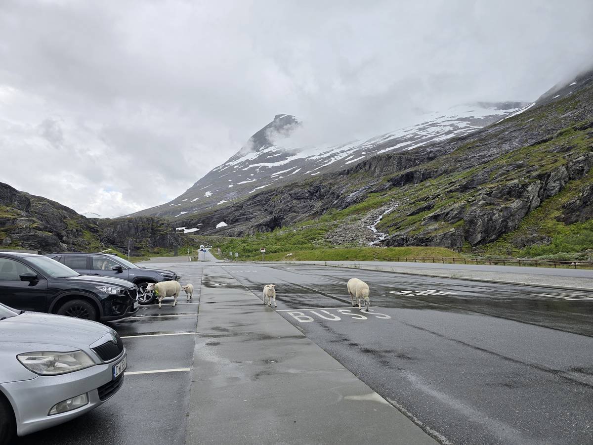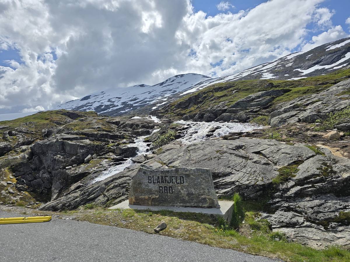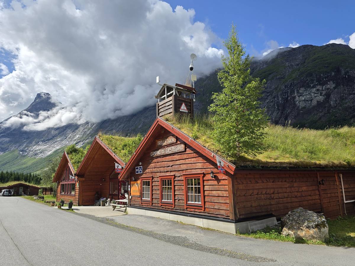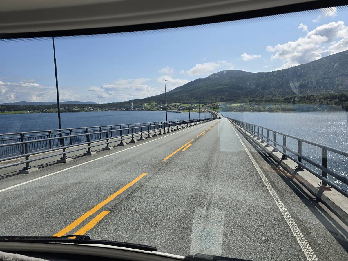 Ce jour, est un jour pas de chances!!! En effet, nous partons de notre parking-bivouac à une vingtaine de kilomètres d'Alesund pour rejoindre Andalsnes puis la route des trolls qui nous mènerait en haut des cascades à Trollstigen. Tout s'est bien passé jusqu'au début de la route des trolls que nous trouvons barrée avec un écriteau nous interdisant son passage pour cause de risques de glissement de terrain. Nous faisons quelques photos et... nous décidons de faire le tour pour admirer les chutes d'en haut... environ 120 Km... c'est faisable... puisque nous l'avons fait!!! Nous dormons le soir, bien fatigués, mais heureux sur le parking en haut à Trollstigen (nom de la route des trolls) (Coordonnées : 62.453375, 7.663351).