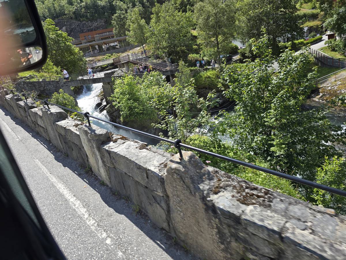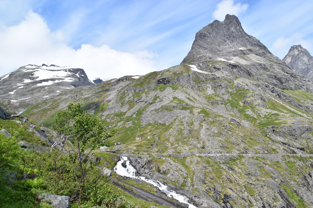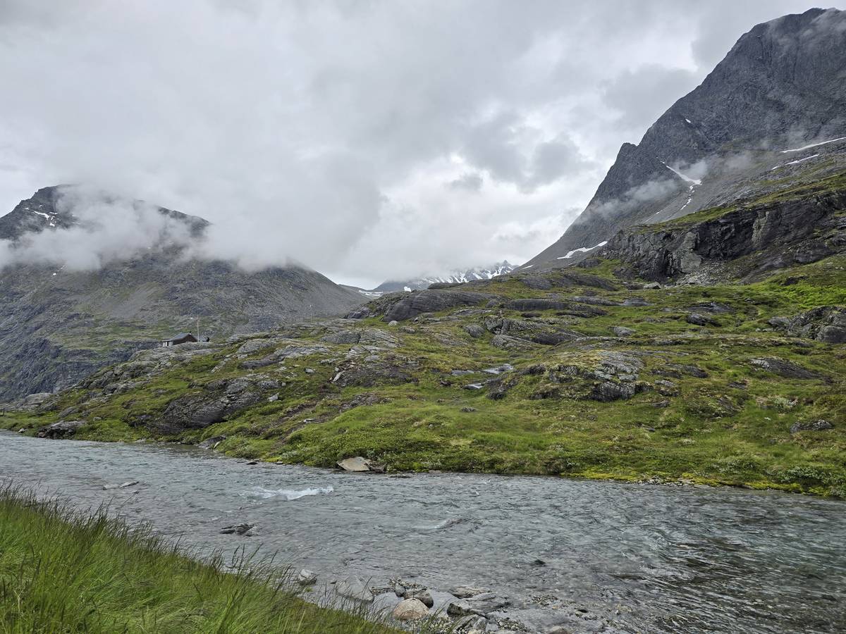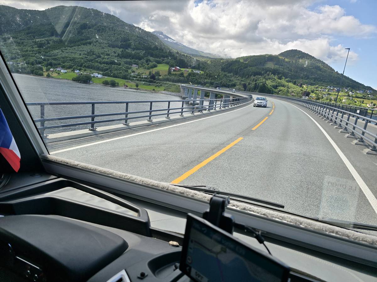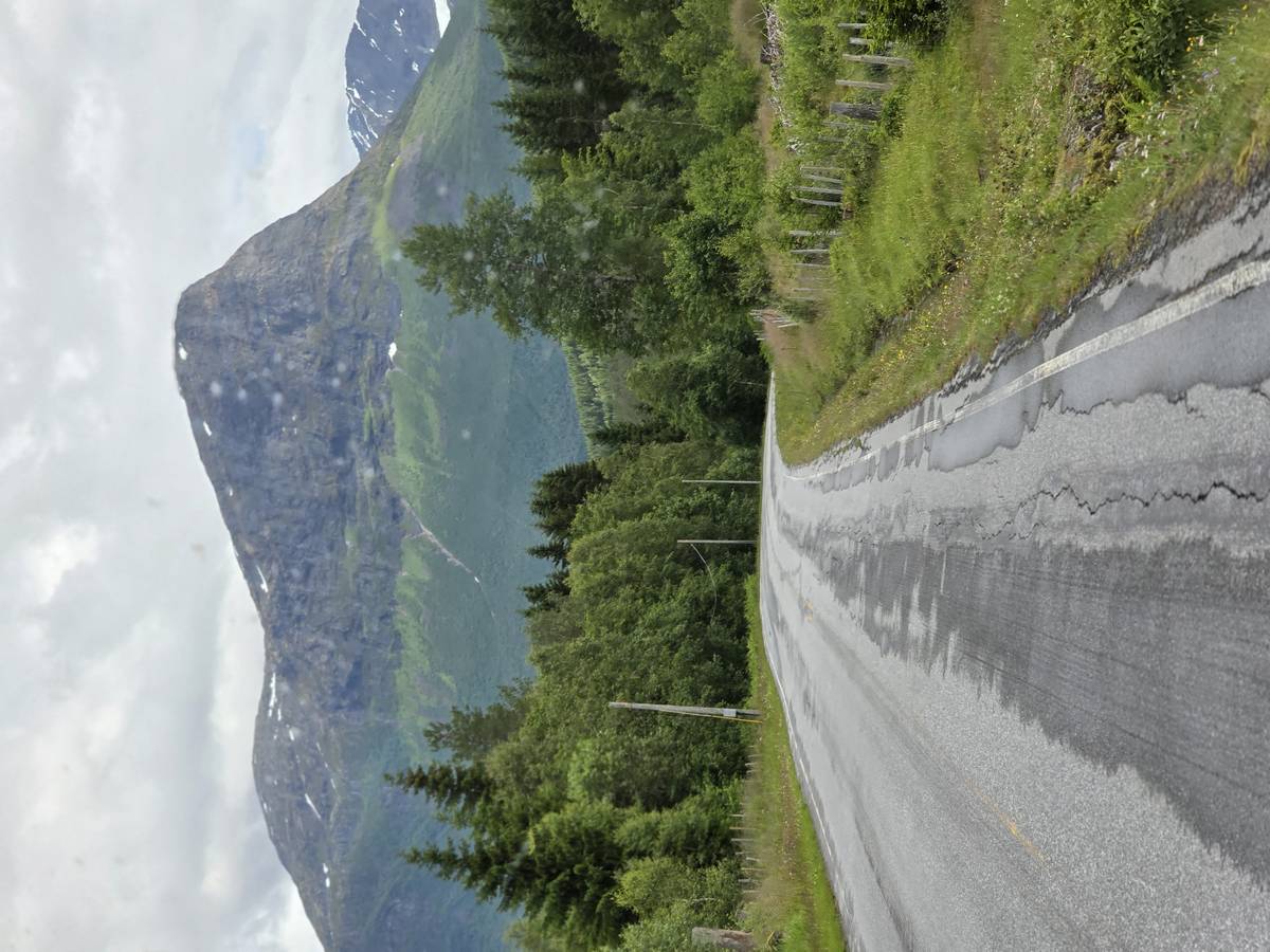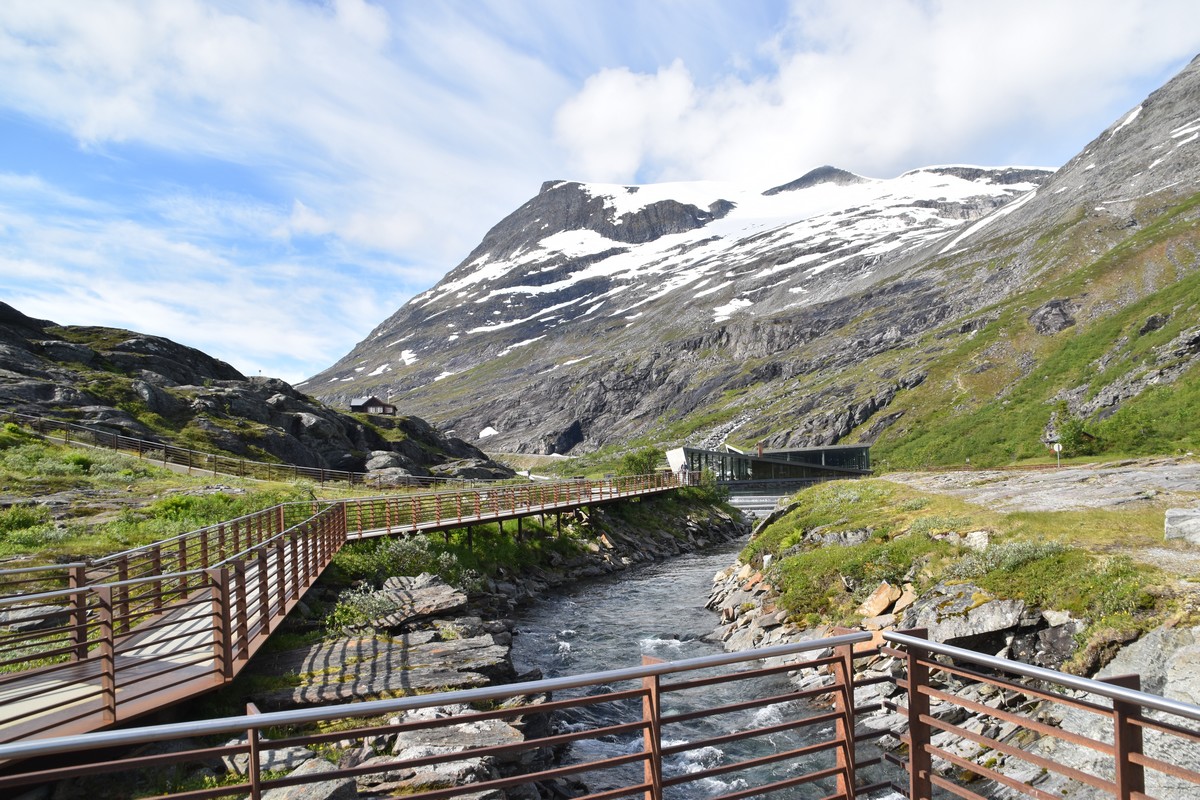 Ce jour, est un jour pas de chances!!! En effet, nous partons de notre parking-bivouac à une vingtaine de kilomètres d'Alesund pour rejoindre Andalsnes puis la route des trolls qui nous mènerait en haut des cascades à Trollstigen. Tout s'est bien passé jusqu'au début de la route des trolls que nous trouvons barrée avec un écriteau nous interdisant son passage pour cause de risques de glissement de terrain. Nous faisons quelques photos et... nous décidons de faire le tour pour admirer les chutes d'en haut... environ 120 Km... c'est faisable... puisque nous l'avons fait!!! Nous dormons le soir, bien fatigués, mais heureux sur le parking en haut à Trollstigen (nom de la route des trolls) (Coordonnées : 62.453375, 7.663351).