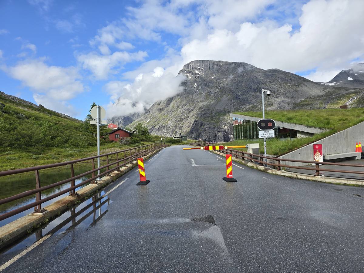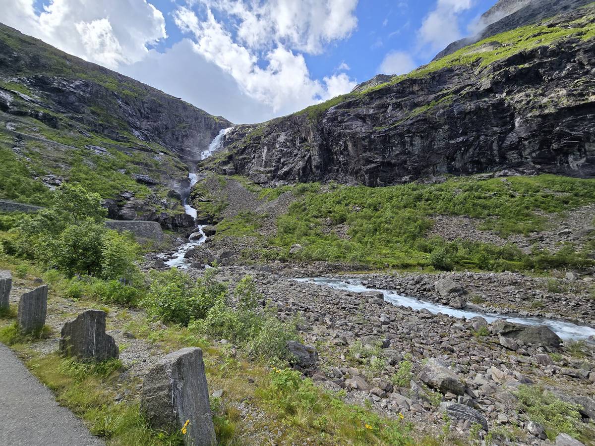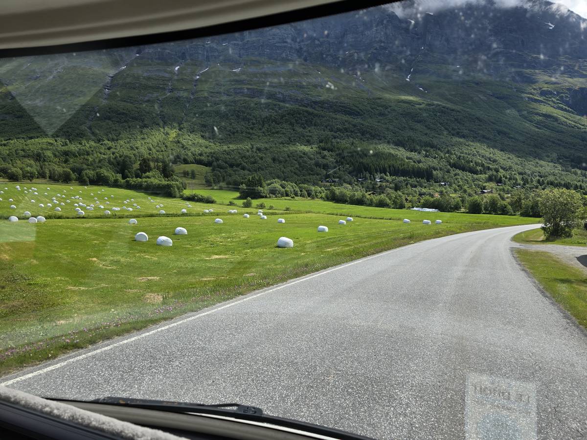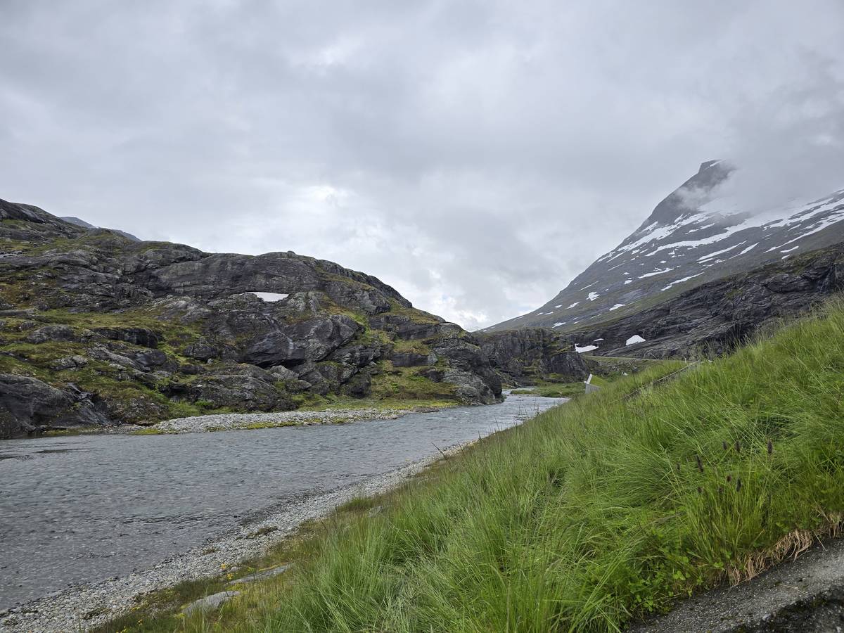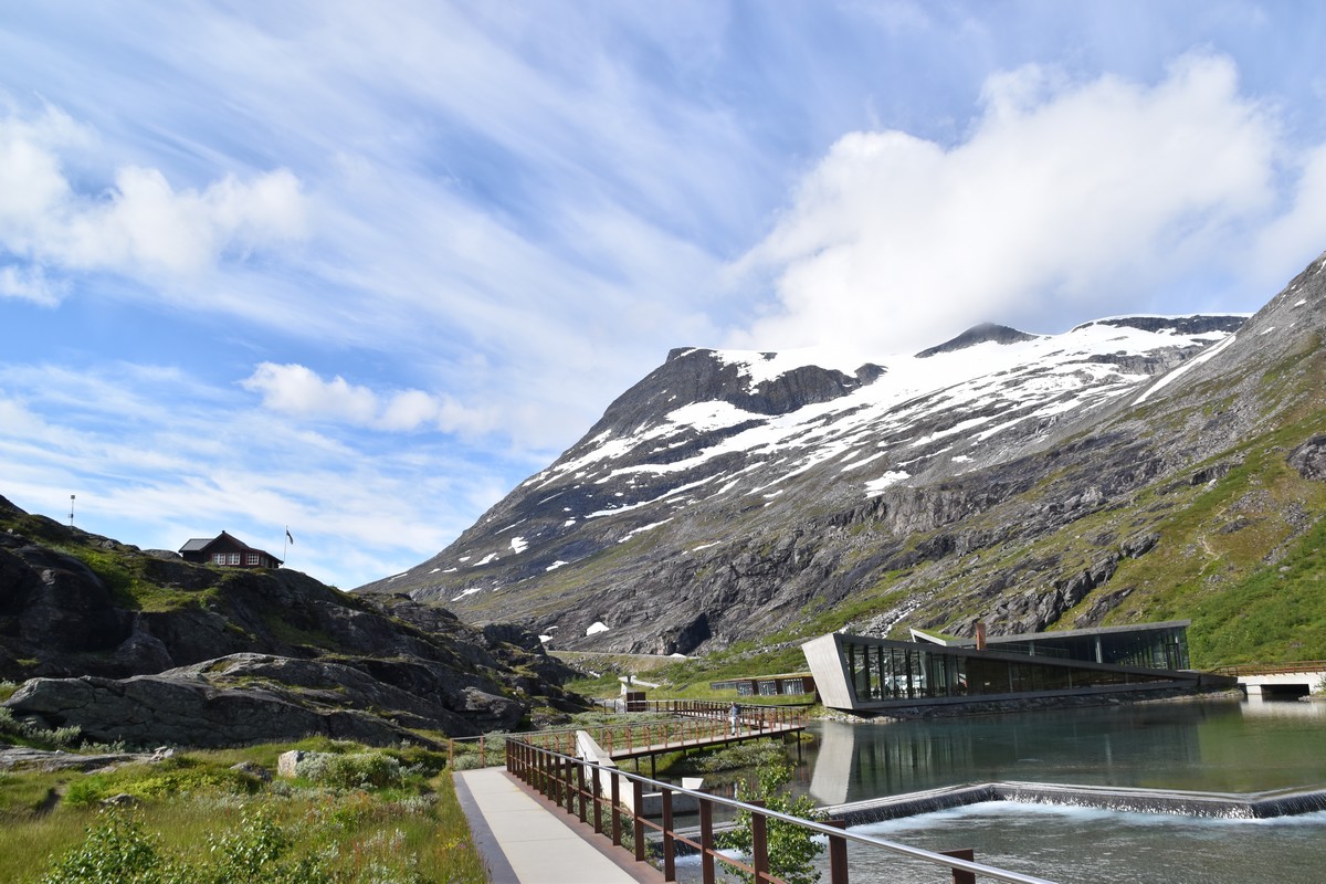 Ce jour, est un jour pas de chances!!! En effet, nous partons de notre parking-bivouac à une vingtaine de kilomètres d'Alesund pour rejoindre Andalsnes puis la route des trolls qui nous mènerait en haut des cascades à Trollstigen. Tout s'est bien passé jusqu'au début de la route des trolls que nous trouvons barrée avec un écriteau nous interdisant son passage pour cause de risques de glissement de terrain. Nous faisons quelques photos et... nous décidons de faire le tour pour admirer les chutes d'en haut... environ 120 Km... c'est faisable... puisque nous l'avons fait!!! Nous dormons le soir, bien fatigués, mais heureux sur le parking en haut à Trollstigen (nom de la route des trolls) (Coordonnées : 62.453375, 7.663351).