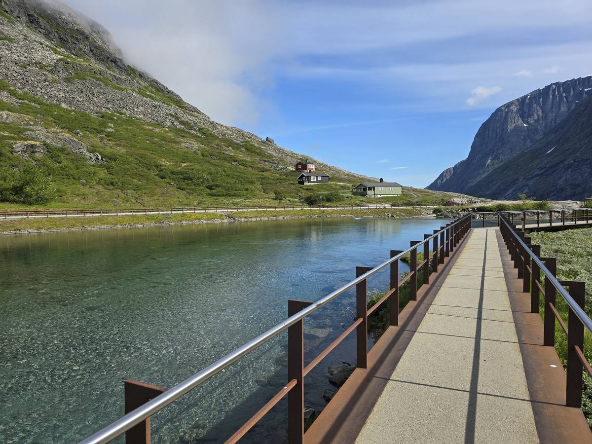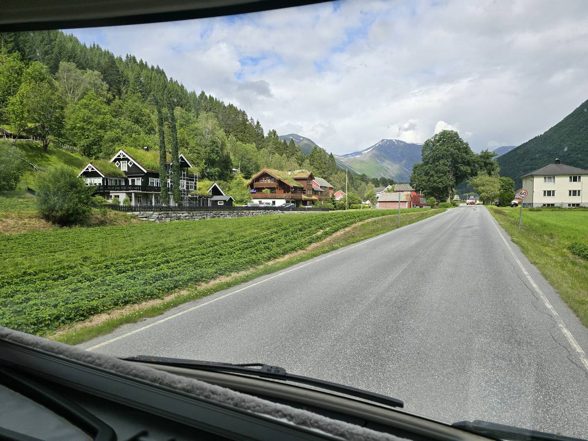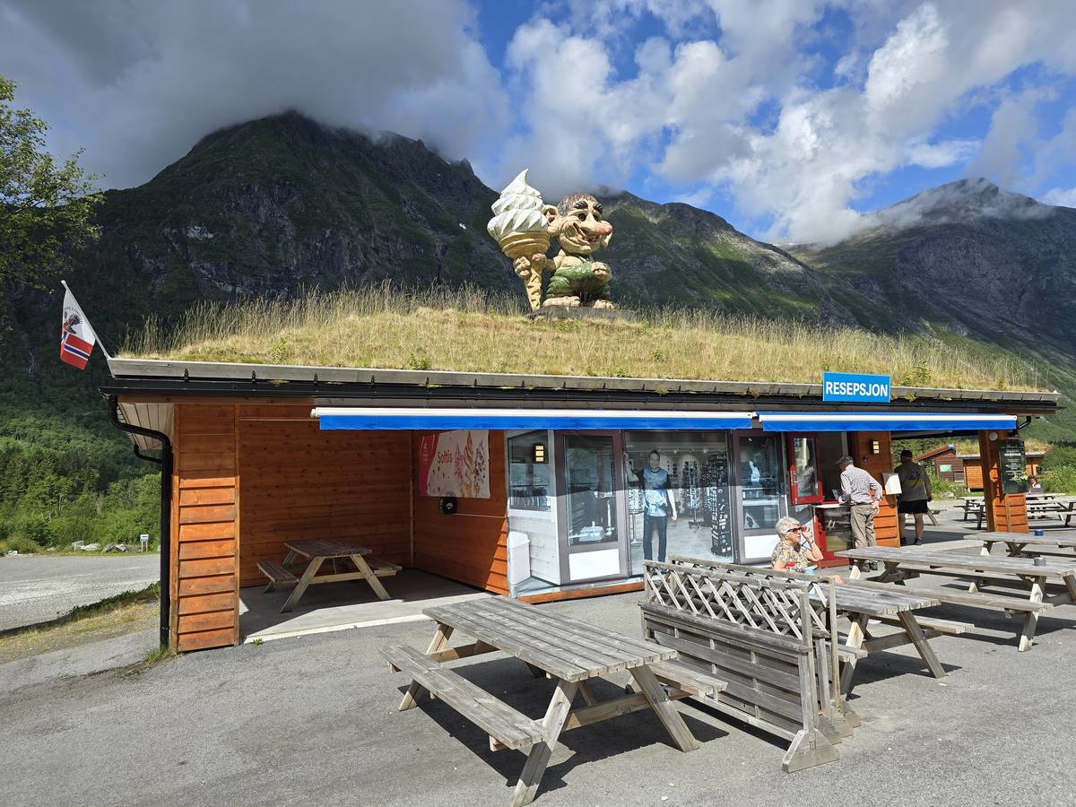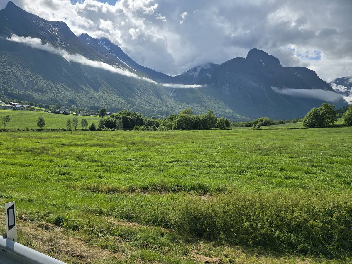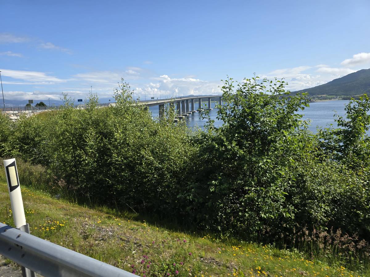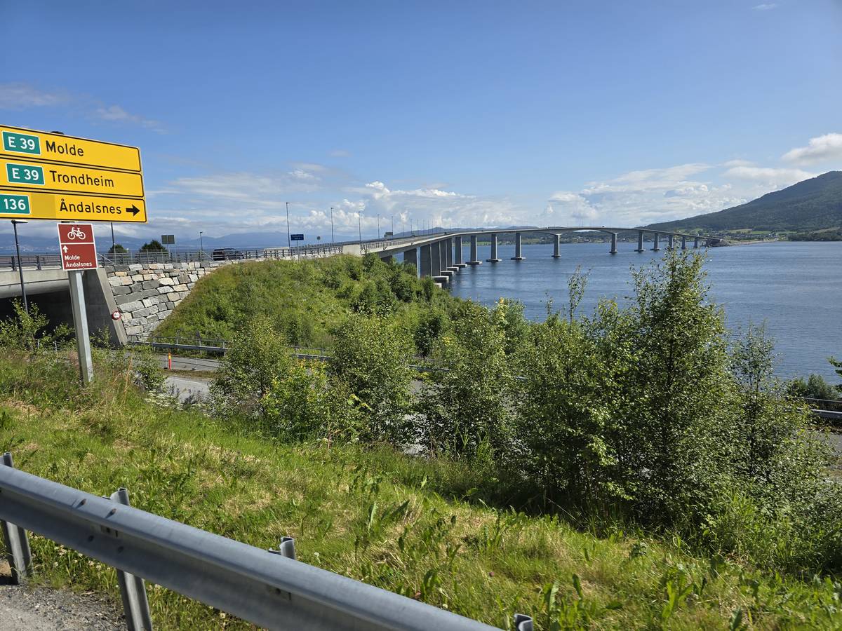 Ce jour, est un jour pas de chances!!! En effet, nous partons de notre parking-bivouac à une vingtaine de kilomètres d'Alesund pour rejoindre Andalsnes puis la route des trolls qui nous mènerait en haut des cascades à Trollstigen. Tout s'est bien passé jusqu'au début de la route des trolls que nous trouvons barrée avec un écriteau nous interdisant son passage pour cause de risques de glissement de terrain. Nous faisons quelques photos et... nous décidons de faire le tour pour admirer les chutes d'en haut... environ 120 Km... c'est faisable... puisque nous l'avons fait!!! Nous dormons le soir, bien fatigués, mais heureux sur le parking en haut à Trollstigen (nom de la route des trolls) (Coordonnées : 62.453375, 7.663351).