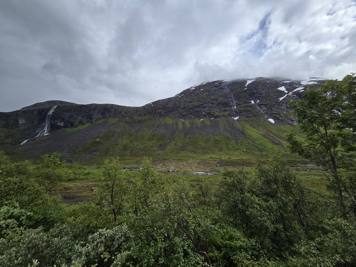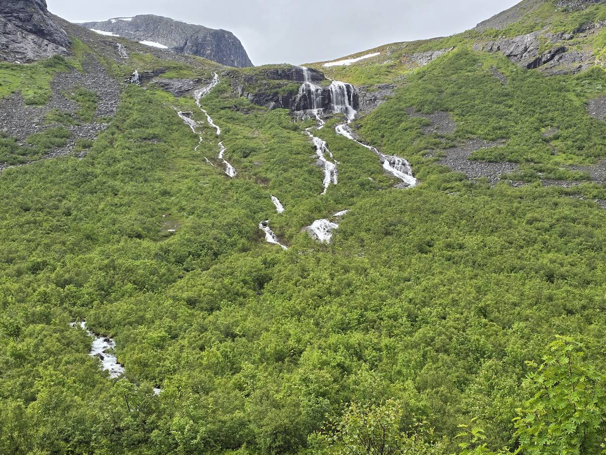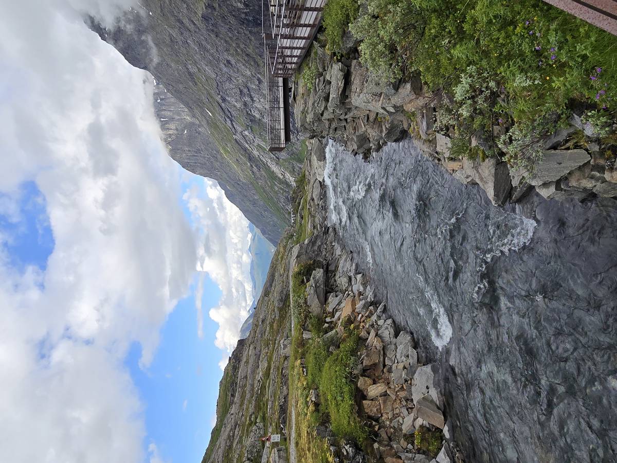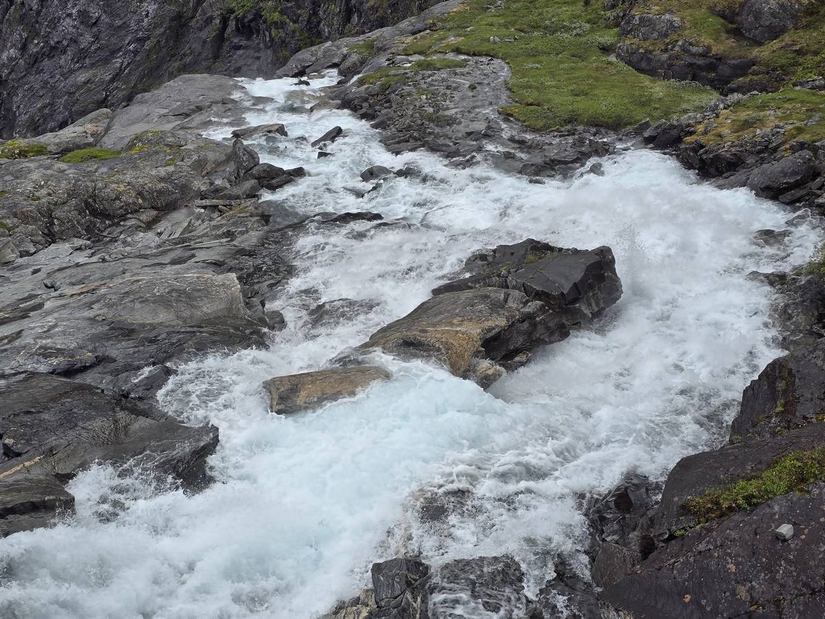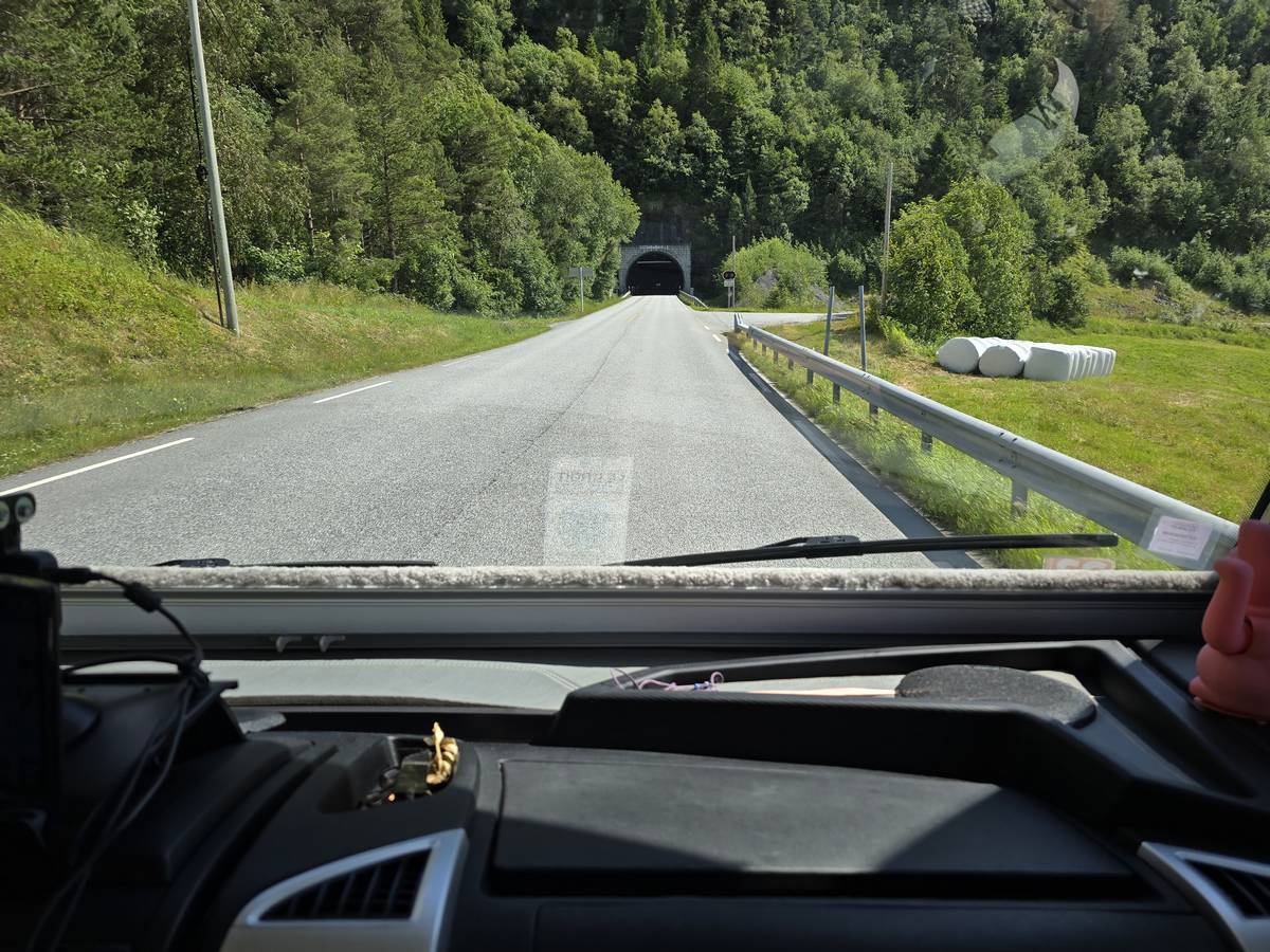 Ce jour, est un jour pas de chances!!! En effet, nous partons de notre parking-bivouac à une vingtaine de kilomètres d'Alesund pour rejoindre Andalsnes puis la route des trolls qui nous mènerait en haut des cascades à Trollstigen. Tout s'est bien passé jusqu'au début de la route des trolls que nous trouvons barrée avec un écriteau nous interdisant son passage pour cause de risques de glissement de terrain. Nous faisons quelques photos et... nous décidons de faire le tour pour admirer les chutes d'en haut... environ 120 Km... c'est faisable... puisque nous l'avons fait!!! Nous dormons le soir, bien fatigués, mais heureux sur le parking en haut à Trollstigen (nom de la route des trolls) (Coordonnées : 62.453375, 7.663351).