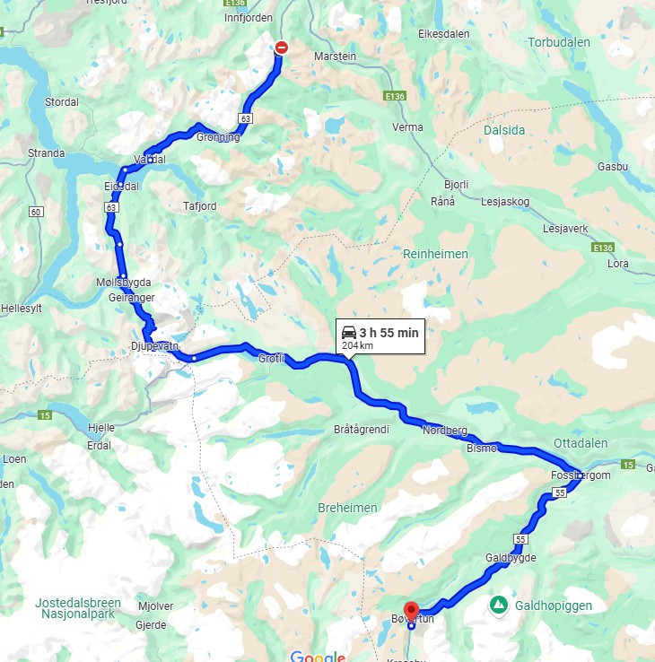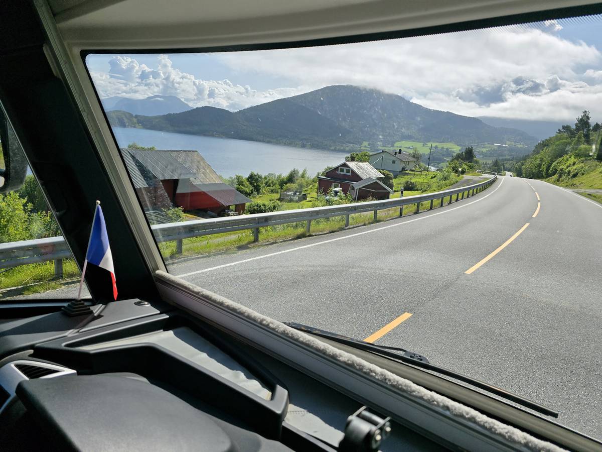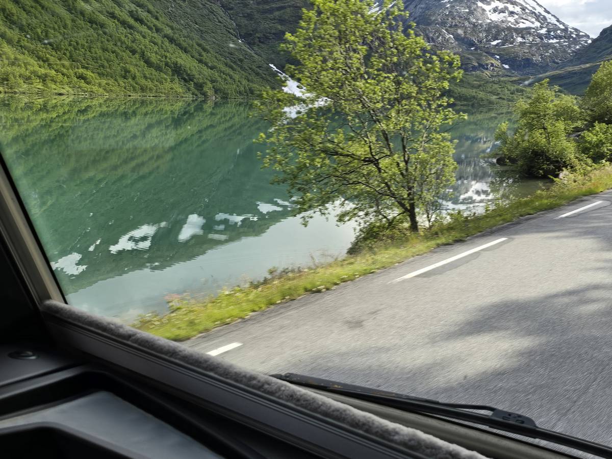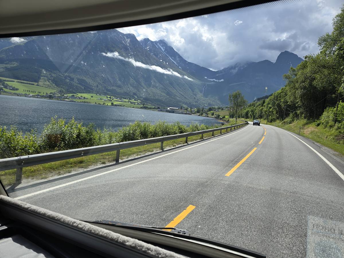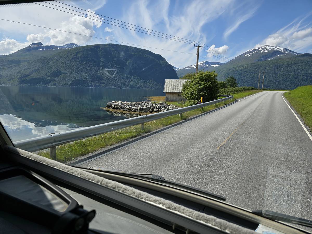 Aujourd'hui, nous ferons de la route, mais une route superbe nous menant à Lom et passant par La route des aigles et Geiranger. Nous trouverons sur notre route des montées et des descentes supérieures à 10%!!! Nous dormirons après Lom sur la route 55 (Coordonnées : 61.627082, 8.048620).