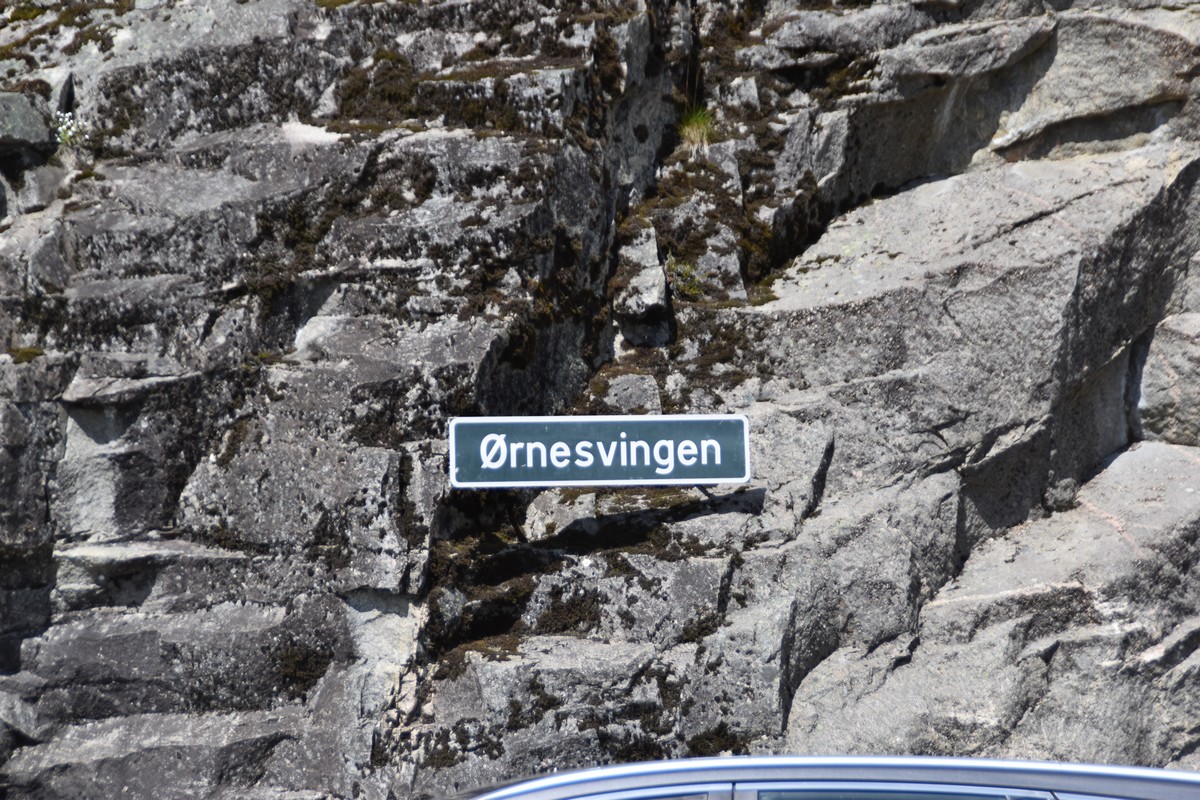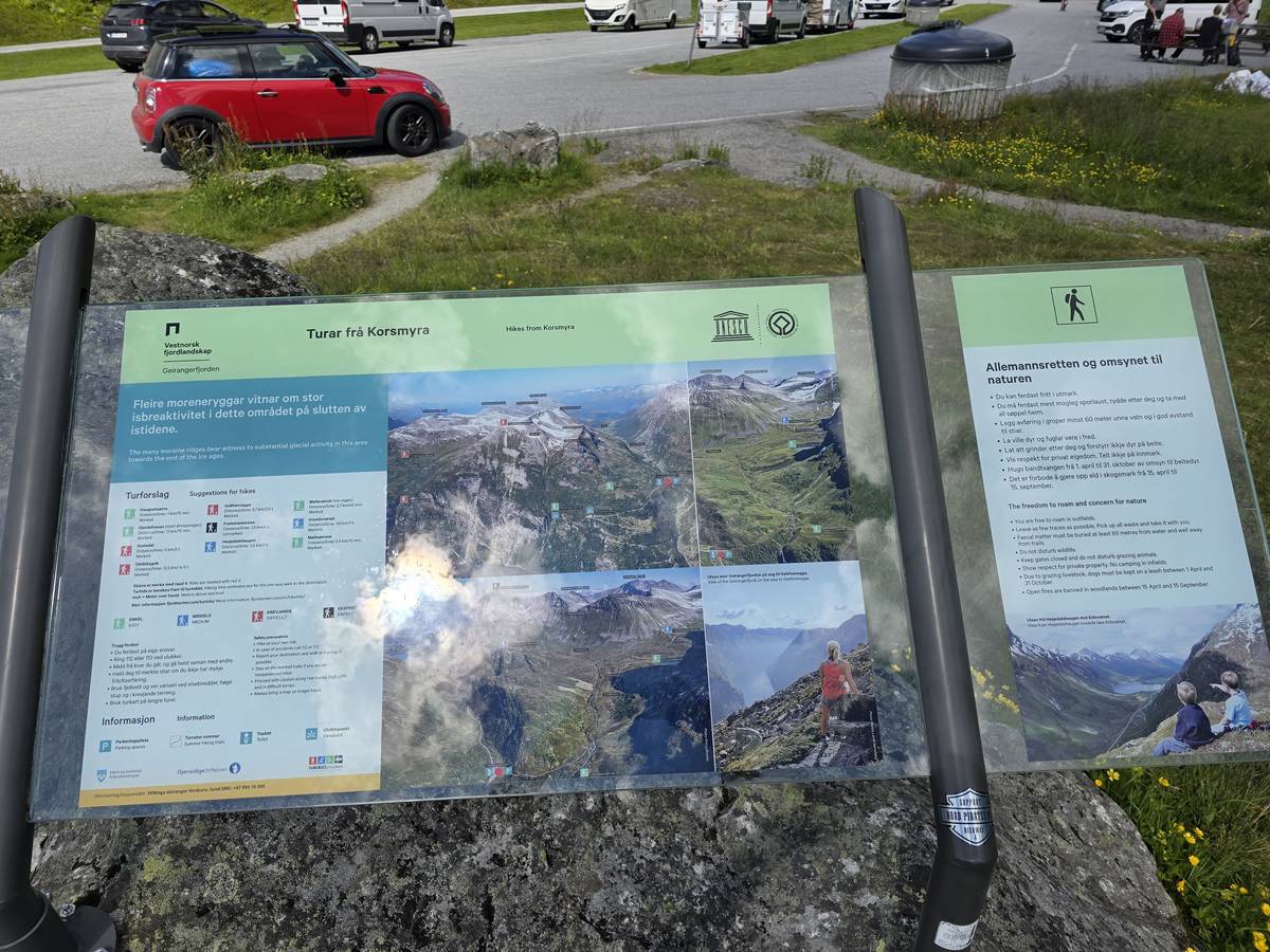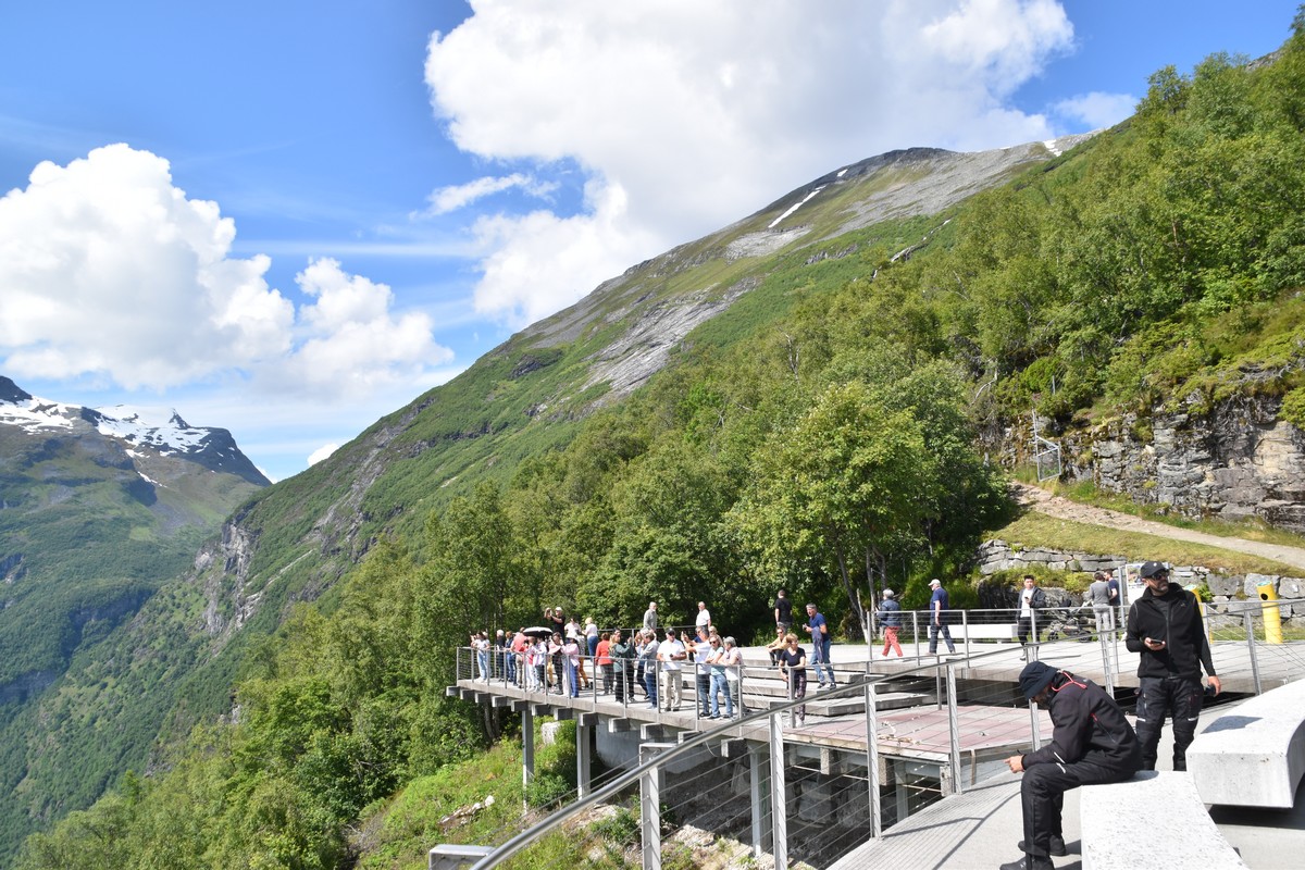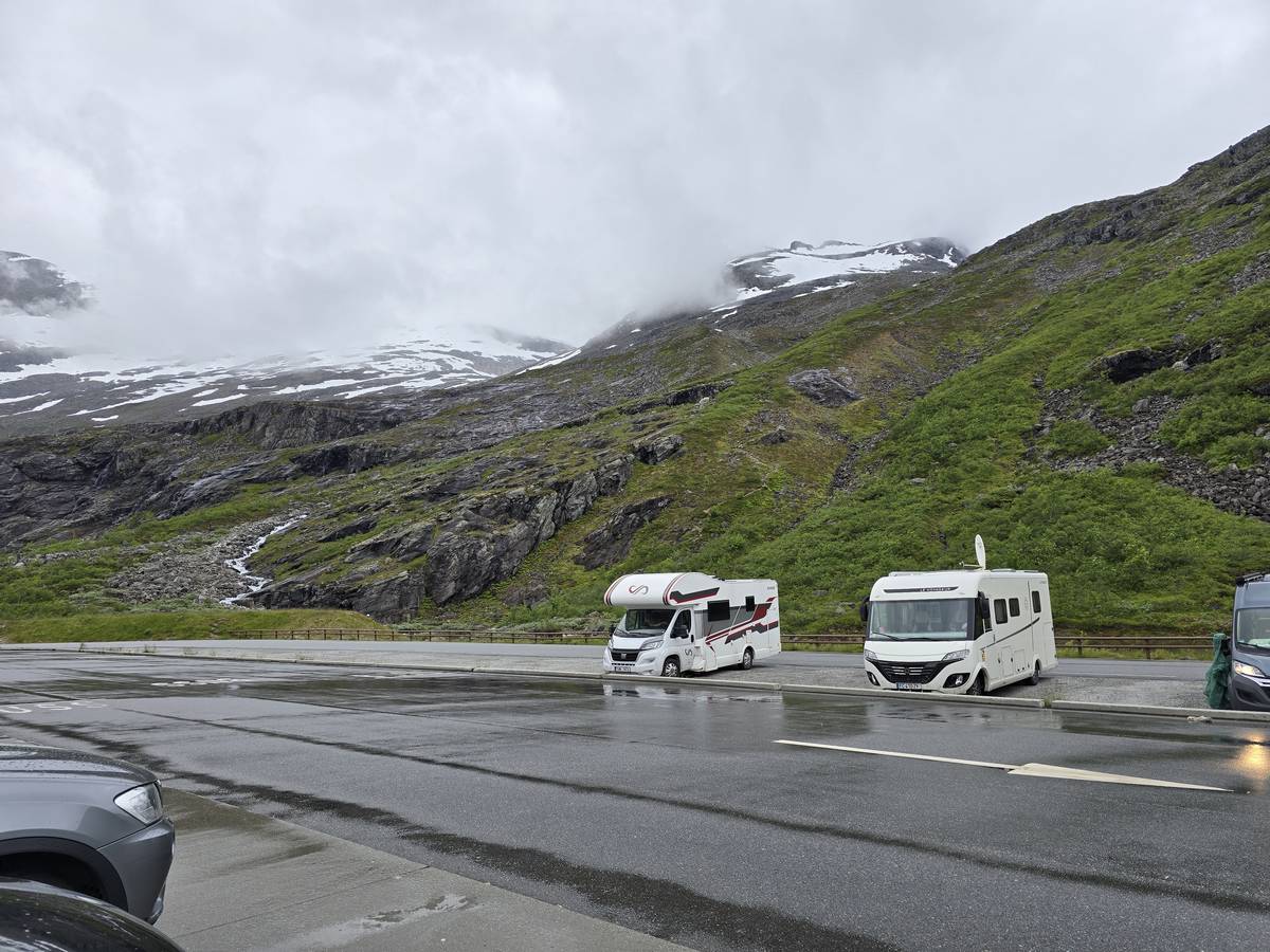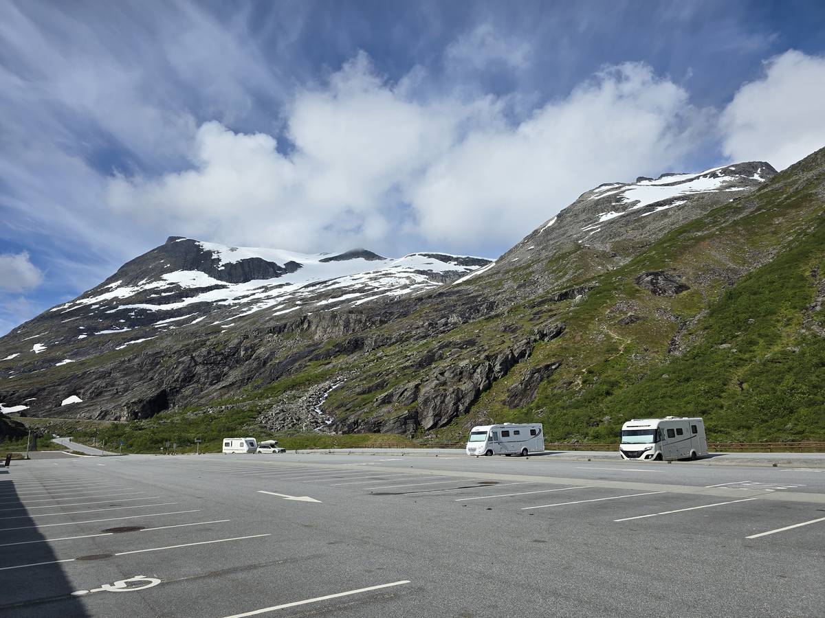Nous nous arrêtons au sommet de la route des aigles (Orneveien), pour une pause avant la descente vers Geiranger. Nous avons la chance de trouver une place où garer le camping-car au virage des aigles (Ornesvongen) ce qui nous a permis de prendre de belles photos sur Geiranger et son fjord (Geirangerfjord).