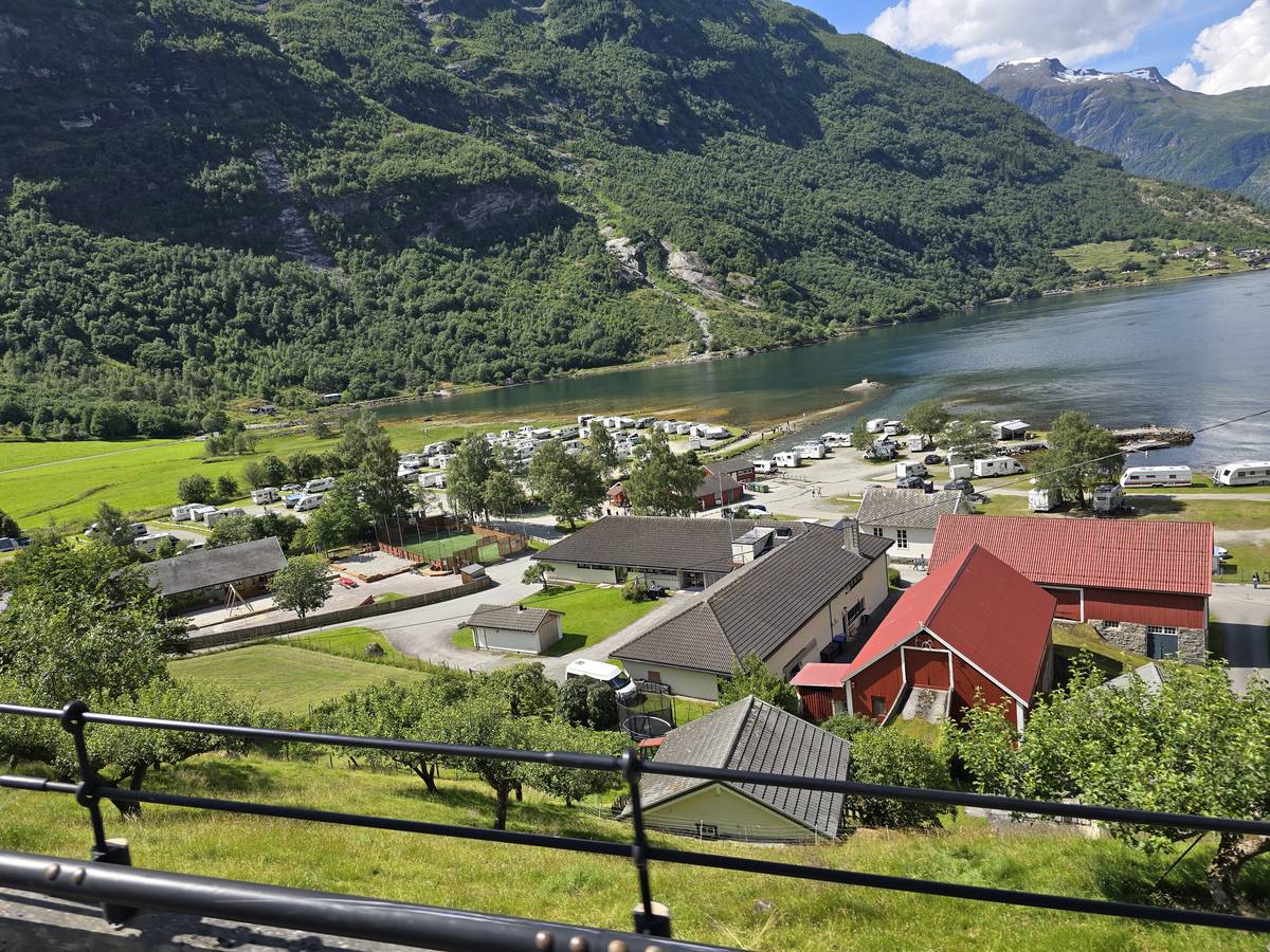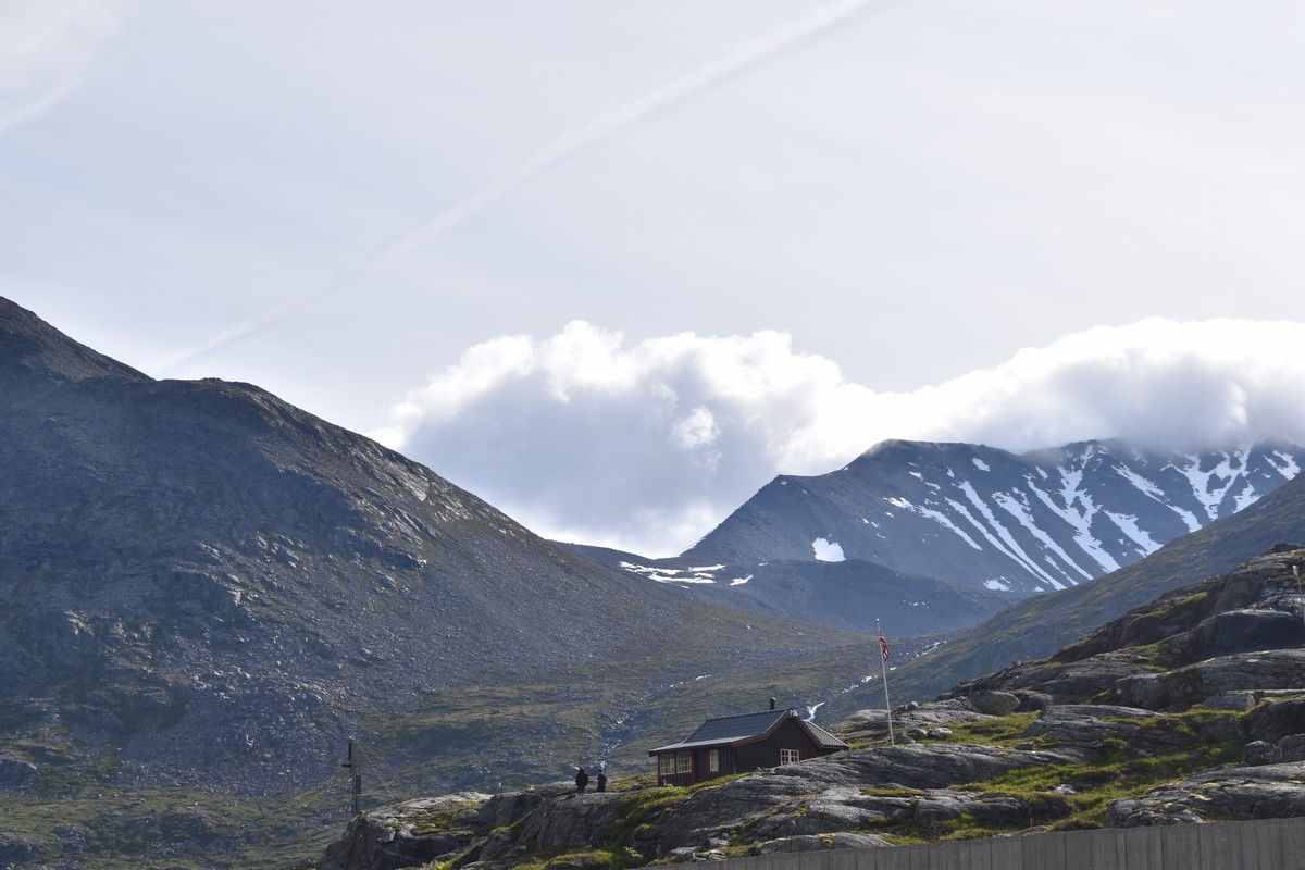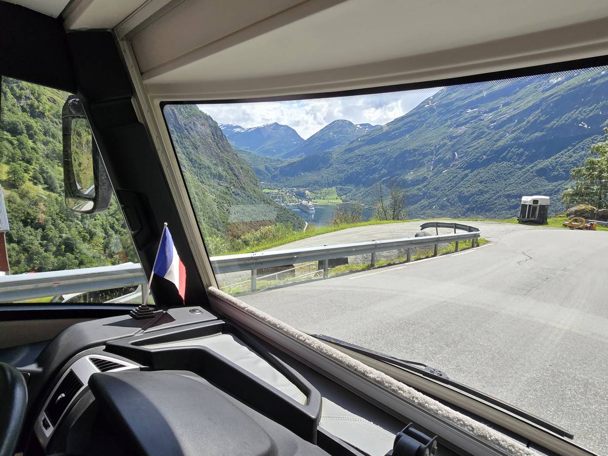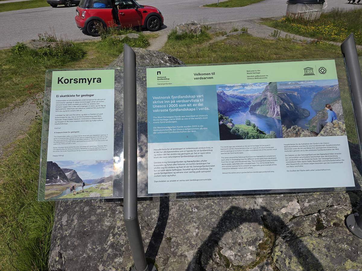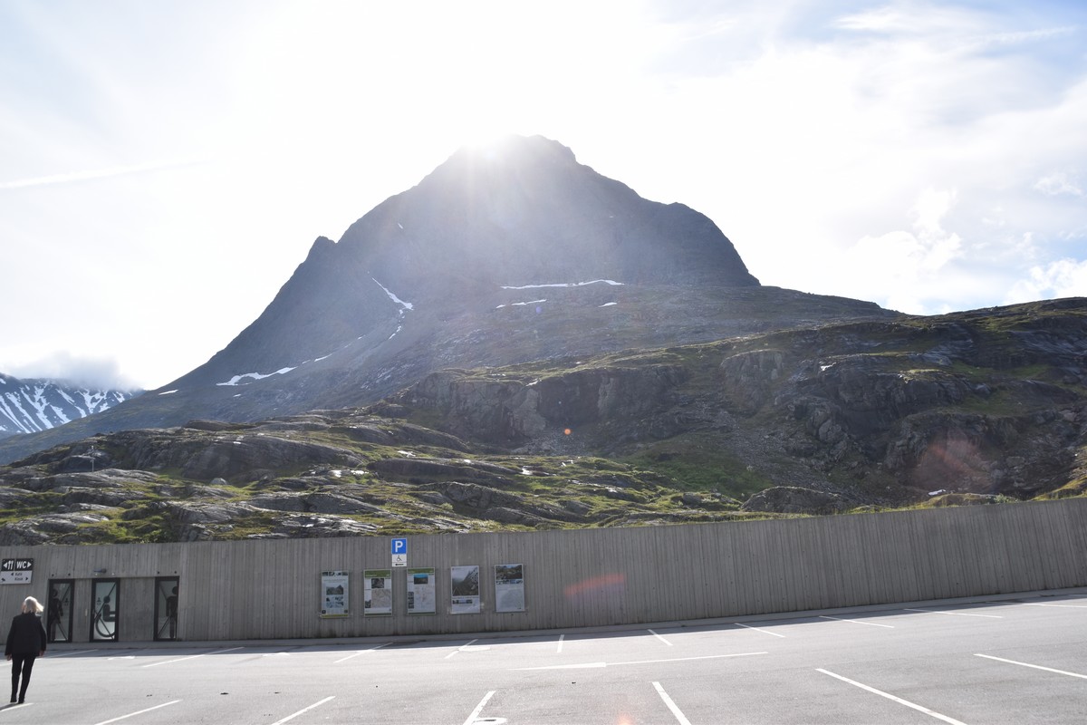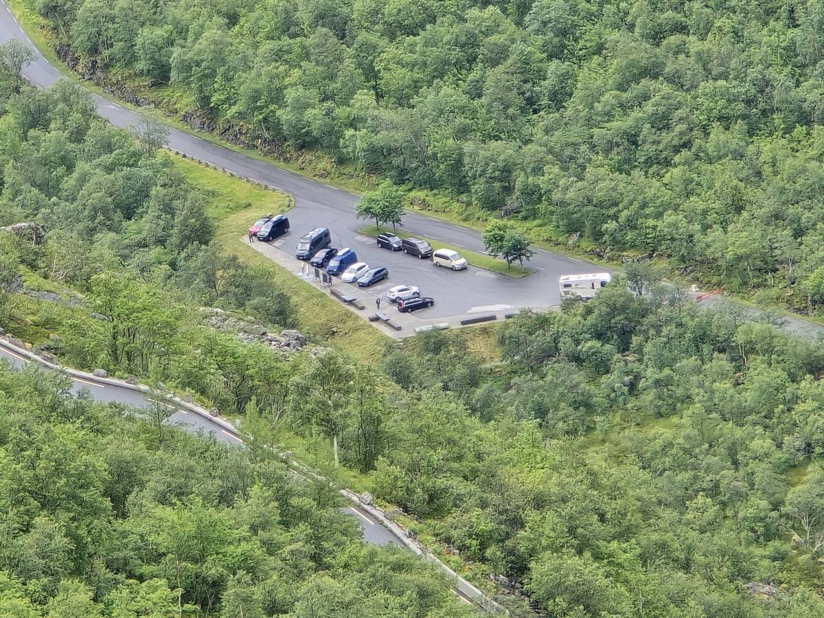 Nous nous arrêtons au sommet de la route des aigles (Orneveien), pour une pause avant la descente vers Geiranger. Nous avons la chance de trouver une place où garer le camping-car au virage des aigles (Ornesvongen) ce qui nous a permis de prendre de belles photos sur Geiranger et son fjord (Geirangerfjord).