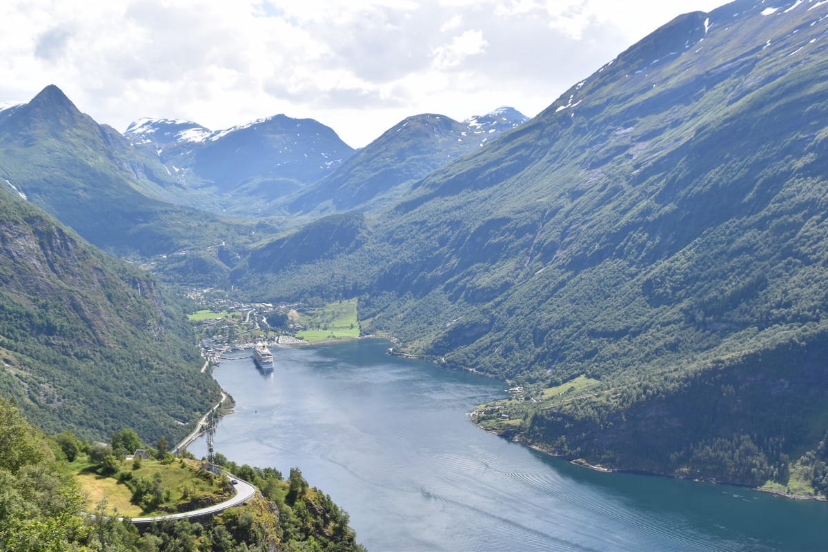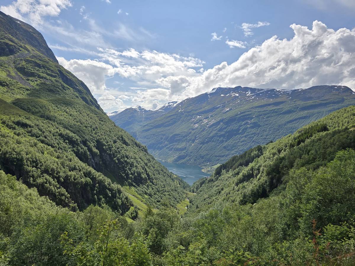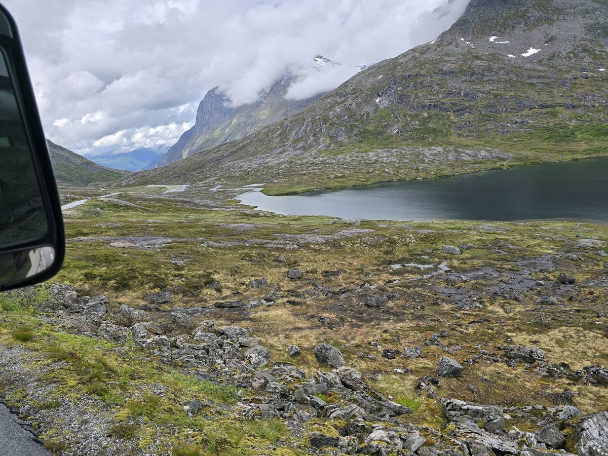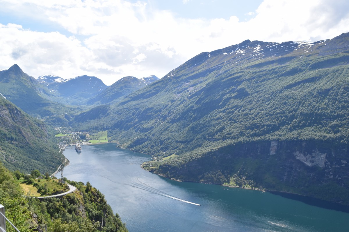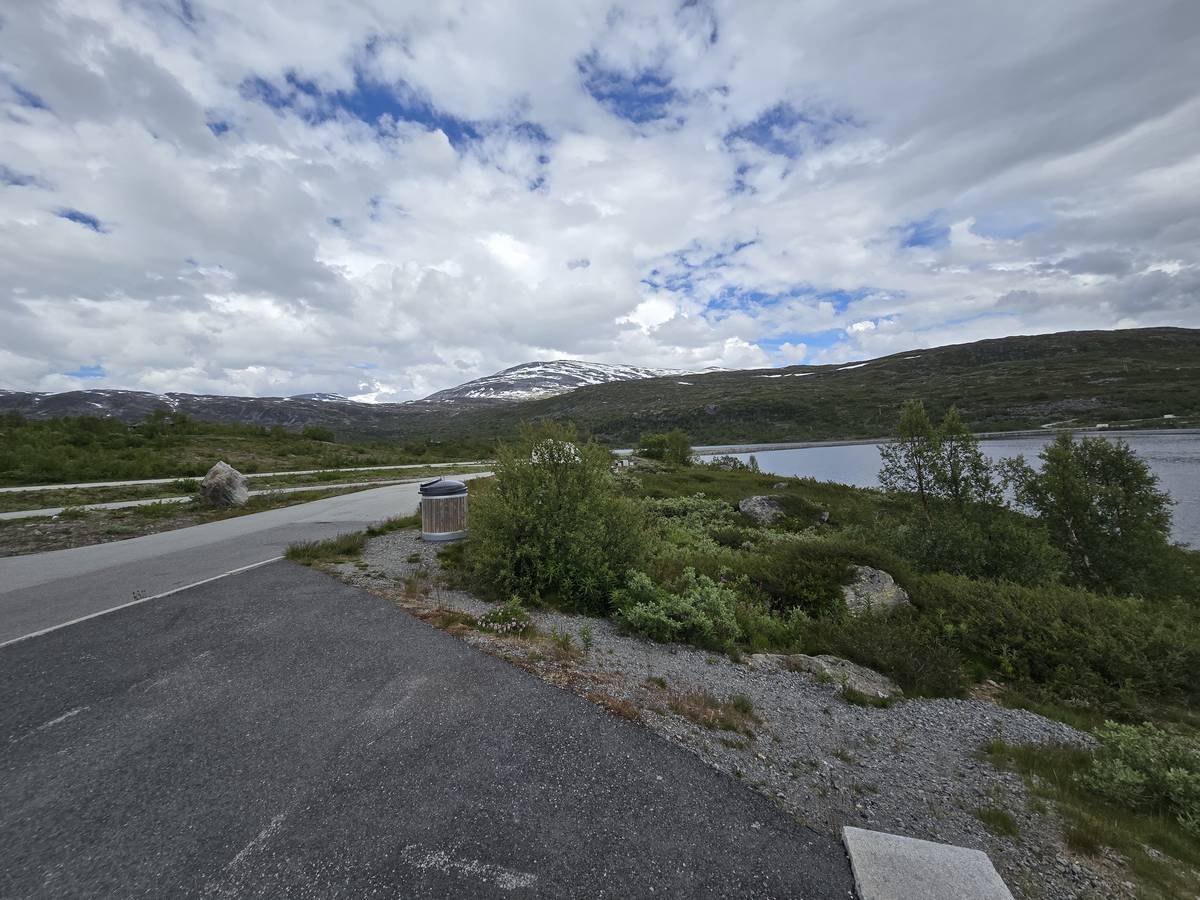 Nous nous arrêtons au sommet de la route des aigles (Orneveien), pour une pause avant la descente vers Geiranger. Nous avons la chance de trouver une place où garer le camping-car au virage des aigles (Ornesvongen) ce qui nous a permis de prendre de belles photos sur Geiranger et son fjord (Geirangerfjord).