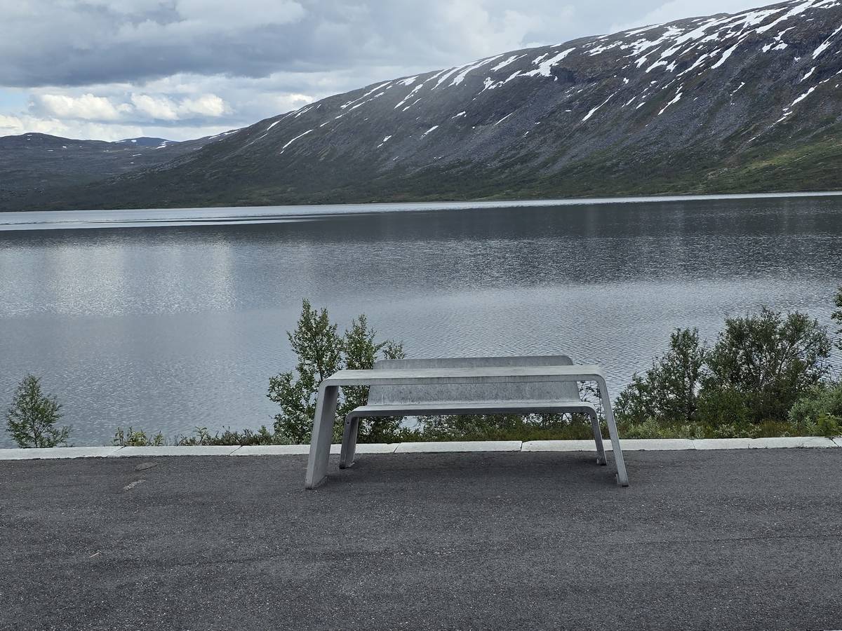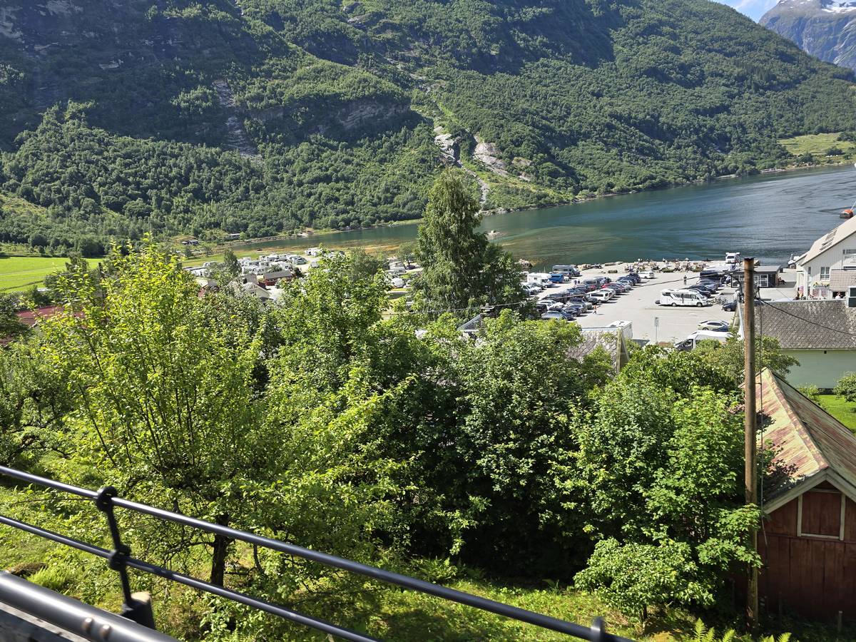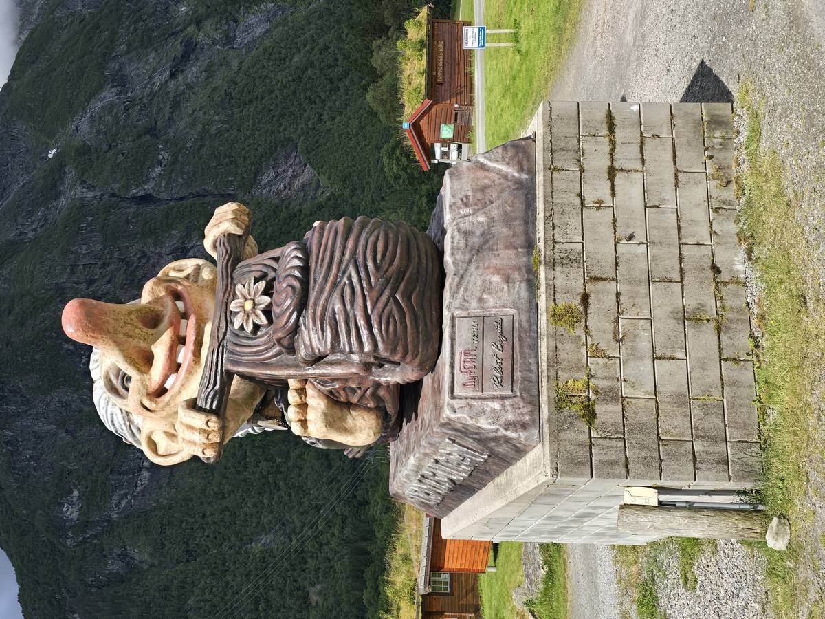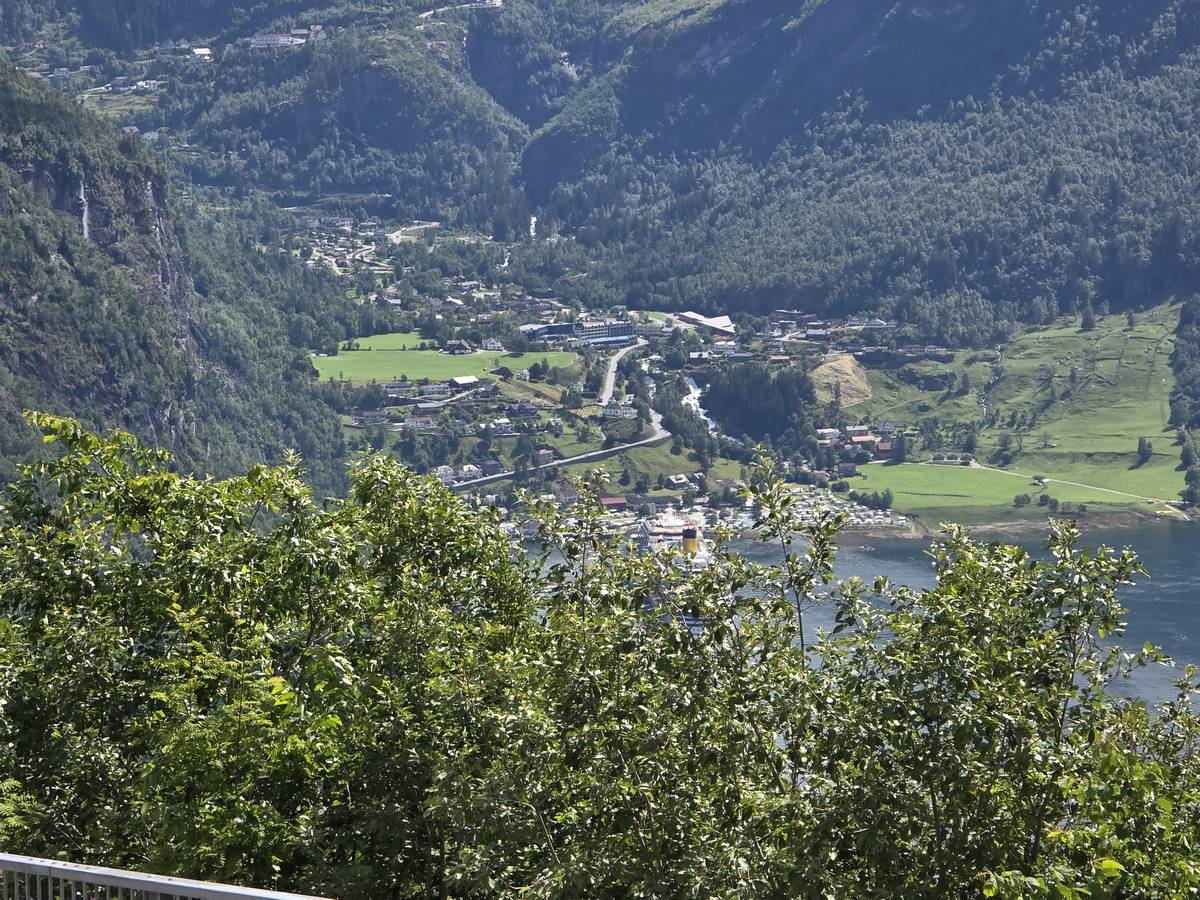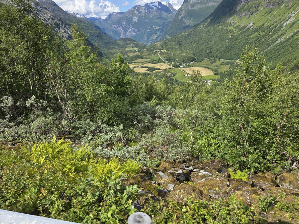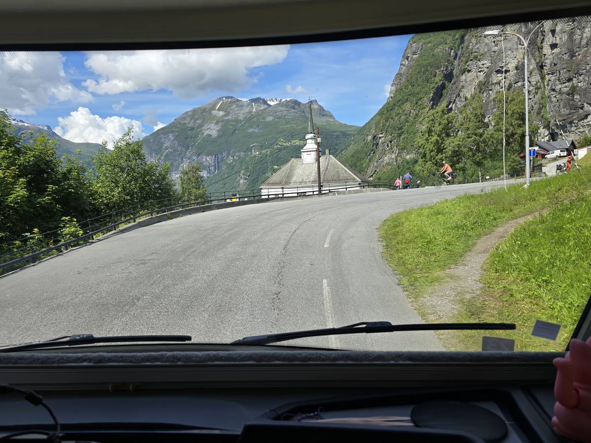 Nous nous arrêtons au sommet de la route des aigles (Orneveien), pour une pause avant la descente vers Geiranger. Nous avons la chance de trouver une place où garer le camping-car au virage des aigles (Ornesvongen) ce qui nous a permis de prendre de belles photos sur Geiranger et son fjord (Geirangerfjord).