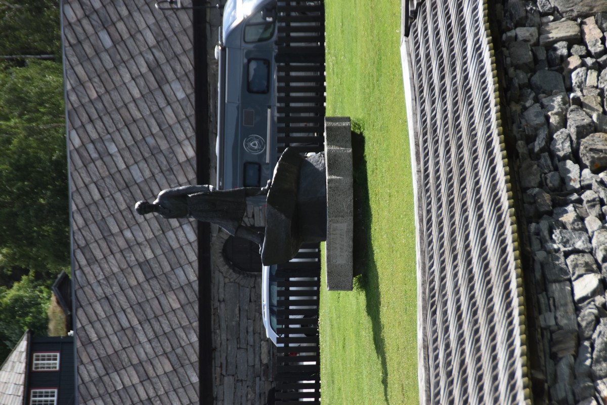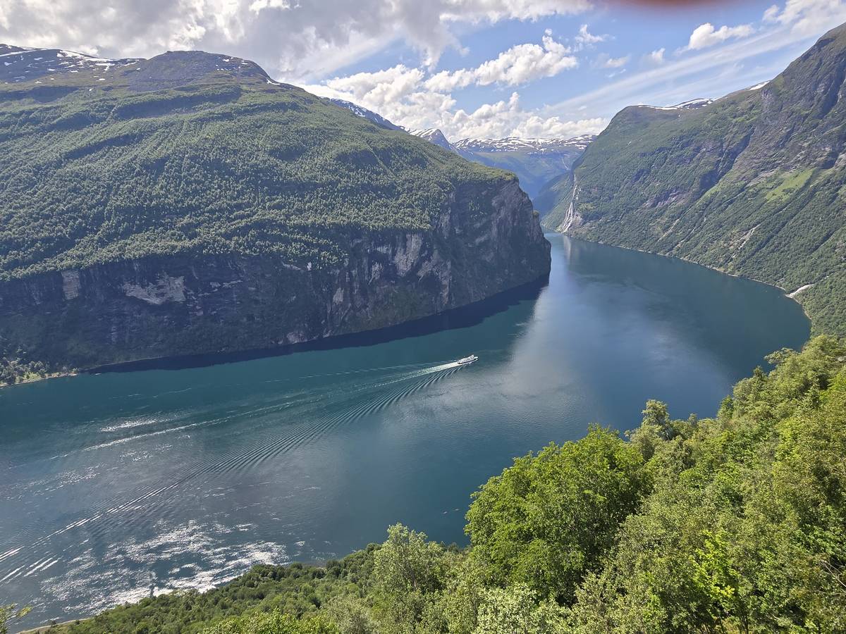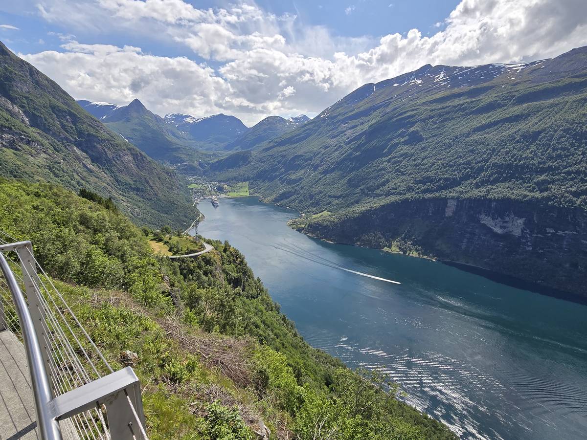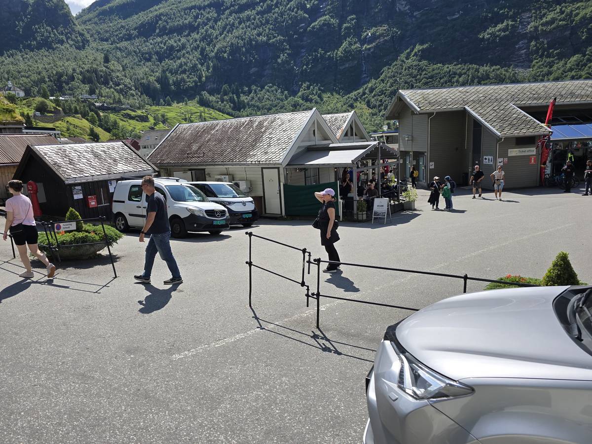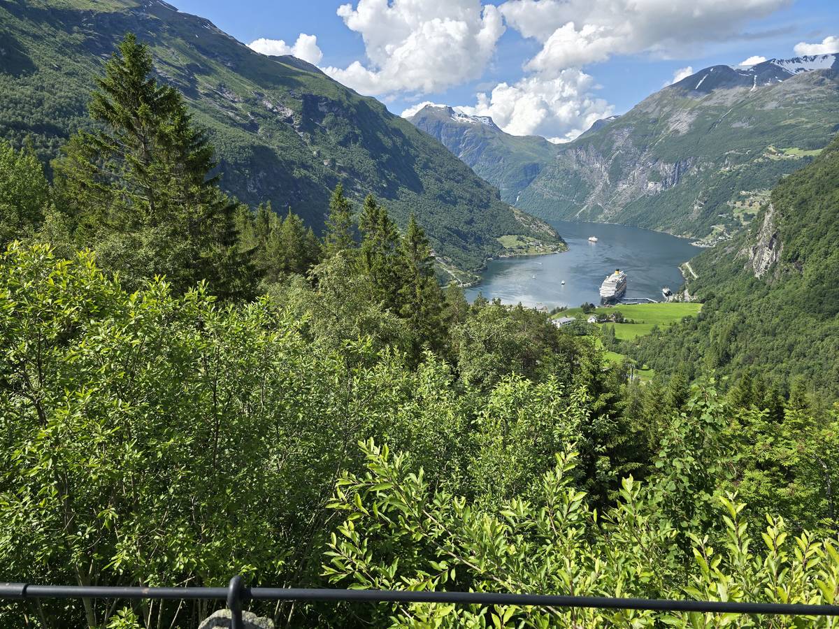 Nous nous arrêtons au sommet de la route des aigles (Orneveien), pour une pause avant la descente vers Geiranger. Nous avons la chance de trouver une place où garer le camping-car au virage des aigles (Ornesvongen) ce qui nous a permis de prendre de belles photos sur Geiranger et son fjord (Geirangerfjord).