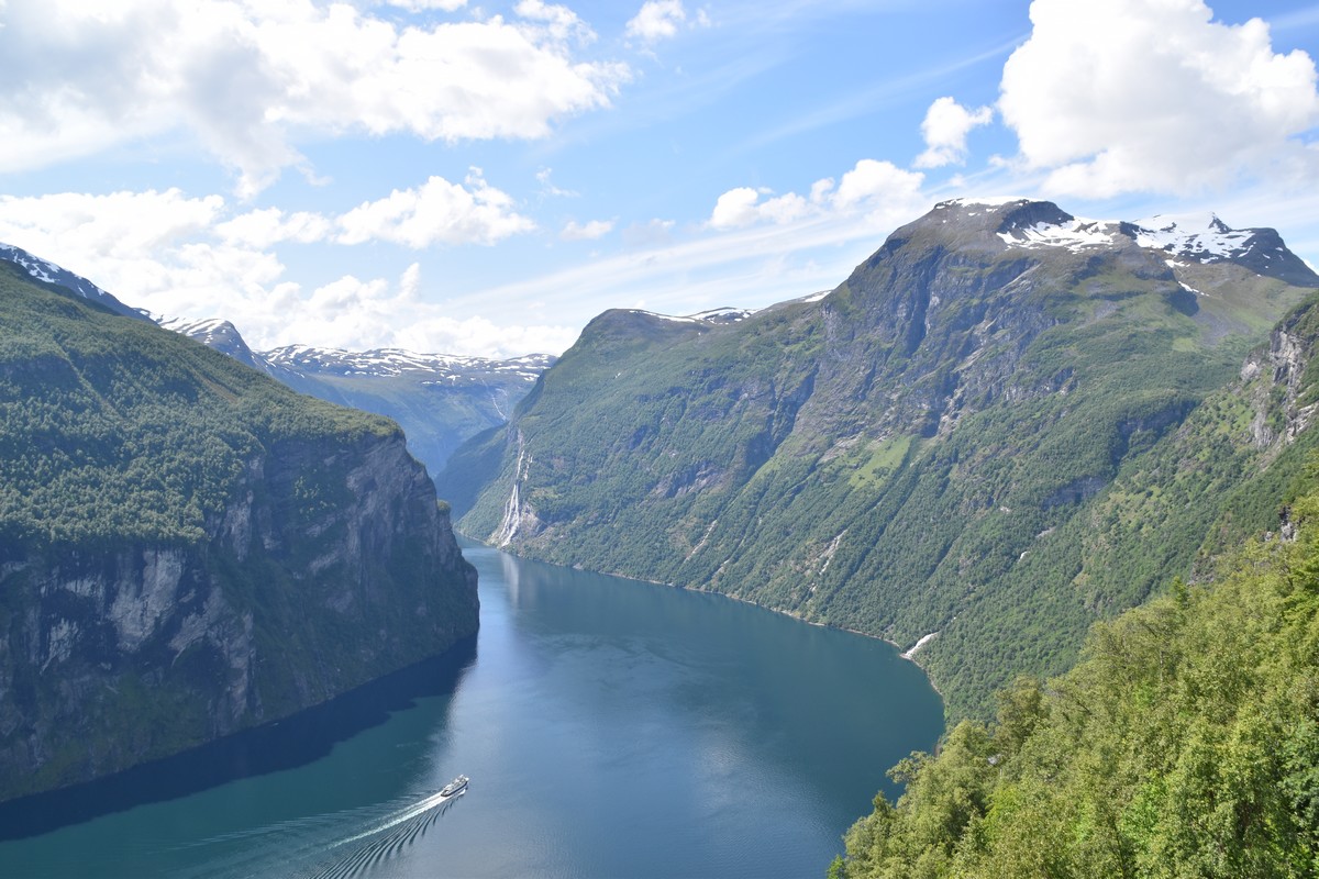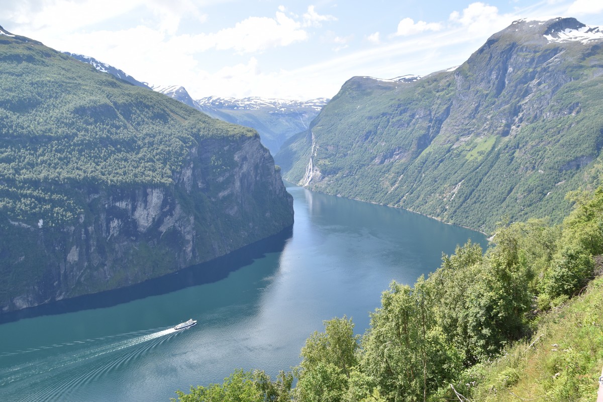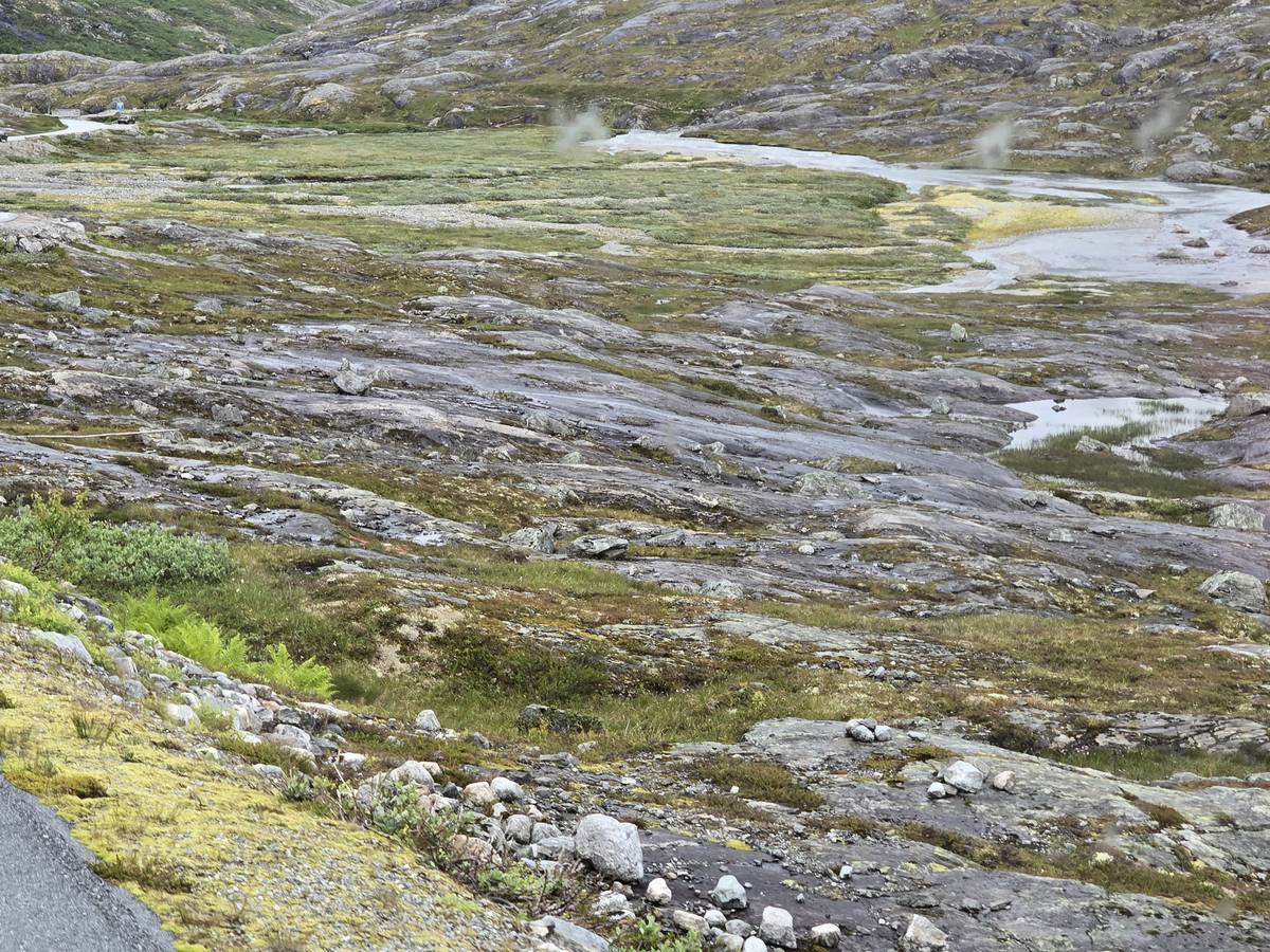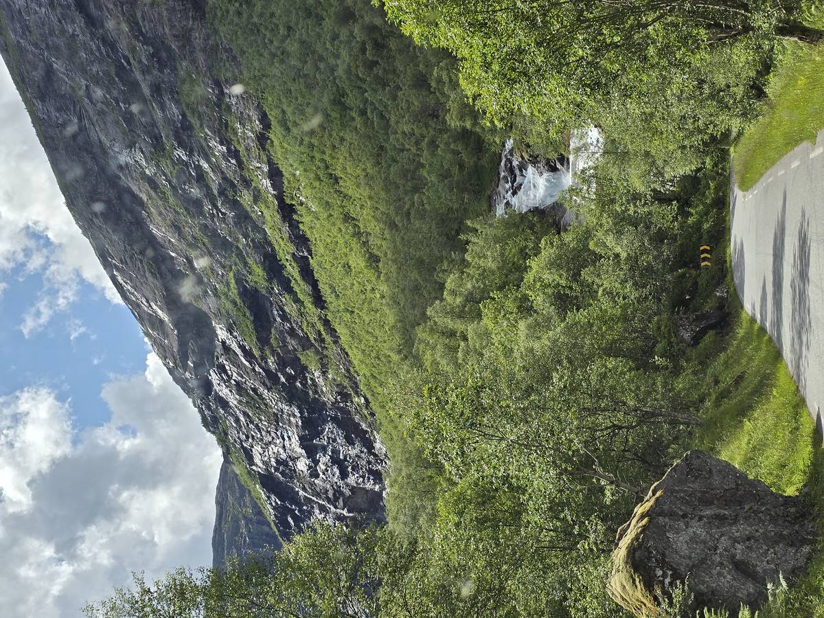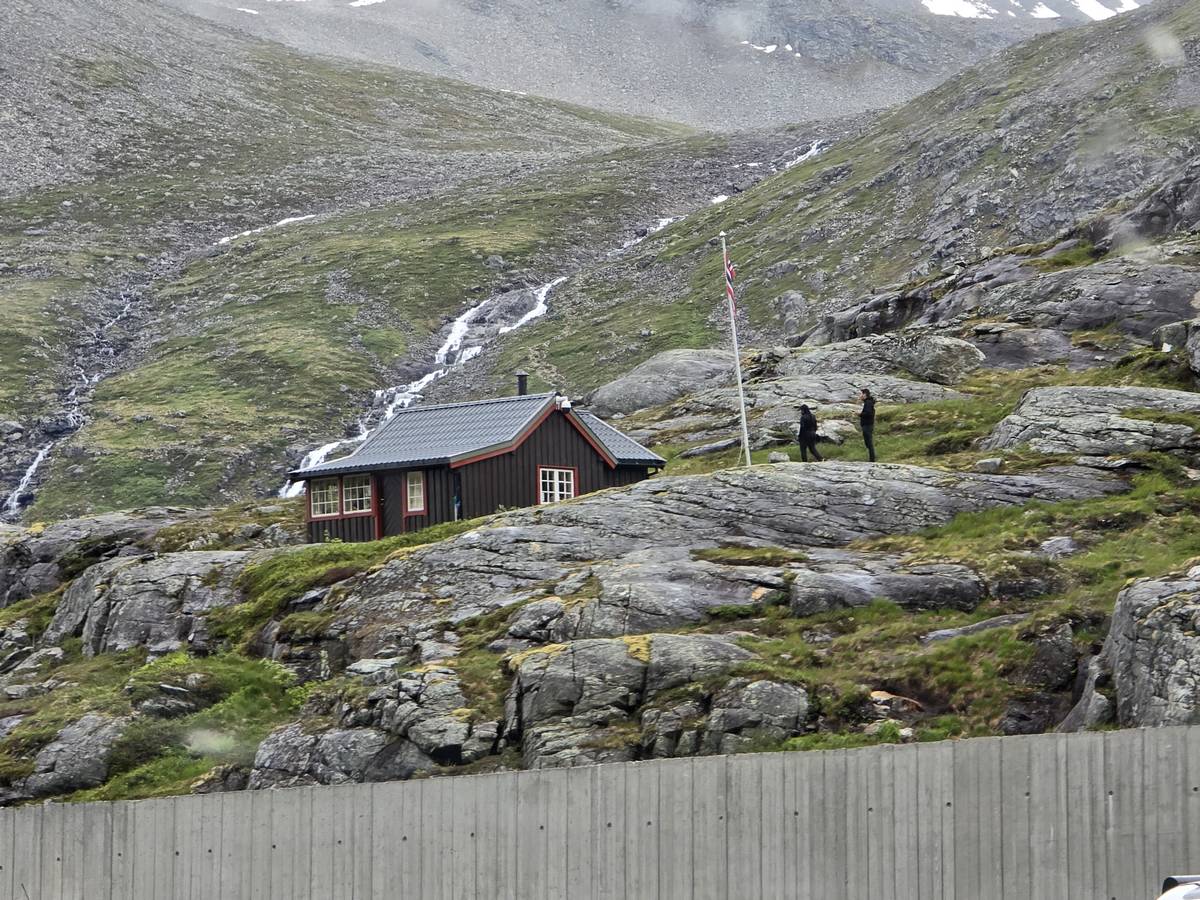 Nous nous arrêtons au sommet de la route des aigles (Orneveien), pour une pause avant la descente vers Geiranger. Nous avons la chance de trouver une place où garer le camping-car au virage des aigles (Ornesvongen) ce qui nous a permis de prendre de belles photos sur Geiranger et son fjord (Geirangerfjord).
