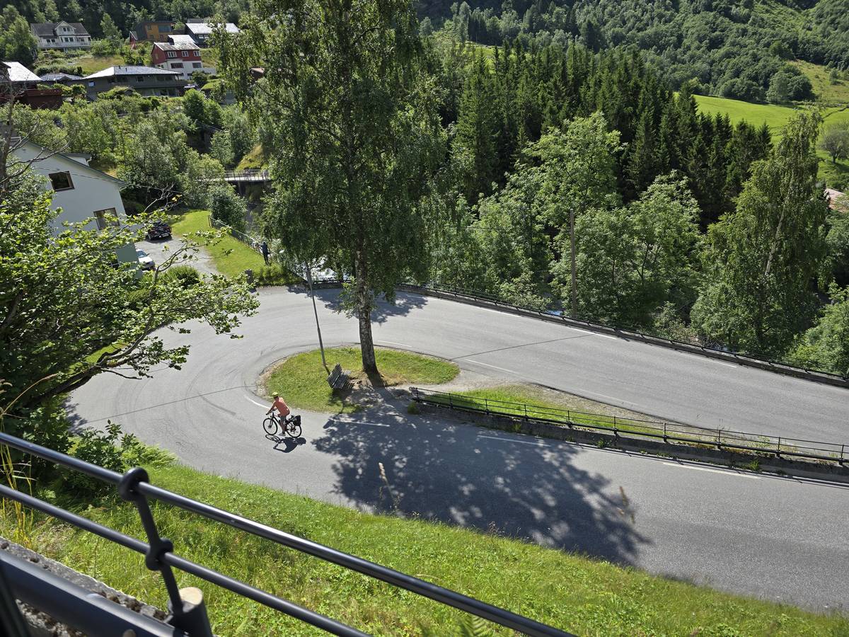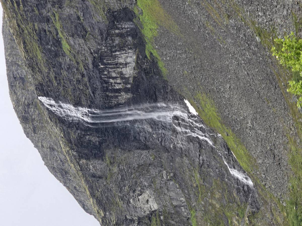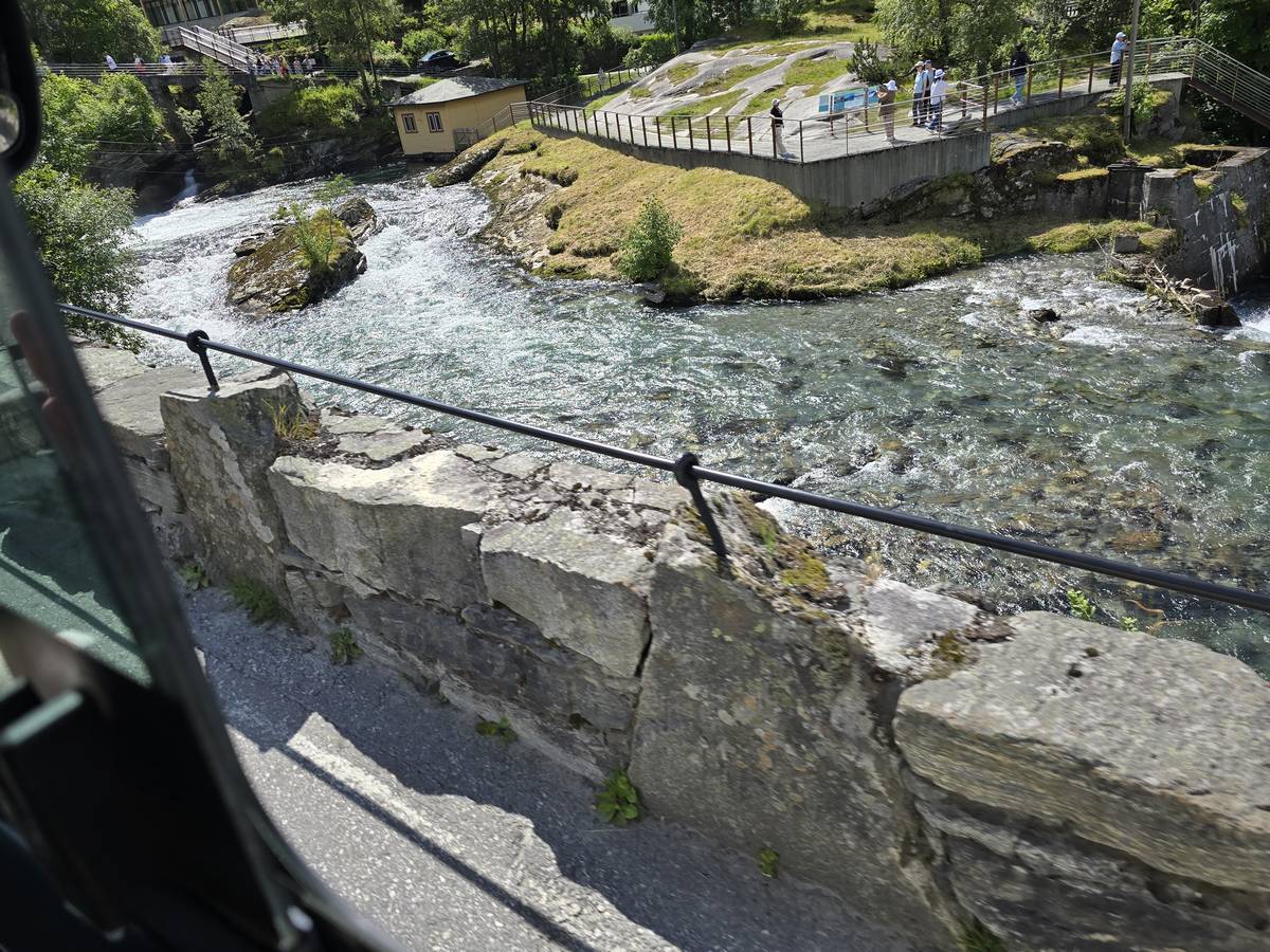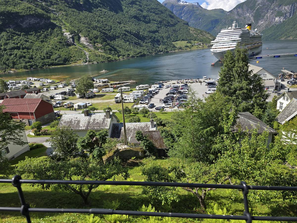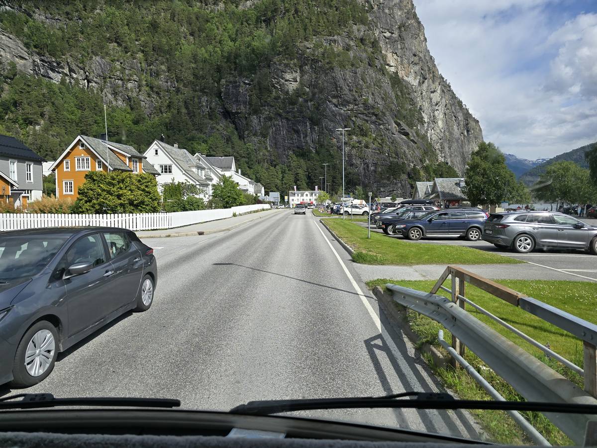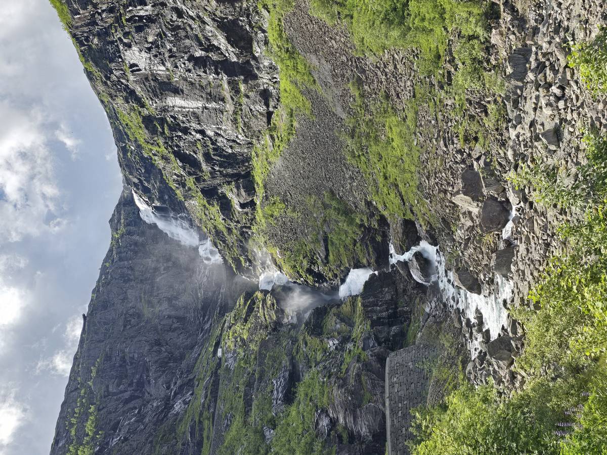 Nous nous arrêtons au sommet de la route des aigles (Orneveien), pour une pause avant la descente vers Geiranger. Nous avons la chance de trouver une place où garer le camping-car au virage des aigles (Ornesvongen) ce qui nous a permis de prendre de belles photos sur Geiranger et son fjord (Geirangerfjord).