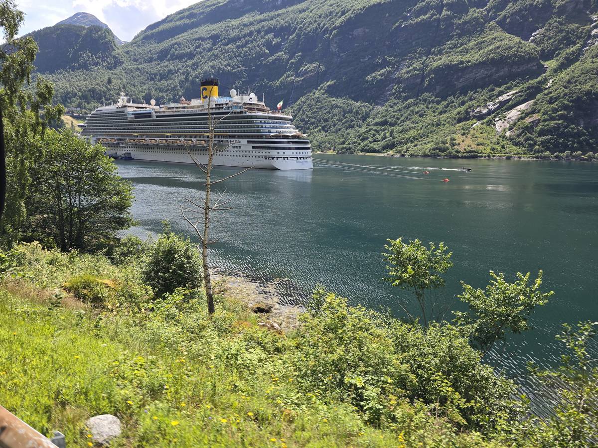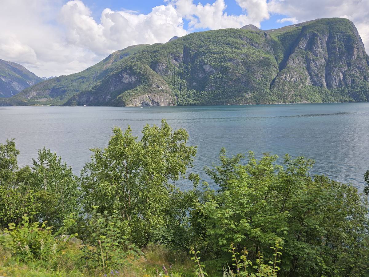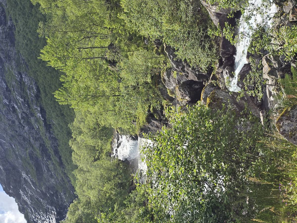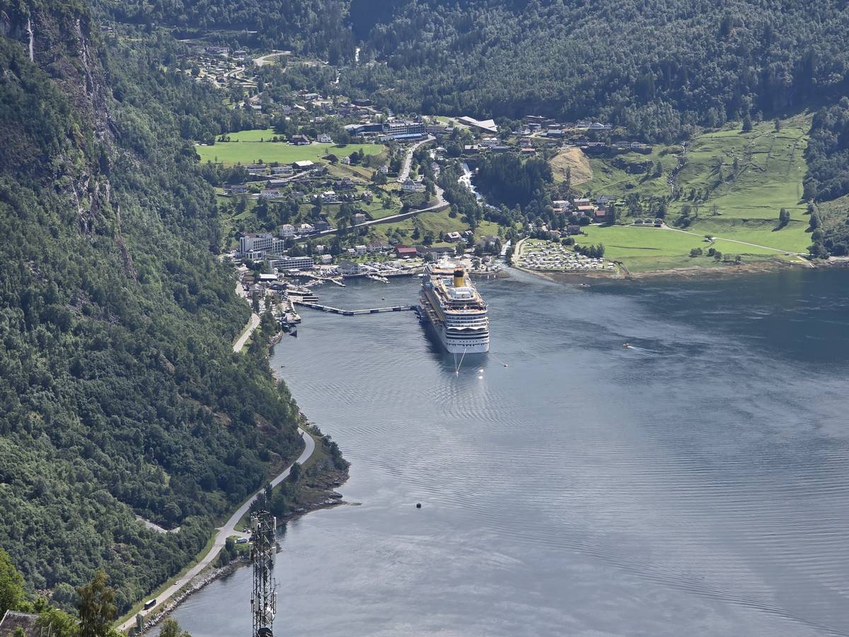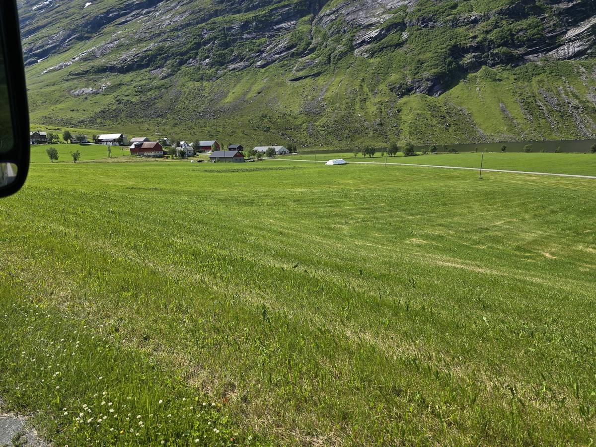Nous nous arrêtons au sommet de la route des aigles (Orneveien), pour une pause avant la descente vers Geiranger. Nous avons la chance de trouver une place où garer le camping-car au virage des aigles (Ornesvongen) ce qui nous a permis de prendre de belles photos sur Geiranger et son fjord (Geirangerfjord).