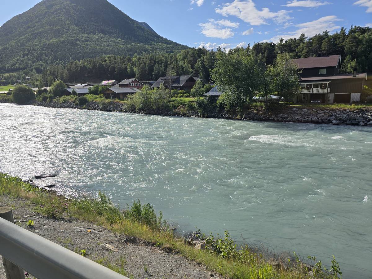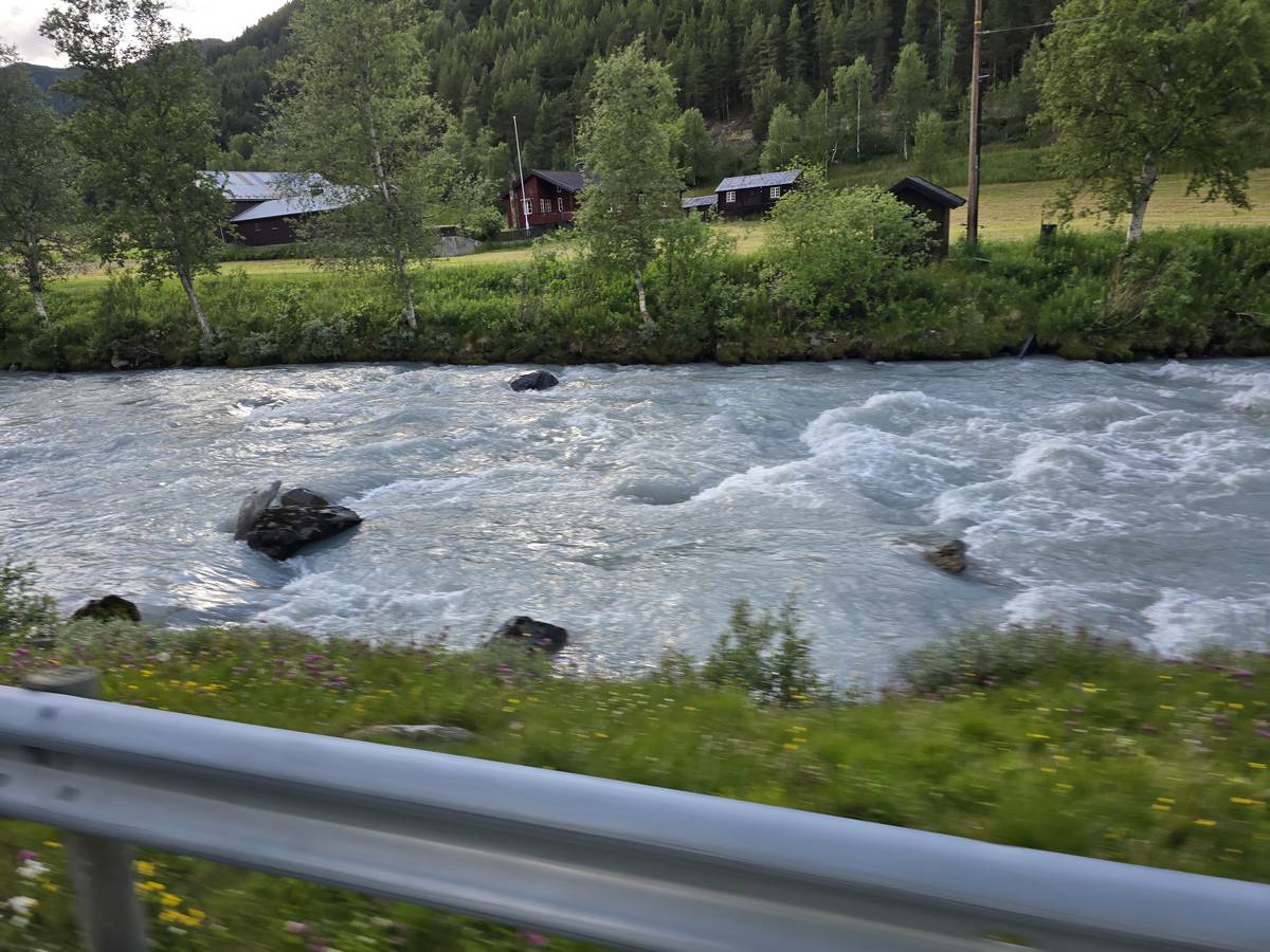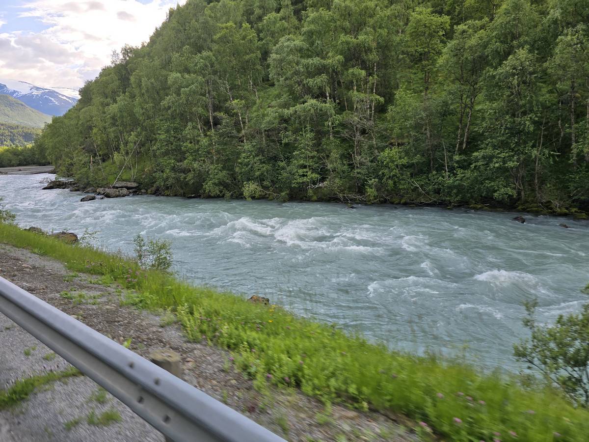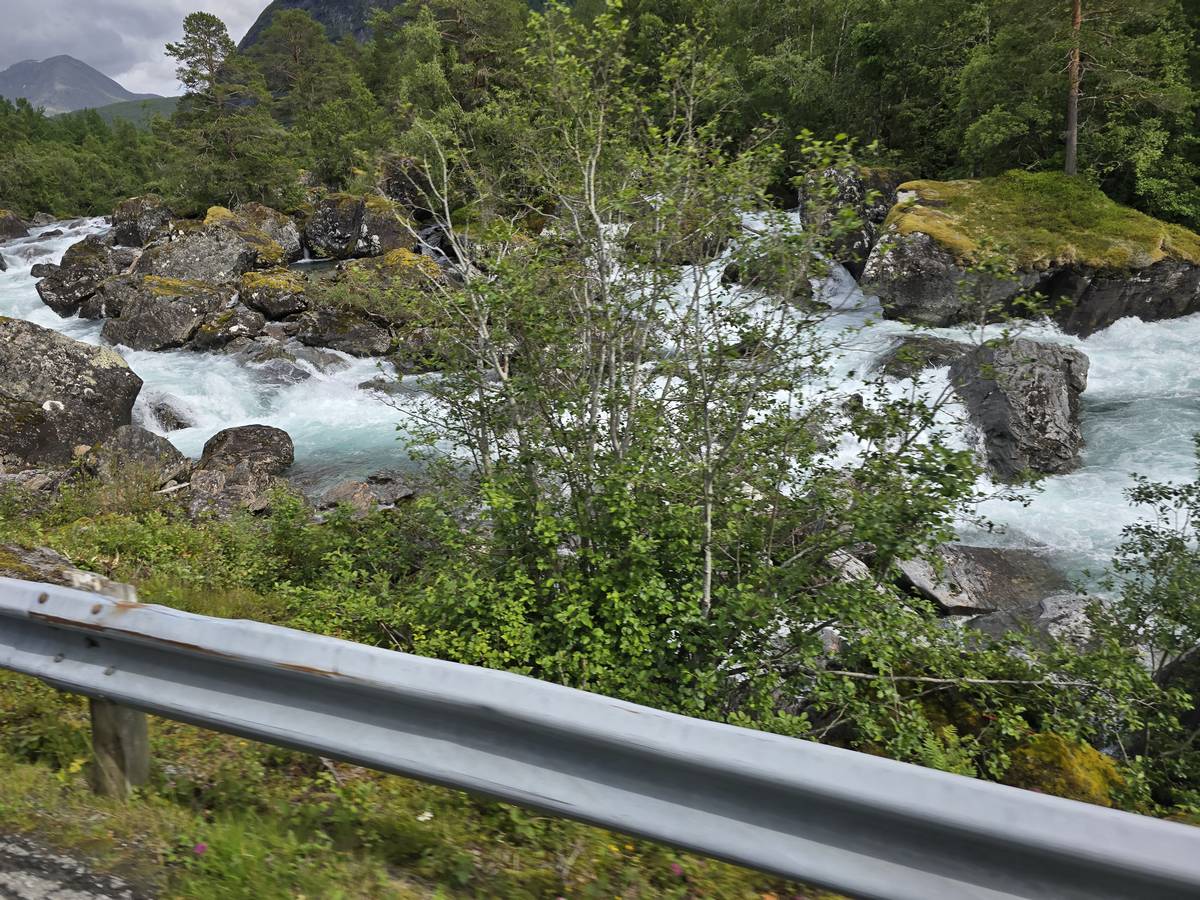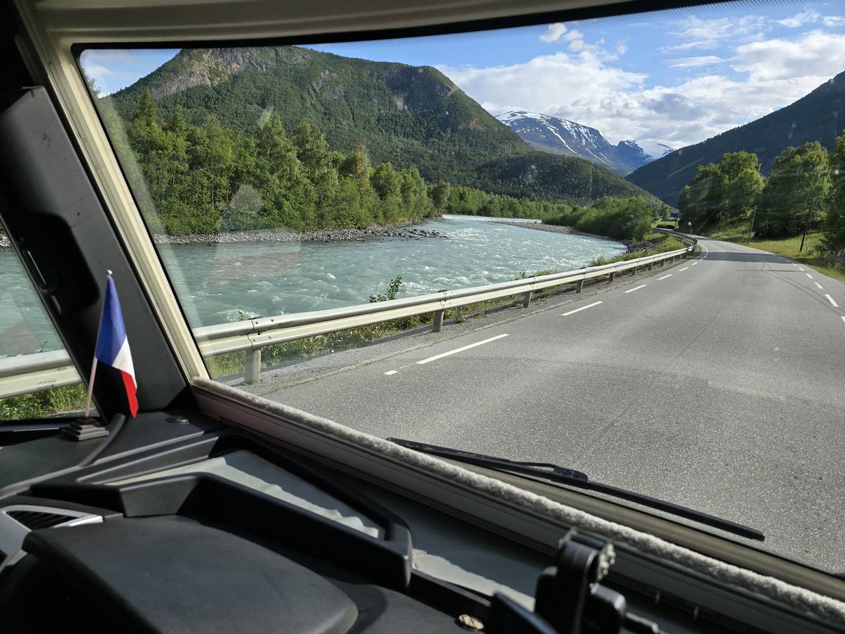 Lom et son église en bois debout au carrefour de la route 15 et de la route 55. Une surprise, il y a beaucoup de camping-cars sur la place de cette église! C'est normal, cette église est très belle, vous pourrez en juger par vous-même en regardant les photos. Nous la visiterons, puis continuerons notre route par la route 55 vers Solvorn. Nous bivouaquerons sur la route sur une aire de stationnement près d'un torrent. Sans doute, vous posez-vous cette question : "Pourquoi ce détour par Lom, alors qu'il y a une route plus directe?". Eh bien, la route directe est une route de tunnels, donc peu de paysages et rien à visiter! De plus, par Lom, nous avons vu des paysages et quelques églises superbes. Nous ne regrettons pas...