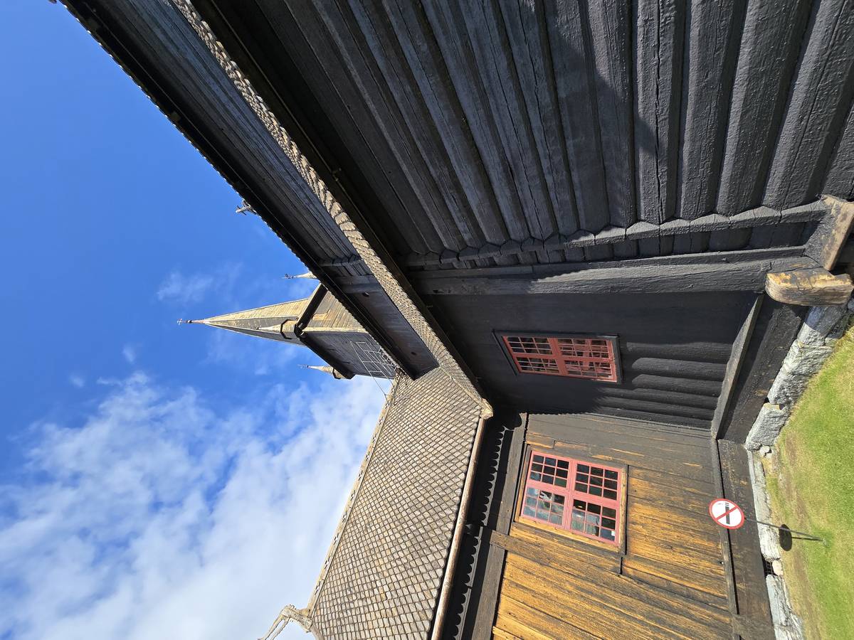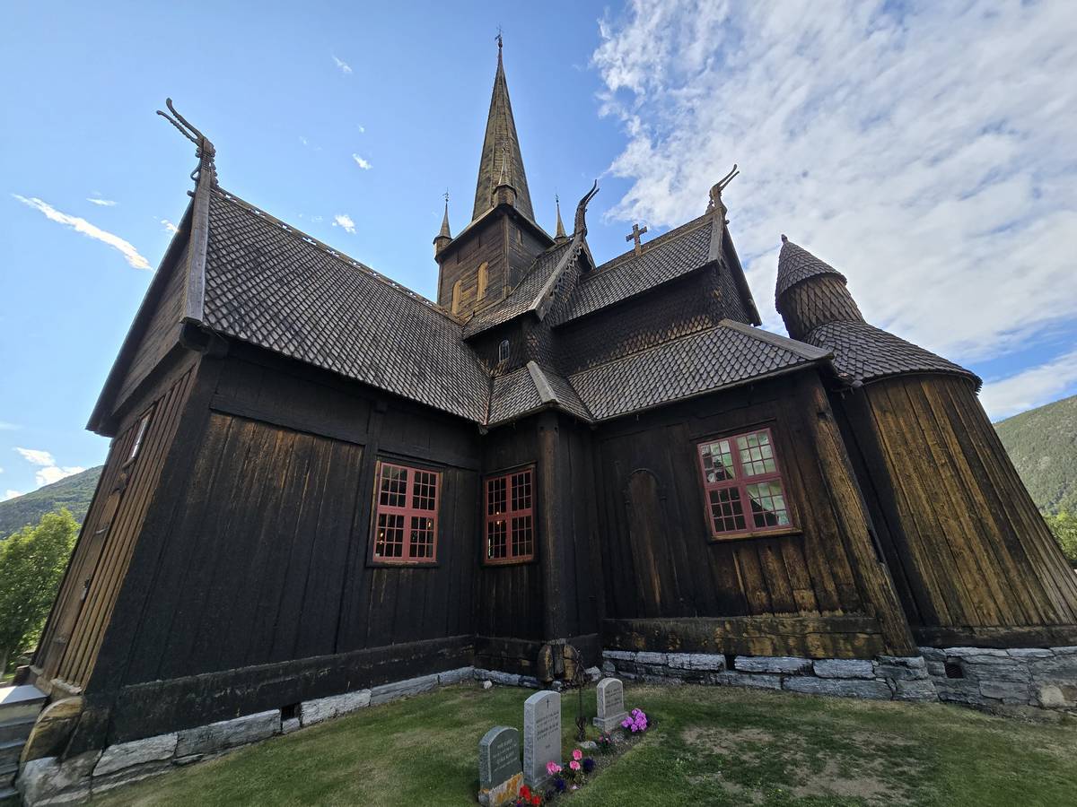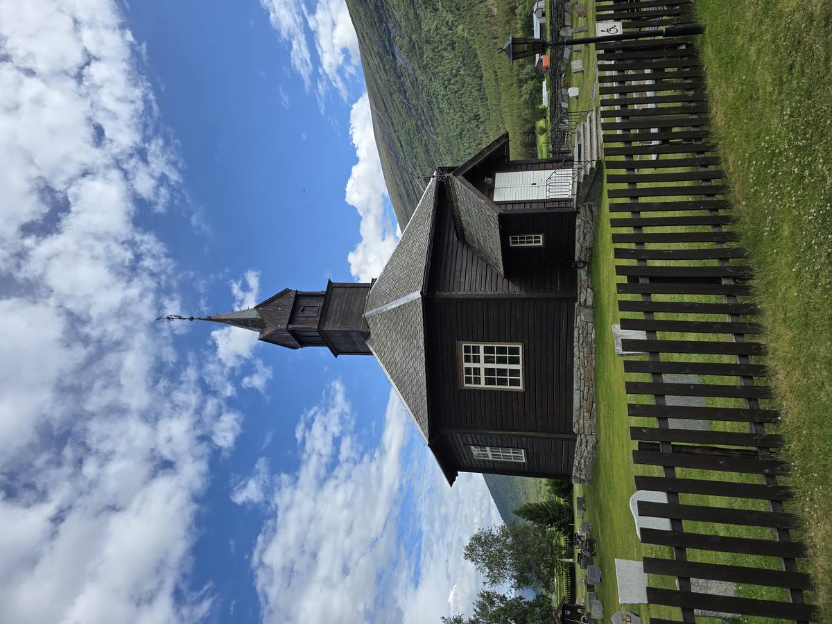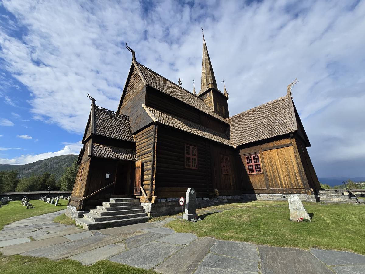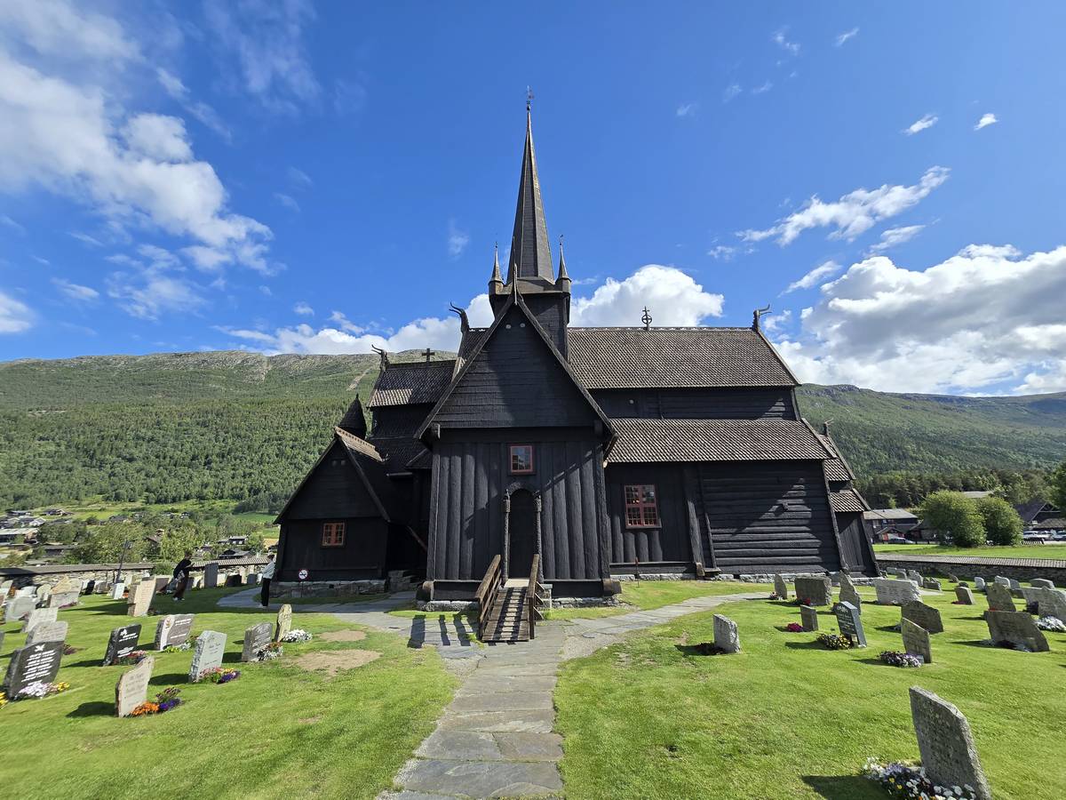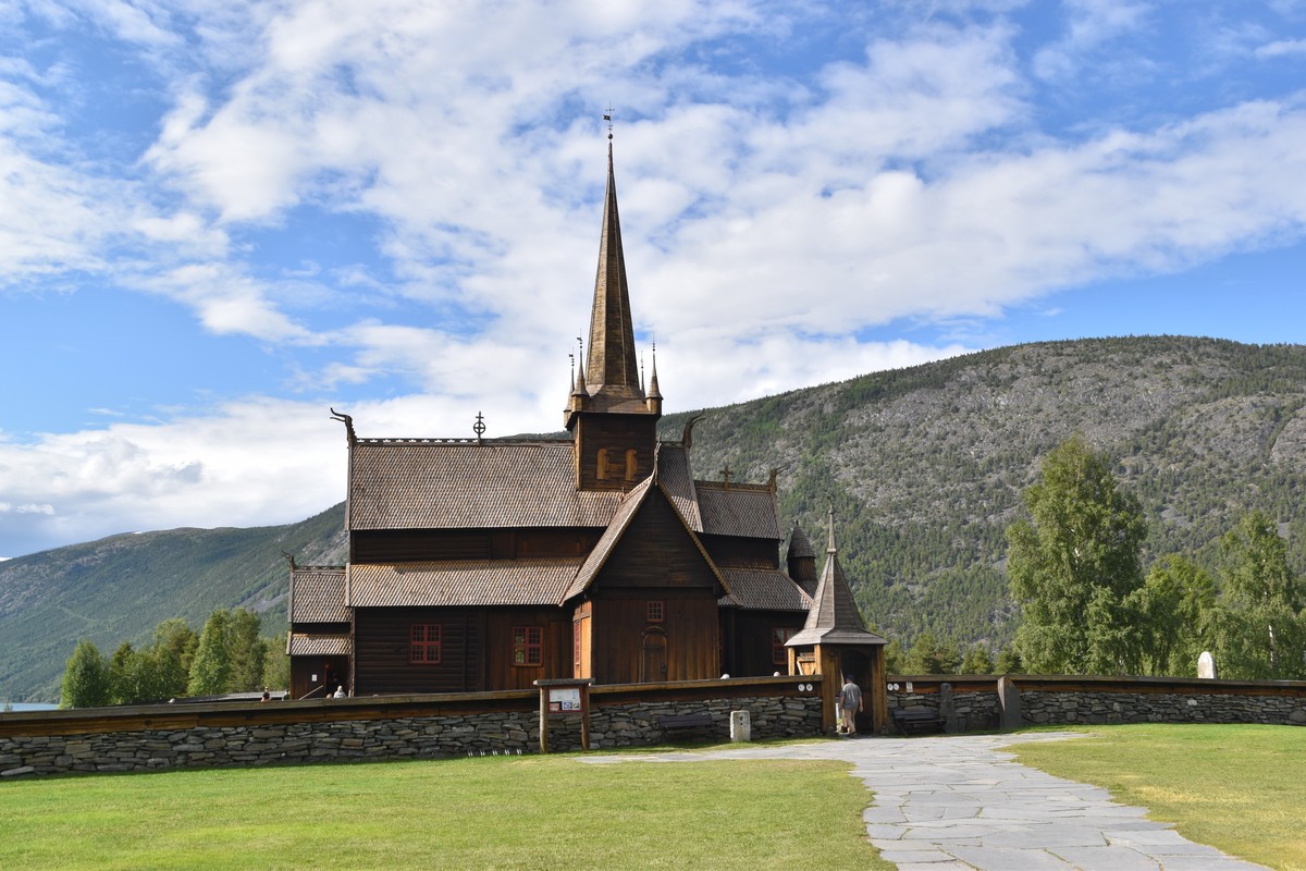 Lom et son église en bois debout au carrefour de la route 15 et de la route 55. Une surprise, il y a beaucoup de camping-cars sur la place de cette église! C'est normal, cette église est très belle, vous pourrez en juger par vous-même en regardant les photos. Nous la visiterons, puis continuerons notre route par la route 55 vers Solvorn. Nous bivouaquerons sur la route sur une aire de stationnement près d'un torrent. Sans doute, vous posez-vous cette question : "Pourquoi ce détour par Lom, alors qu'il y a une route plus directe?". Eh bien, la route directe est une route de tunnels, donc peu de paysages et rien à visiter! De plus, par Lom, nous avons vu des paysages et quelques églises superbes. Nous ne regrettons pas...