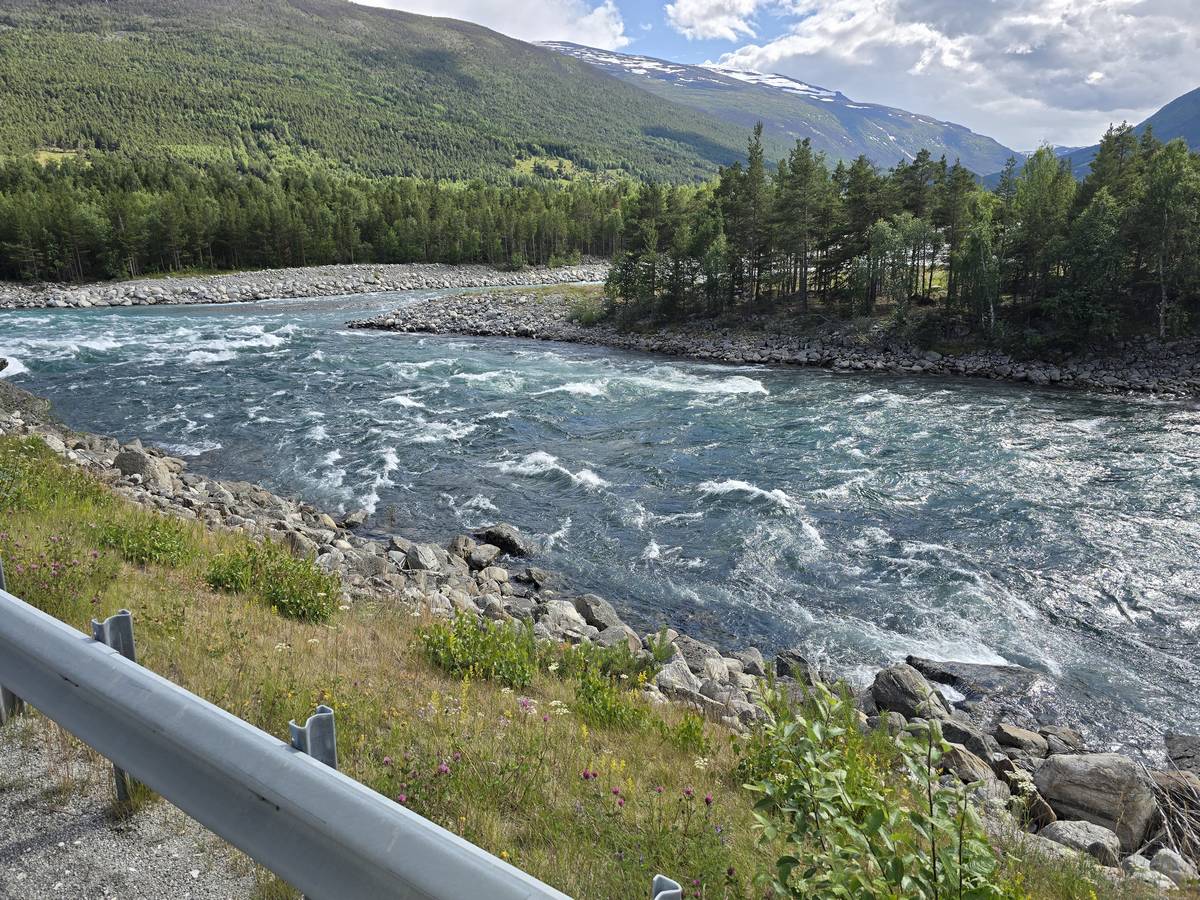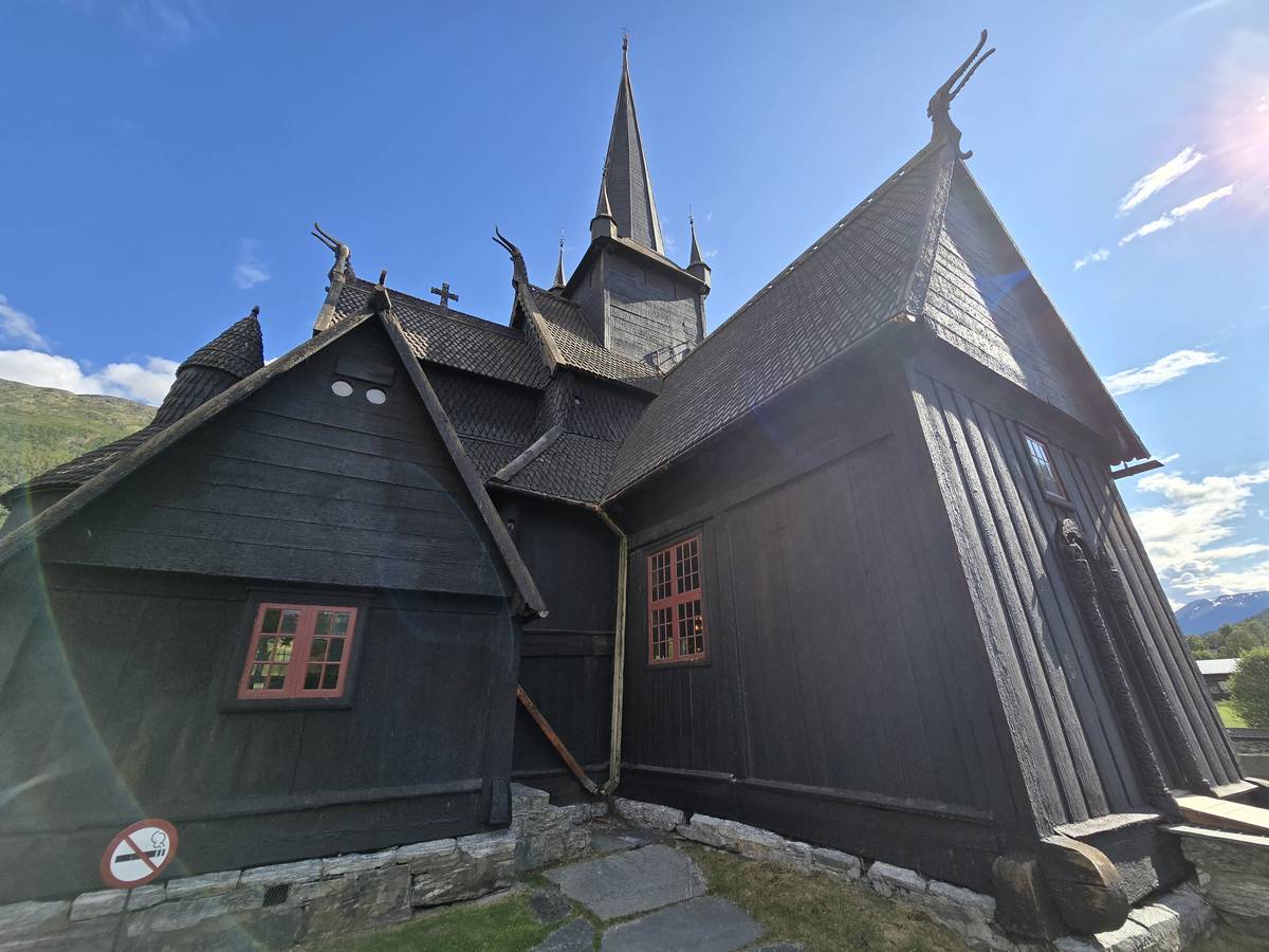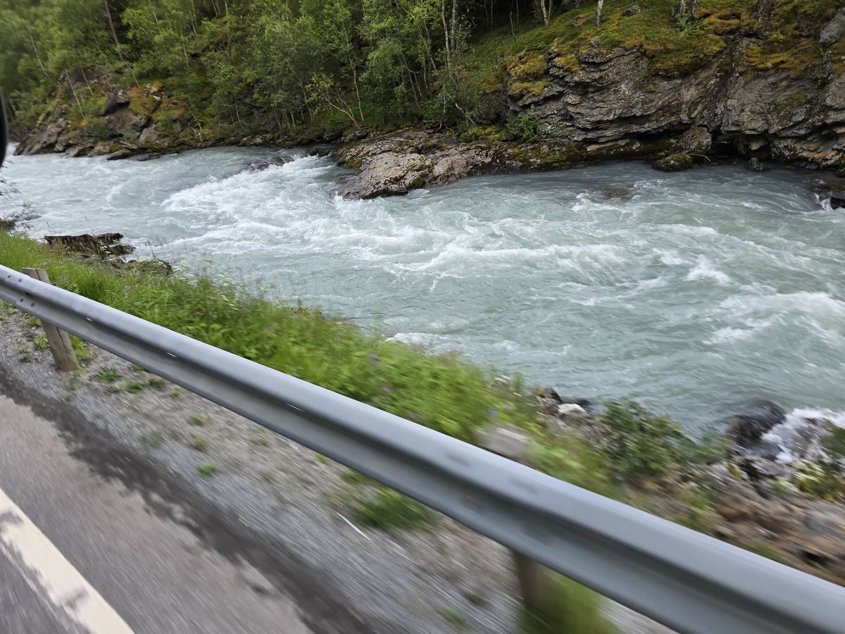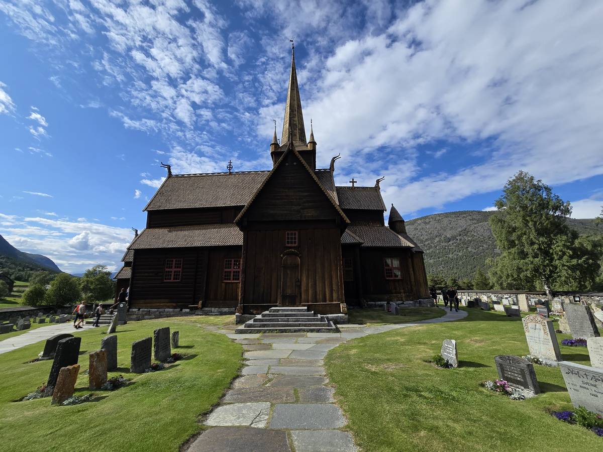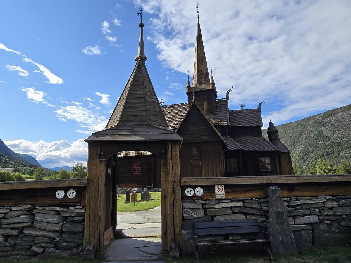 Lom et son église en bois debout au carrefour de la route 15 et de la route 55. Une surprise, il y a beaucoup de camping-cars sur la place de cette église! C'est normal, cette église est très belle, vous pourrez en juger par vous-même en regardant les photos. Nous la visiterons, puis continuerons notre route par la route 55 vers Solvorn. Nous bivouaquerons sur la route sur une aire de stationnement près d'un torrent. Sans doute, vous posez-vous cette question : "Pourquoi ce détour par Lom, alors qu'il y a une route plus directe?". Eh bien, la route directe est une route de tunnels, donc peu de paysages et rien à visiter! De plus, par Lom, nous avons vu des paysages et quelques églises superbes. Nous ne regrettons pas...