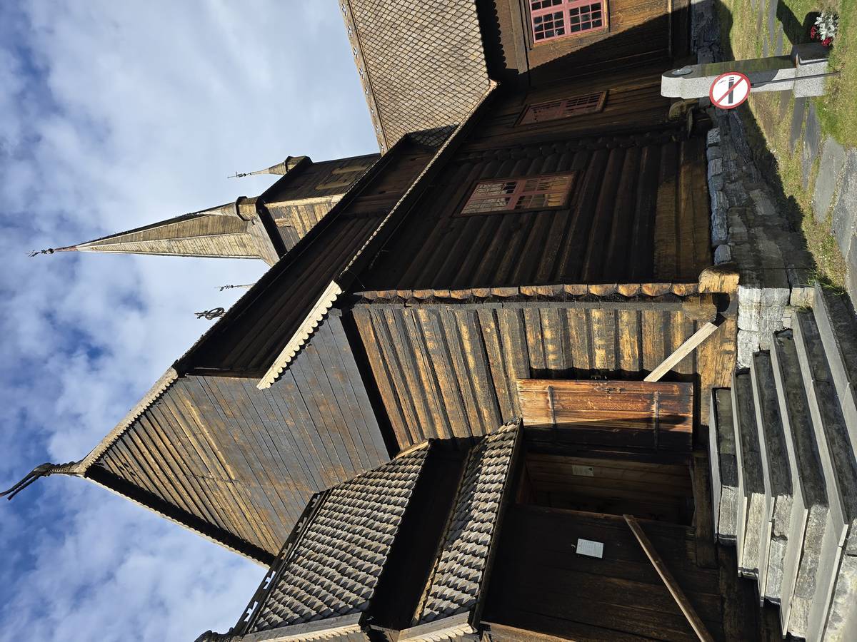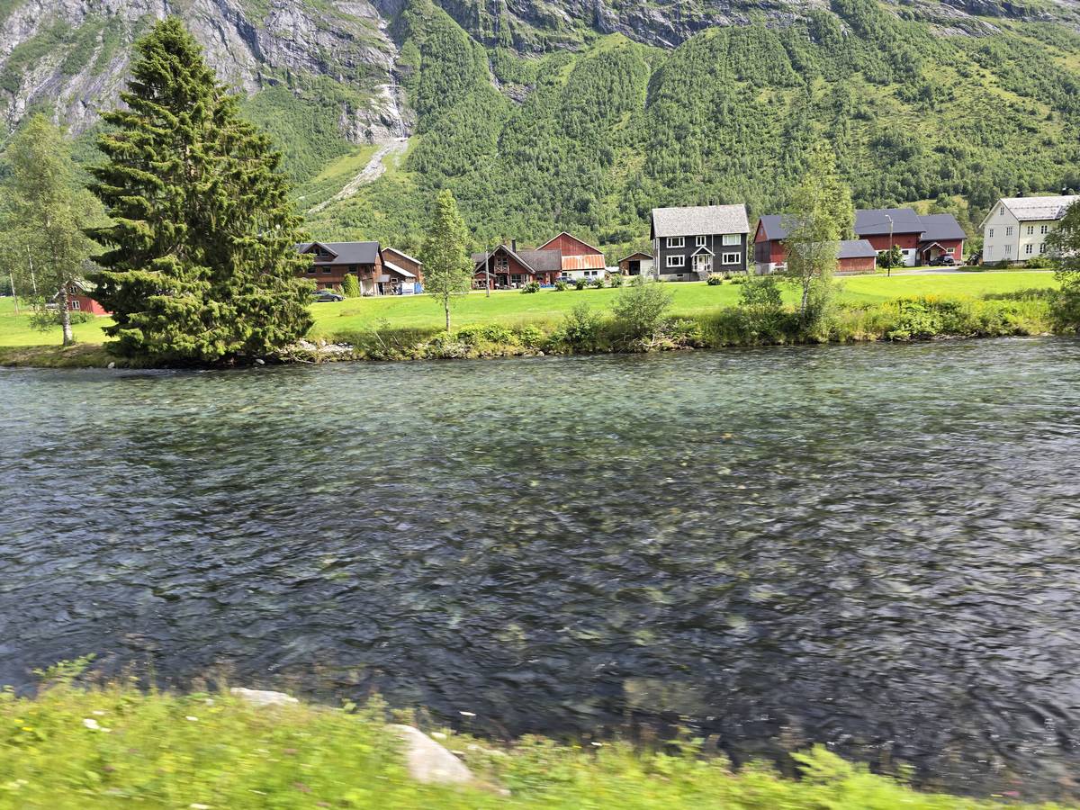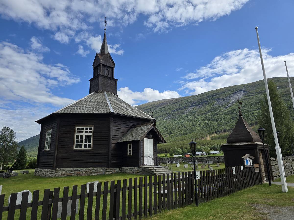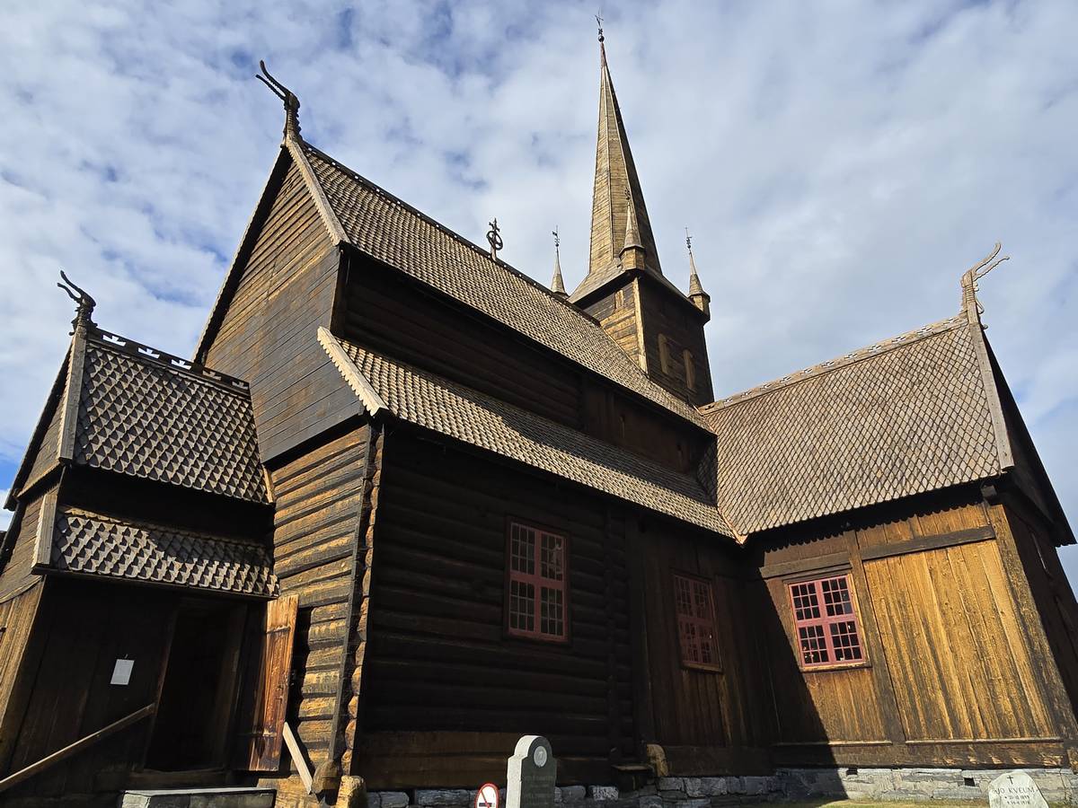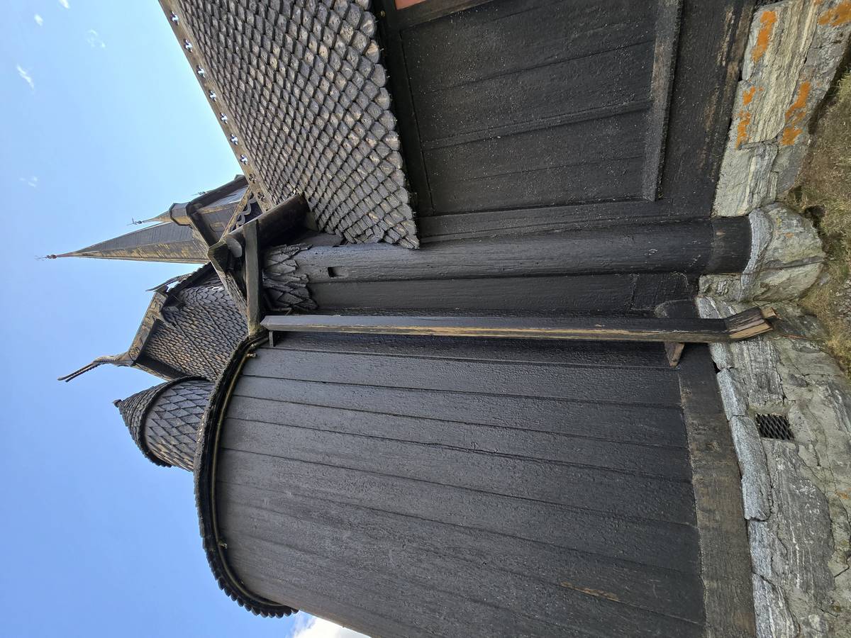 Lom et son église en bois debout au carrefour de la route 15 et de la route 55. Une surprise, il y a beaucoup de camping-cars sur la place de cette église! C'est normal, cette église est très belle, vous pourrez en juger par vous-même en regardant les photos. Nous la visiterons, puis continuerons notre route par la route 55 vers Solvorn. Nous bivouaquerons sur la route sur une aire de stationnement près d'un torrent. Sans doute, vous posez-vous cette question : "Pourquoi ce détour par Lom, alors qu'il y a une route plus directe?". Eh bien, la route directe est une route de tunnels, donc peu de paysages et rien à visiter! De plus, par Lom, nous avons vu des paysages et quelques églises superbes. Nous ne regrettons pas...