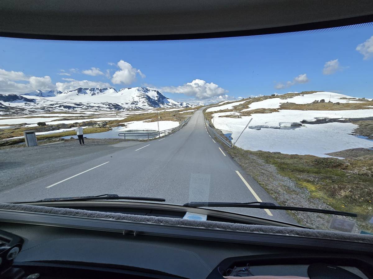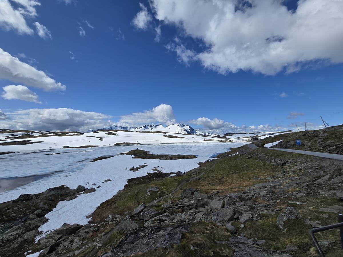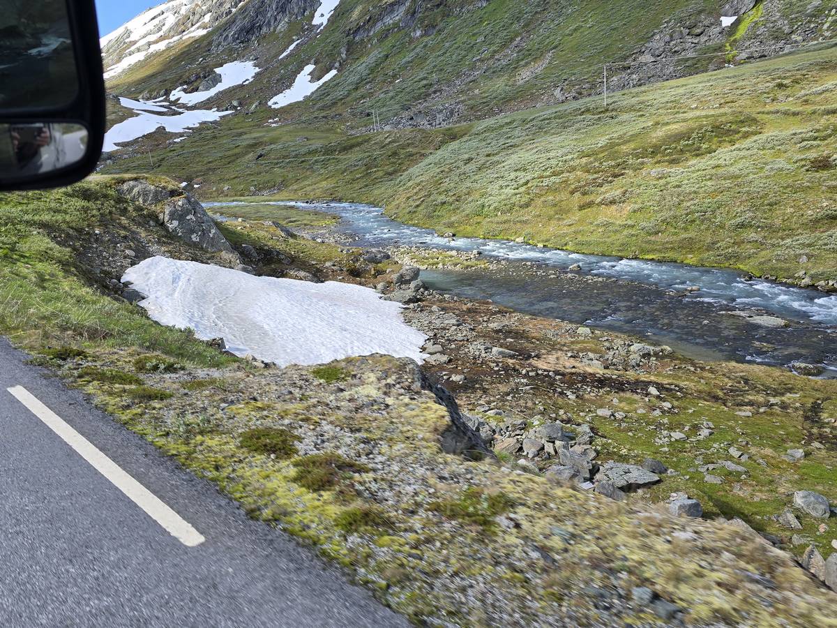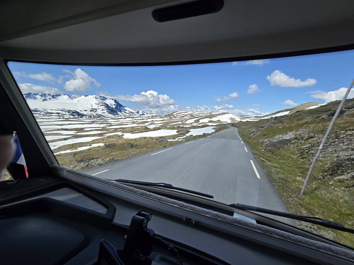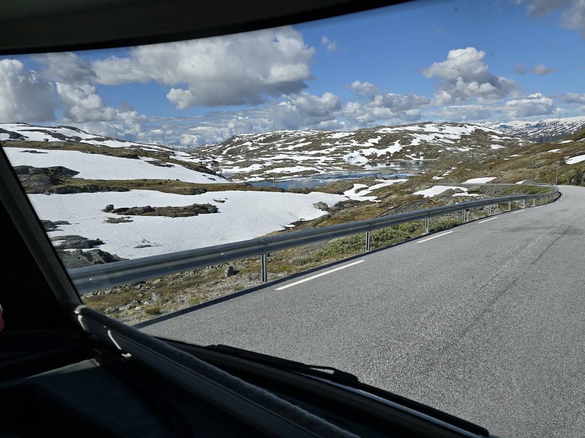 Quelques photos sur la route de Solvorn. Nous sommes sur un haut plateau d'environ 1200m d'altitude et nous cotoyons la neige. Comme partout en Norvège, nous pouvons y admirer les cascades toutes différentes et toutes plus belles les unes que les autres. Nous dormirons après Solvorn sur une aire de stationnement (Coordonnées : 61.283616, 7.164119)