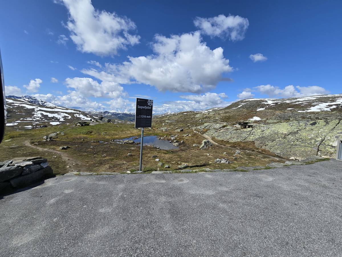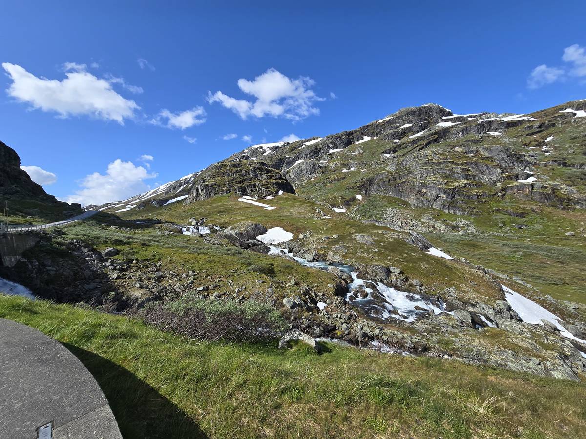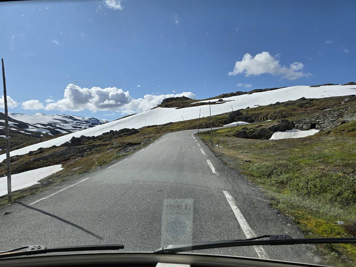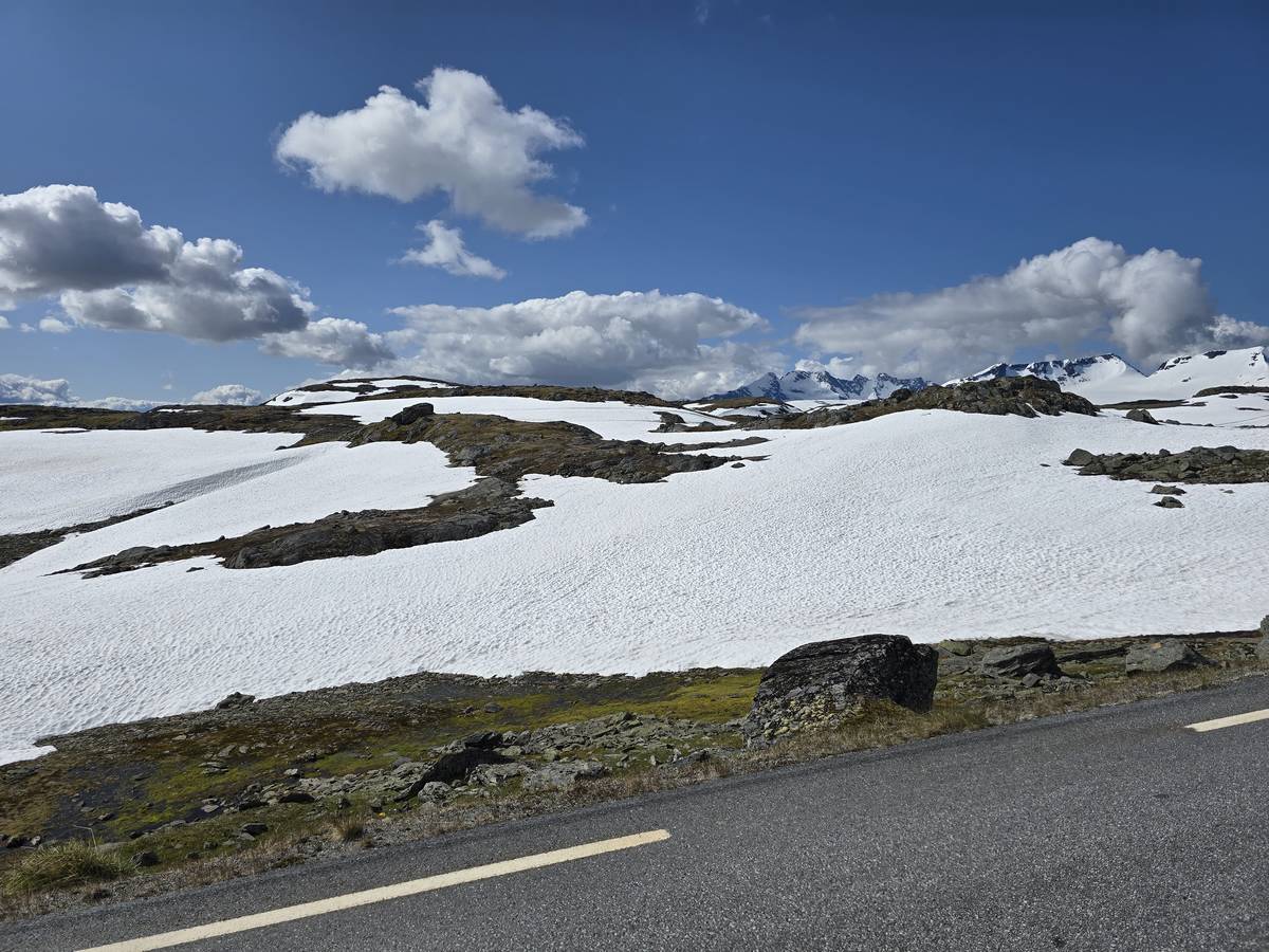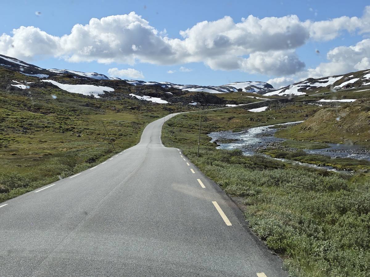 Quelques photos sur la route de Solvorn. Nous sommes sur un haut plateau d'environ 1200m d'altitude et nous cotoyons la neige. Comme partout en Norvège, nous pouvons y admirer les cascades toutes différentes et toutes plus belles les unes que les autres. Nous dormirons après Solvorn sur une aire de stationnement (Coordonnées : 61.283616, 7.164119)